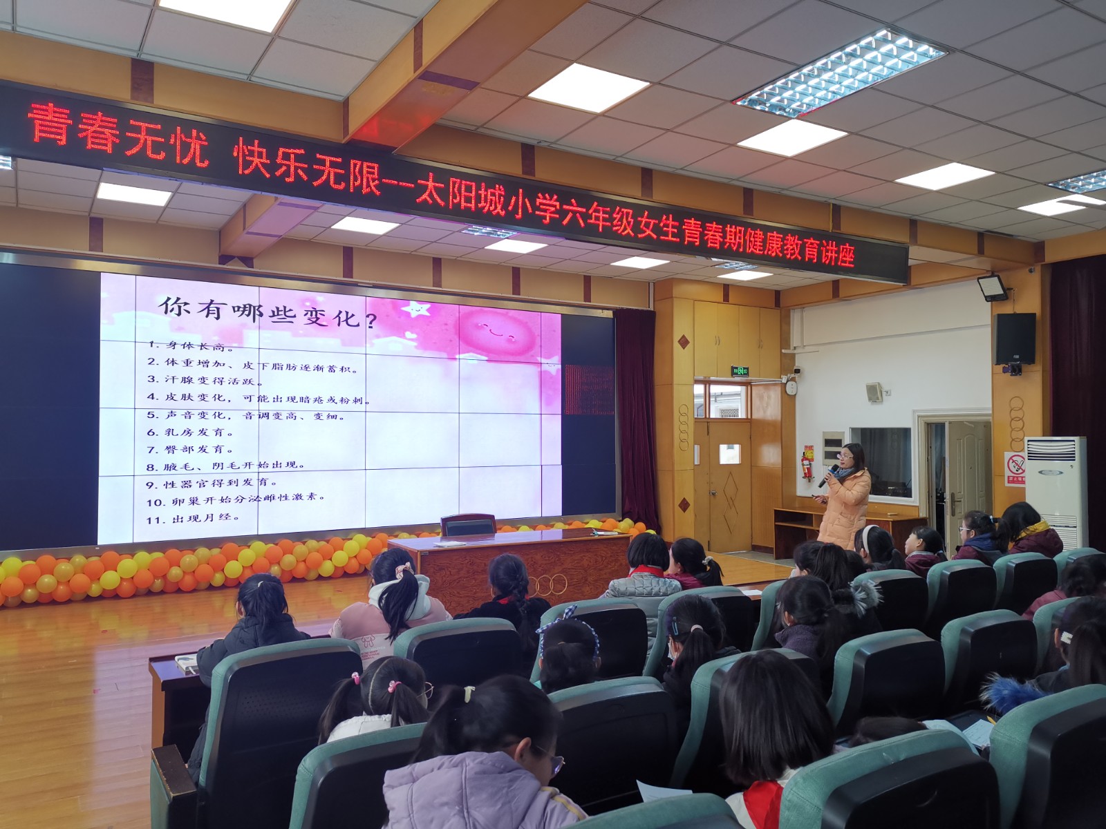 2022年2月22日中午,在太阳城小学阶梯教室举行了一场活泼温馨的六年级女生青春期健康教育讲座,主题为:“青春无忧 快乐无限”,主讲人是可亲可敬的“阳光姐姐”田宁主任。
