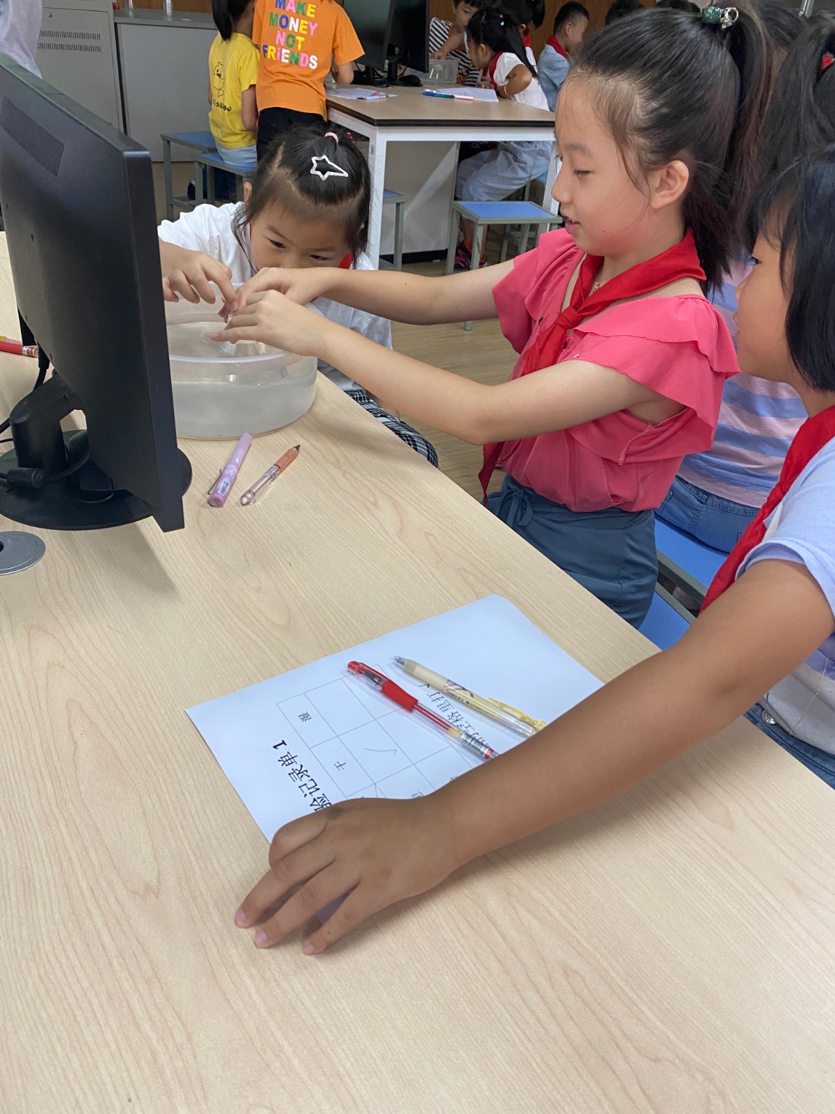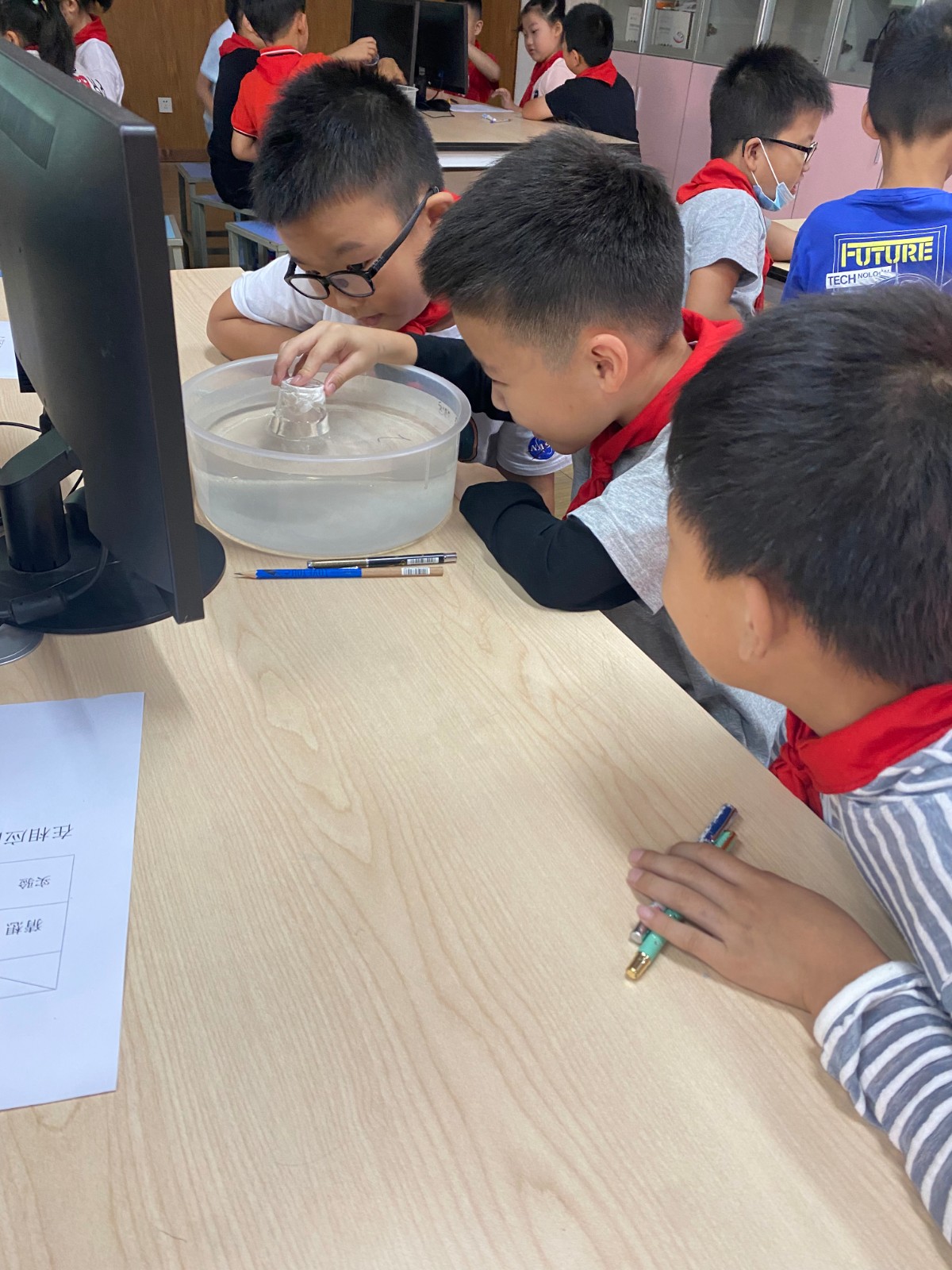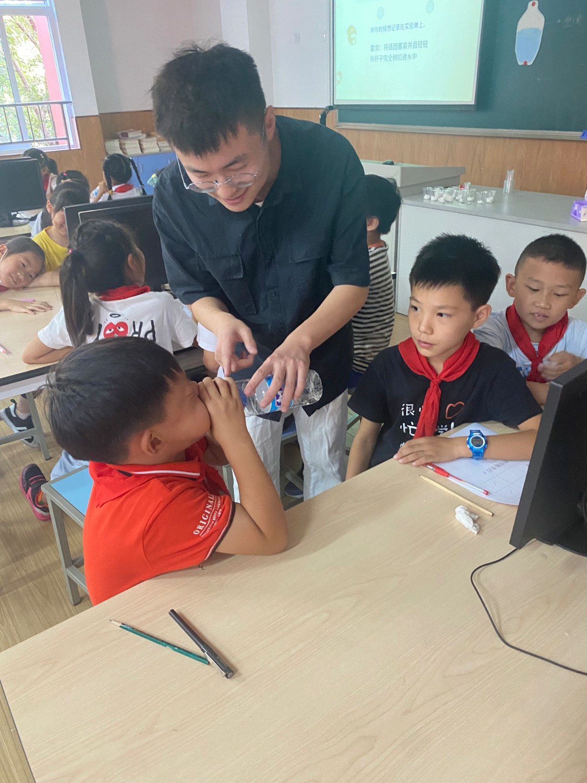 接着王老师将课堂还给学生,让学生通过两组对比实验,正反对比验证空气占据空间。在纸团变湿的实验中,在将杯子倒扣进水中,发现纸团没有湿,学生非常吃惊,产生了认知冲突,加强了对于空气占据空间的印象。同学们在实验过程中非常积极,空气看不见,摸不着。通过实验将这个抽象的过程具象化,让学生更加直观感受空气占据空间。