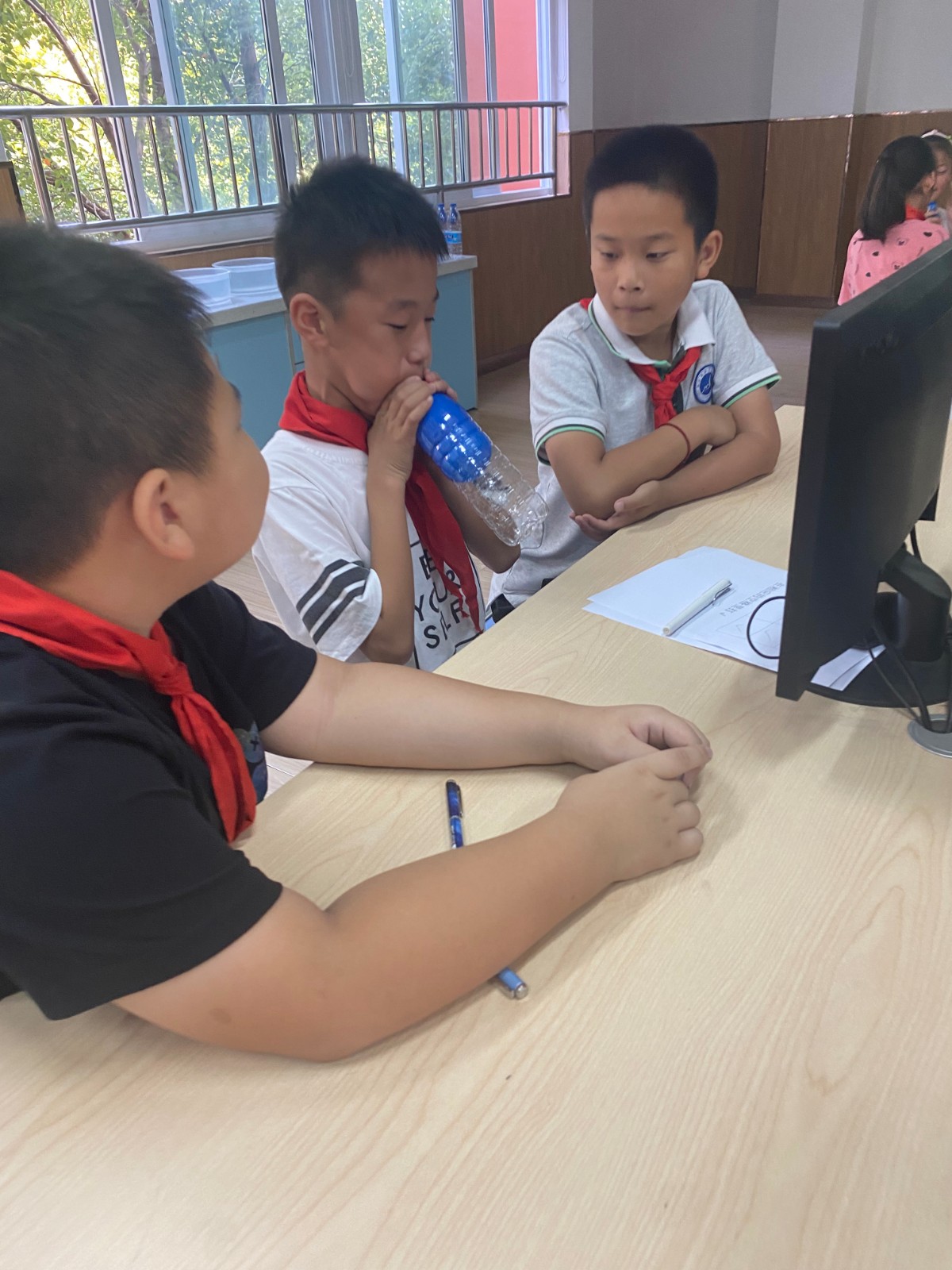最后,结合实际,全班交流一下空气占据空间在生产生活中的应用;王老师向大家发起挑战,通过所学内容,帮助小乌鸦更快地喝到水!