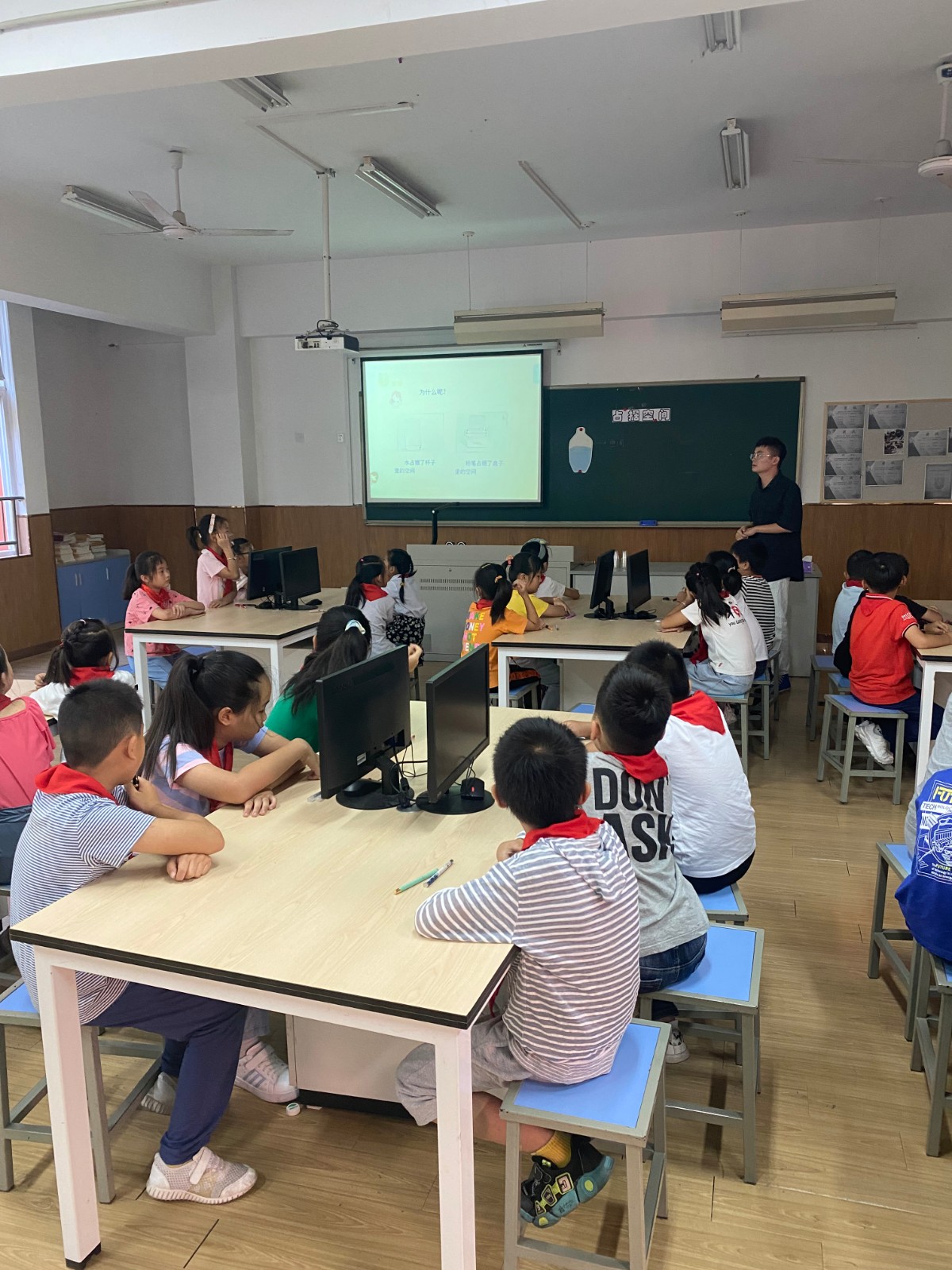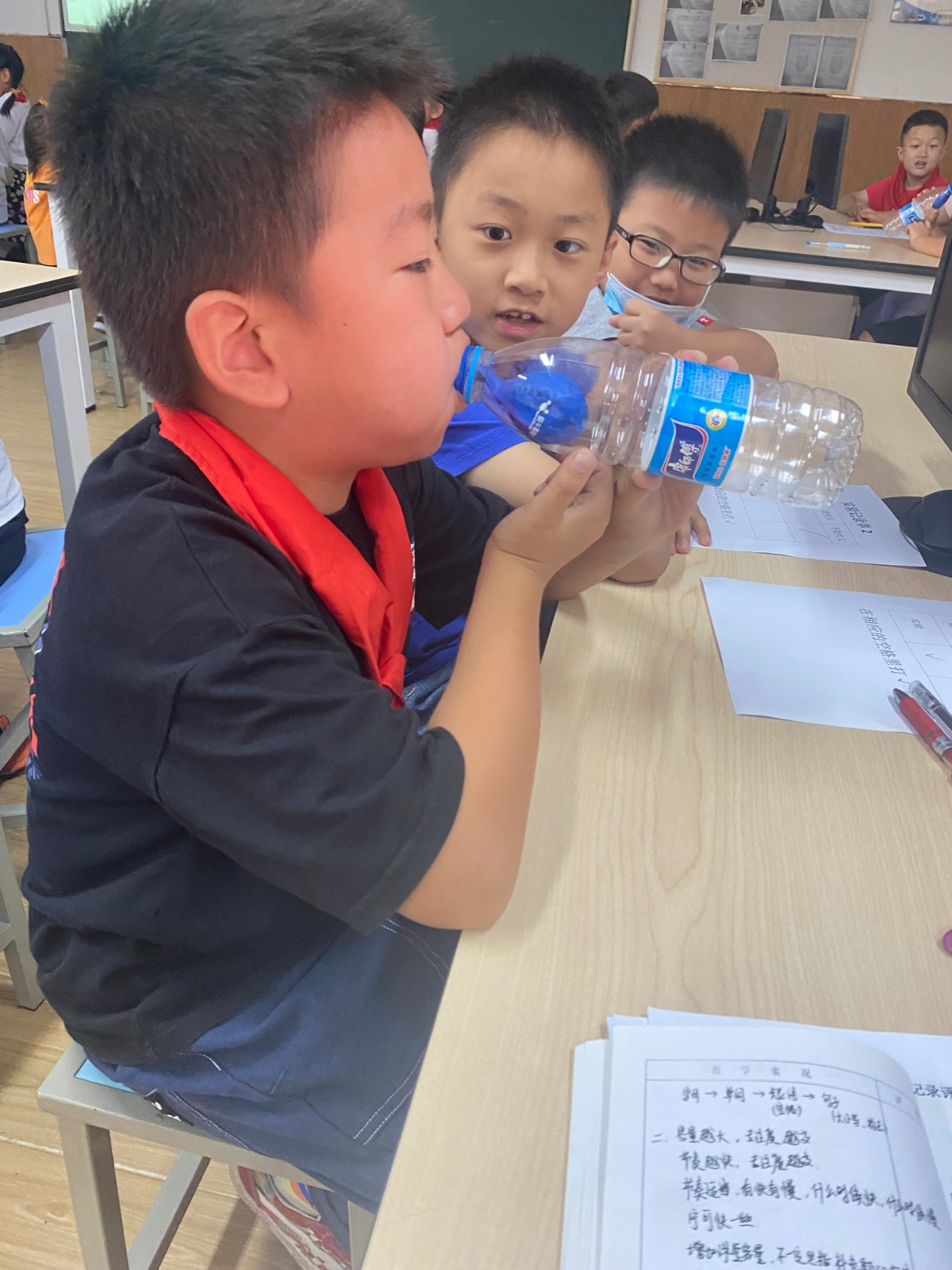 课堂伊始,王老师给大家展示了一幅好看的简笔画:一个漂亮的杯子。杯子里装满了水,水占据了杯子的空间;那么空气也能占据空间吗?王老师通过一个简单的倒水,引出空气能否占据空间这个主题。
