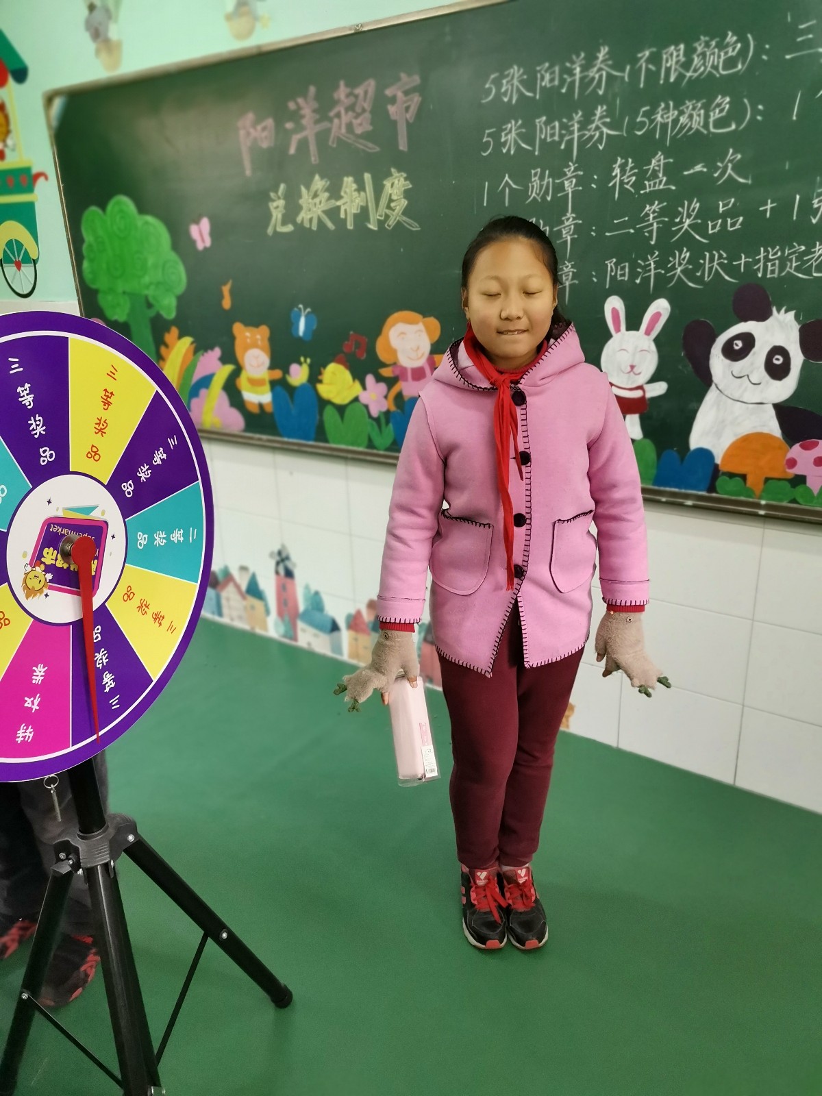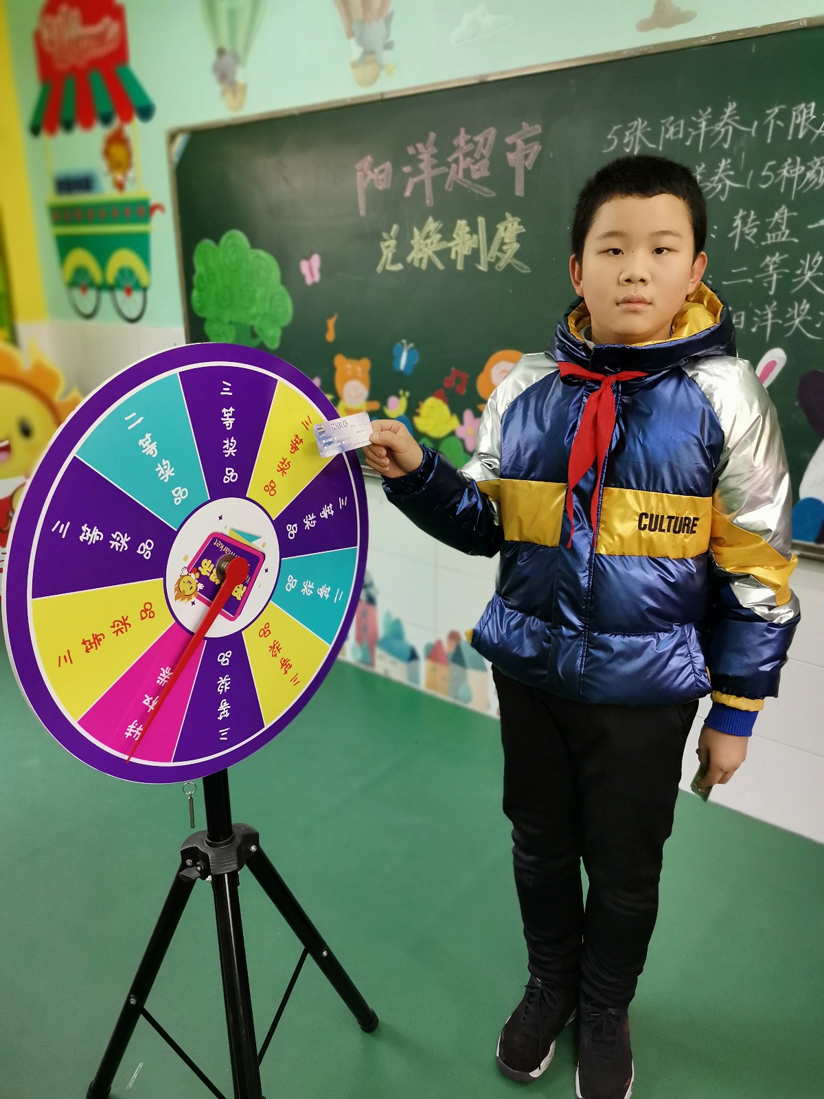 学校都被同学们激动的心情燃起来了。门口的同学们数着手里的阳洋券,一遍又一遍,如数家珍。千呼万唤始出来,在同学们期盼的目光中,“阳洋超市”开门啦!今天的阳洋超市异常火爆,临近期末,同学们拿出了珍藏一学期的阳洋券兑换阳洋勋章。同学们好像幸运女神附体一般,好几位同学抽到特权券,让我们恭喜他们!