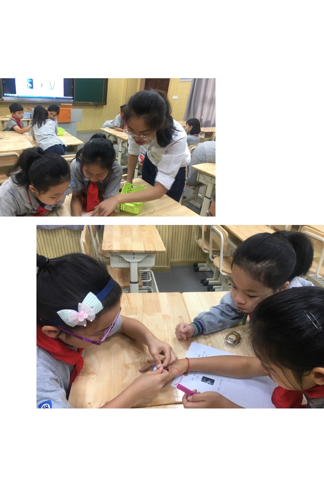 课堂伊始,伏老师通过创设情境,激发孩子们探索的兴趣。伏老师出示会发光的小灯泡的图片,向小朋友们提问:如果想让小灯泡亮起来,需要哪些材料呢?随后伏老师为小朋友们做了演示,小朋友们不仅知道了可以点亮小灯泡的材料,并且通过自主探究与合作,找到了导线与电池两极的连接点,通过自己亲自动手操作实施,成功让小灯泡亮了起来。整节课学生学习积极性很高,师生之间互动效果良好,课堂气氛活跃。同学们在快乐的学习氛围中得到了发展和提高。