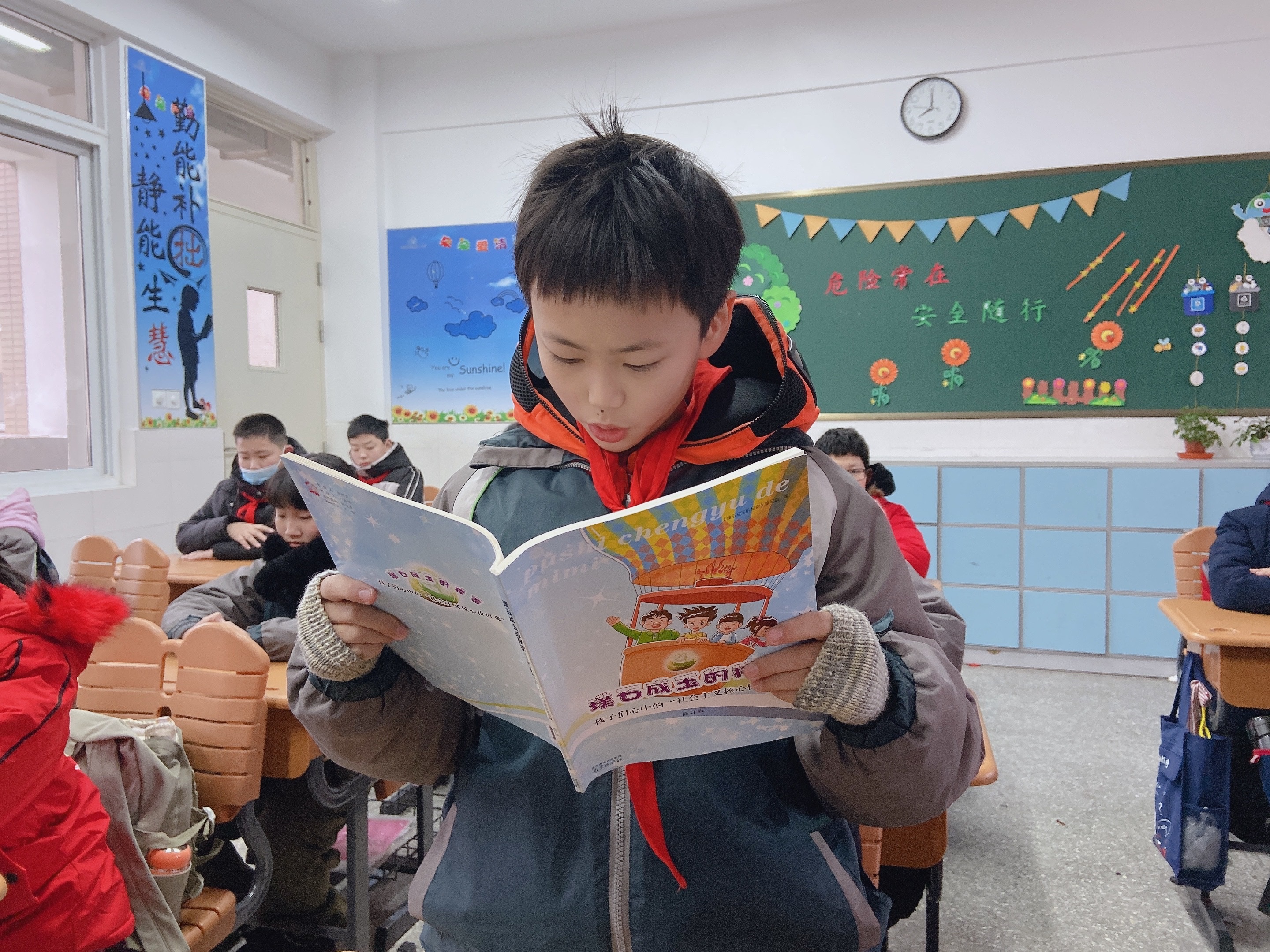晨会课上,孩子们阅读了《璞石成玉的秘密》,了解到“爱国”是中华民族的优良传统美德,是全国各族人民共同的精神支柱。 在孩提时期,老师把祖国的尊严,民族的气节,祖辈的光荣历史,随着教学沁入幼儿稚嫩的心田里,必然会留下不可磨灭的痕迹,并发生深远的影响,犹如把种子播到田地,会萌发、发根一般。他们长大后,爱国主义的思想感情就会成为青少年的精神支柱,他们的道德情感、个性品质,都会随之得到健康的发展。