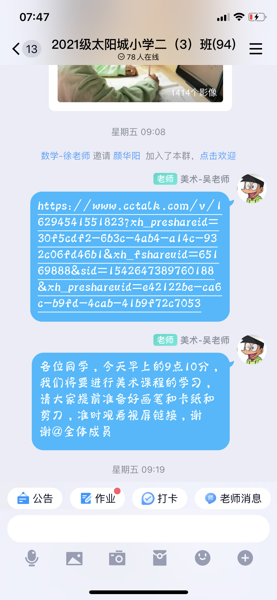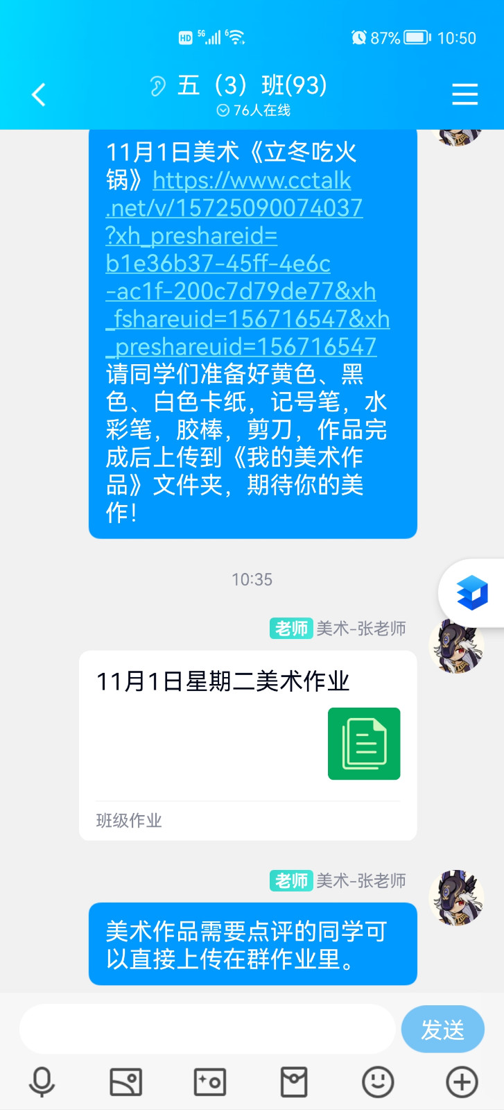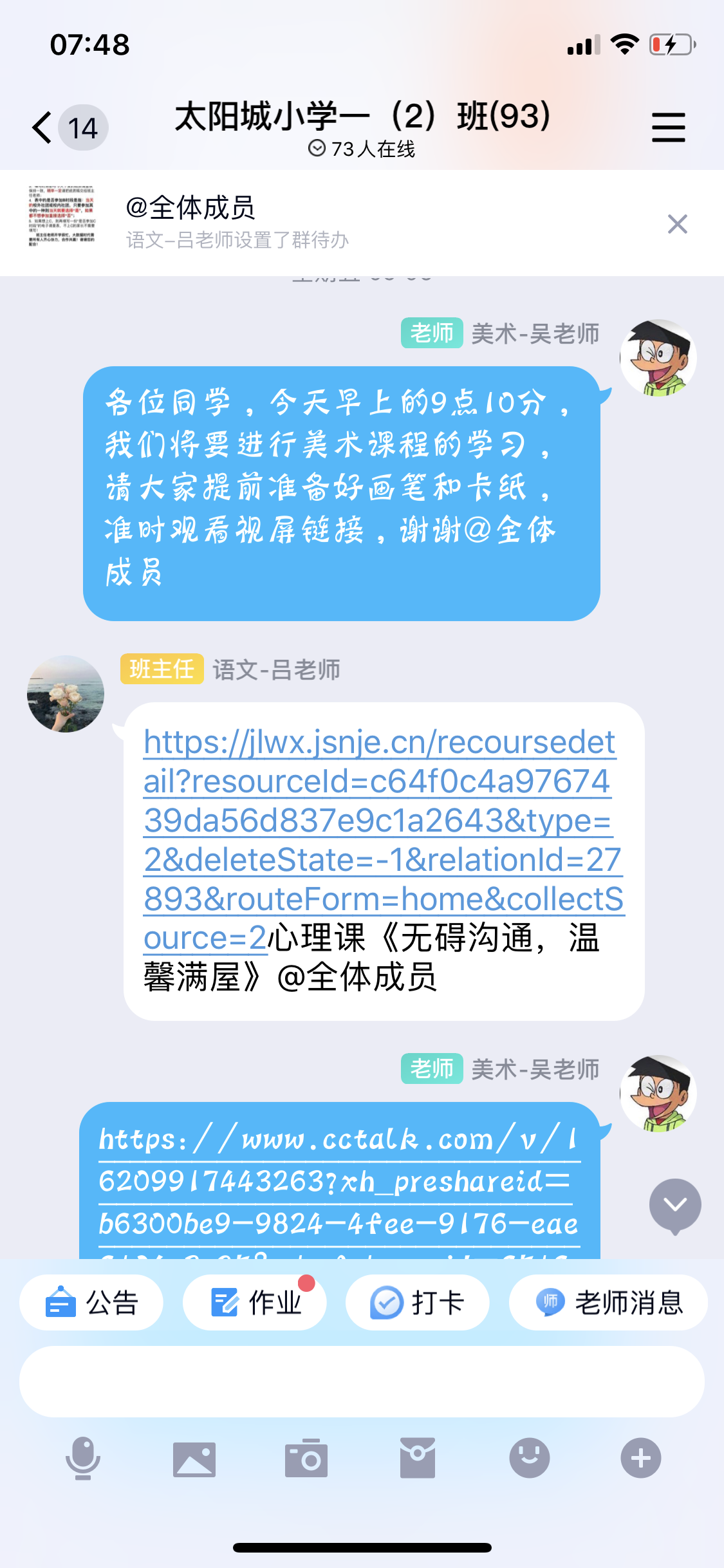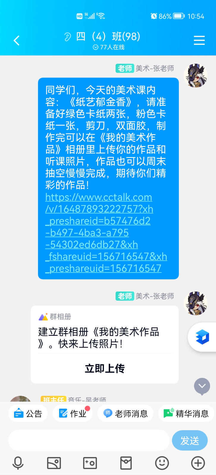根据区教研室下发的教学资源,老师们精选出各种形式适合学生学习的优质教学资源,为线上教学做好充足的准备。当日上课之前,老师也会在群中发布即将开课的温馨小提示。学生只需点开每日课表中的课程链接,就可以足不出户学美术。