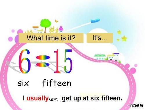 王璐老师利用游戏方式,快速呈现各类数字,学生迅速反应并大声说出对应英文。温习完数字,游戏进入下一个高潮。王老师分别呈现了6和15,学生快速反应说出six和fifteen,当老师在中间加上一个“:”,并问学生“What’s this? What time is it?”学生快速反应并回答“It’s six fifteen!”,然而时间在我们生活当中,我们一定会有对应的生活活动,于是王璐老师趁热打铁问学生“What do you usually do at six fifteen?”一个问句,引出了我们的新授词汇“usually”,并带学生畅聊我们的日常简单的活动。