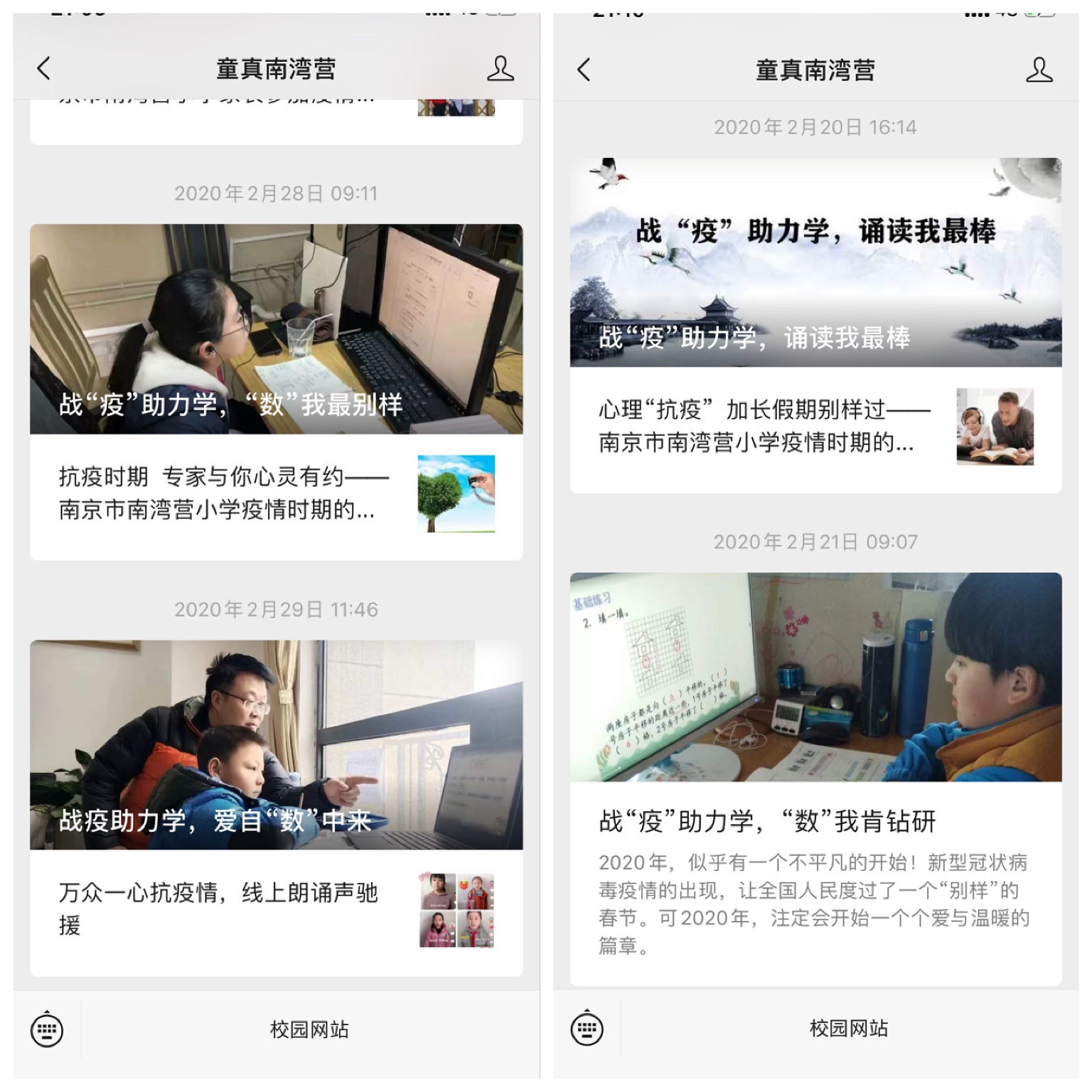 学校童真南湾营公众号,每日都会推送“战‘疫’助力学”系列,虽然病毒让我们拉开了距离,但是每日的温馨报道却让南湾营全体师生和家长们心连心、情系情。