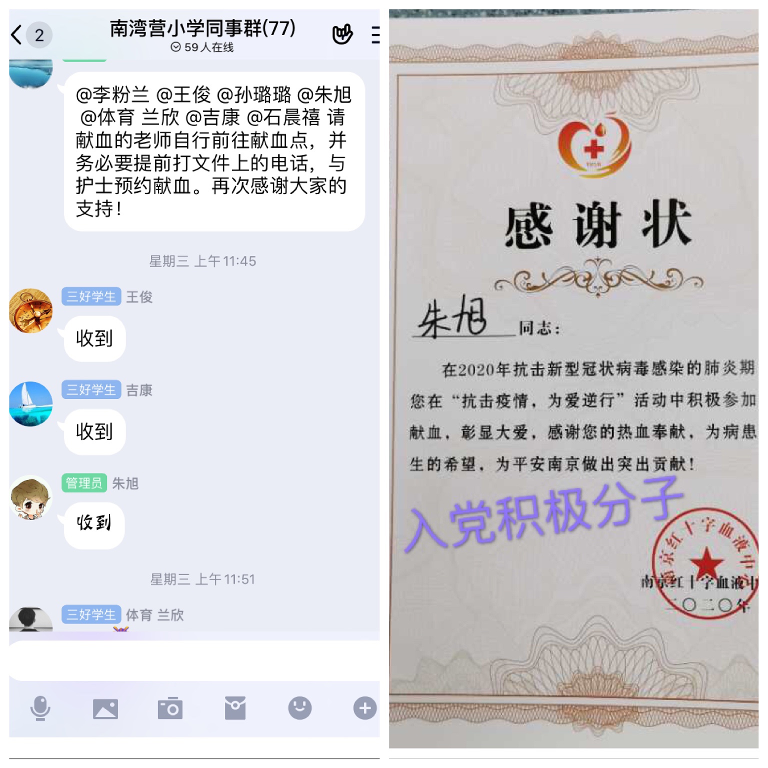 为响应市区卫生健康委员会的号召,充分发挥党员干部带头和党员先锋模范作用,我校党员老师和入党积极分子挺身而出,体现了党员和入党积极分子的大局意识与责任意识。