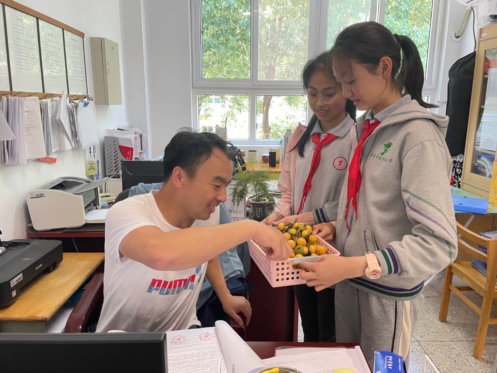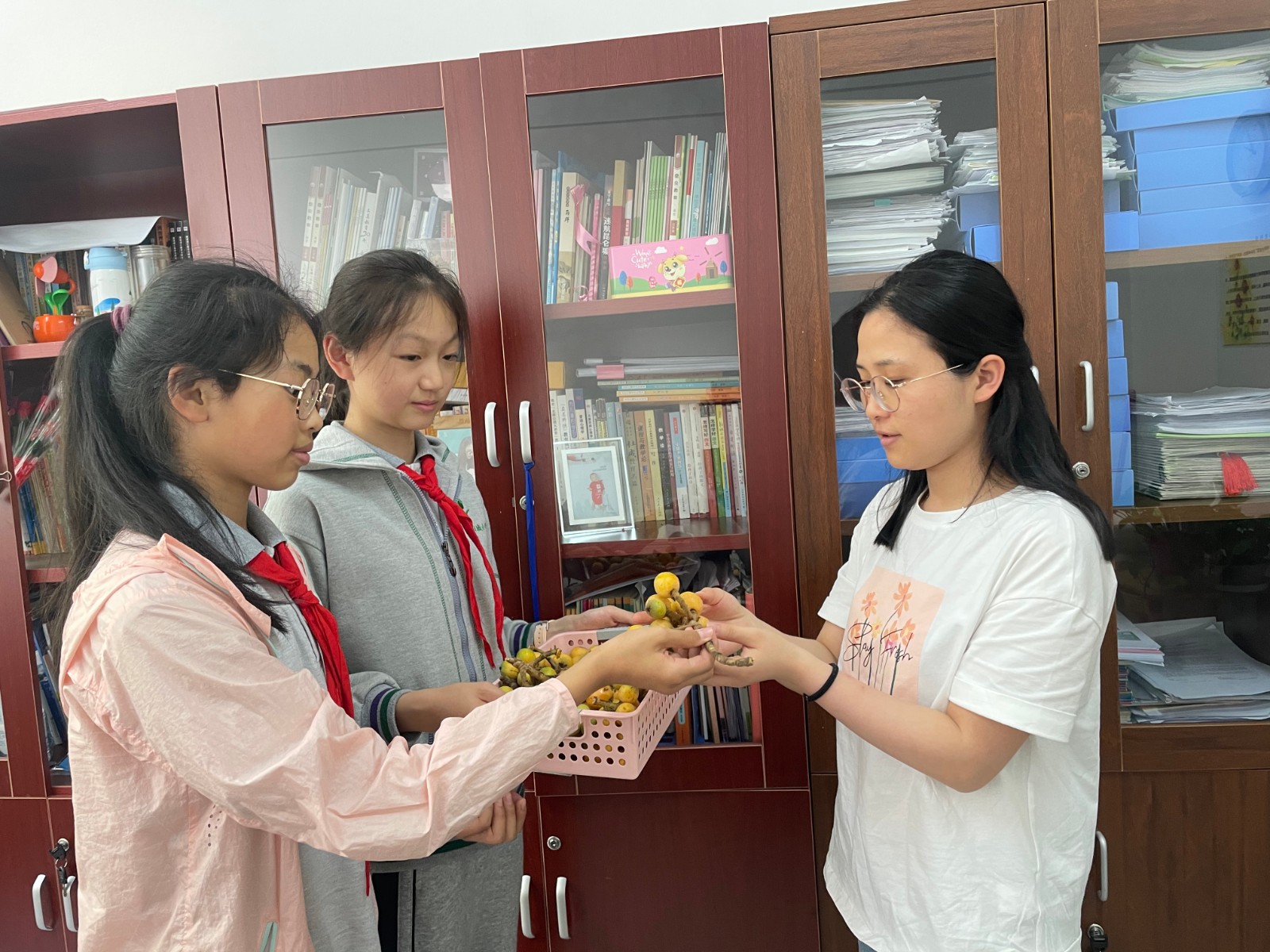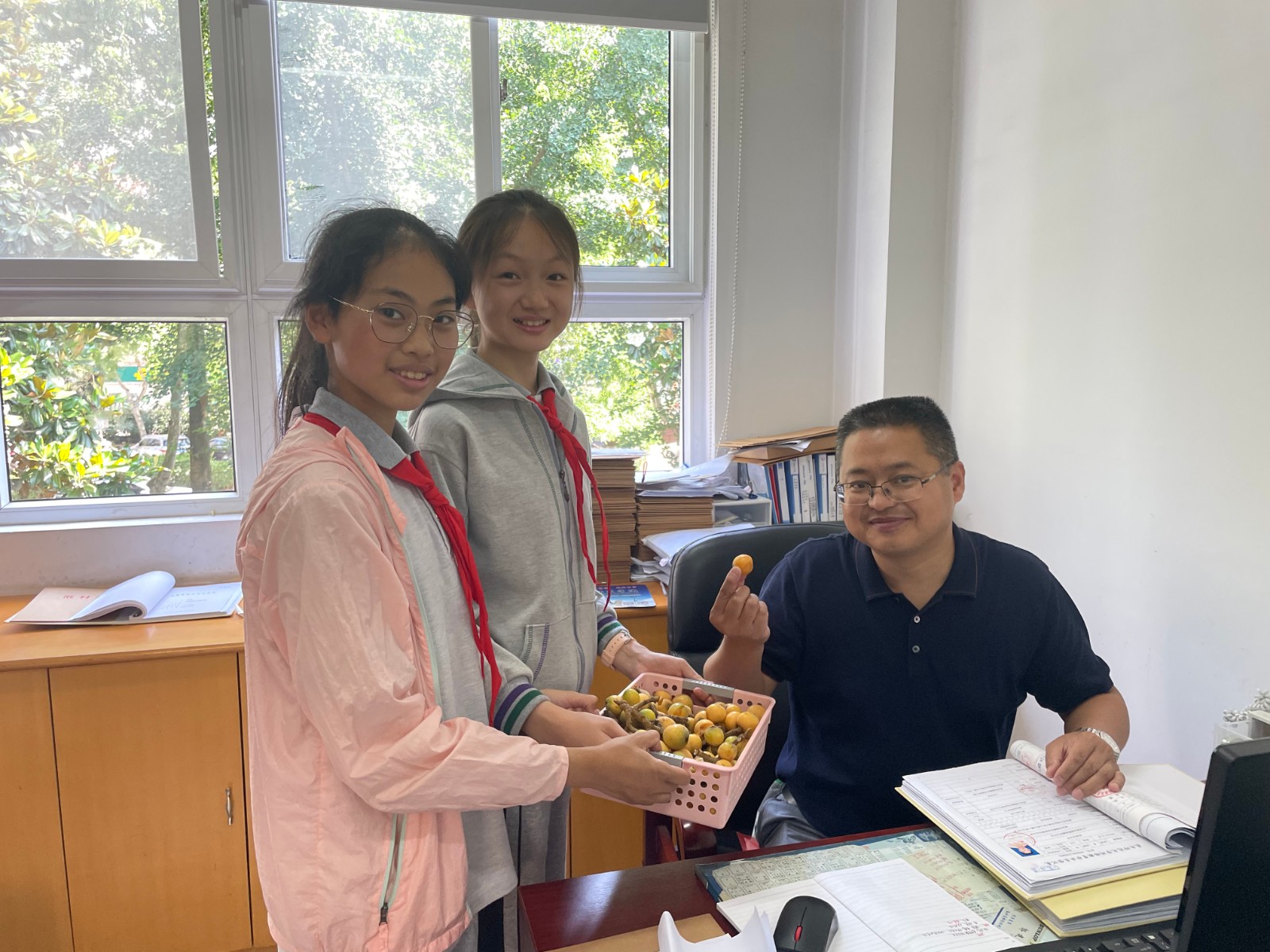 同学们将所摘枇杷分到了六年级四个班,还将一部分送给老师们,共同品尝美味的枇杷,分享收获的快乐!