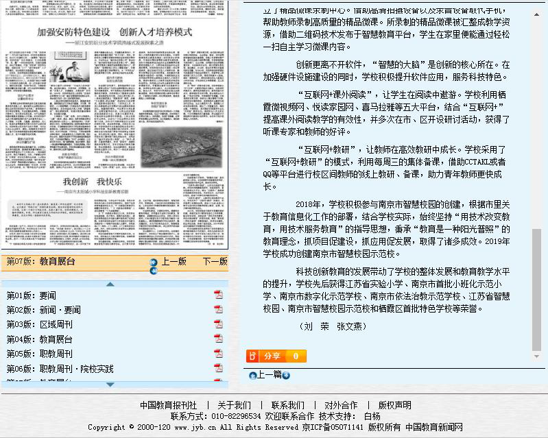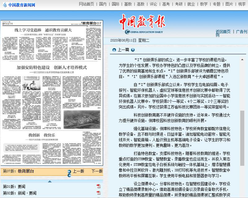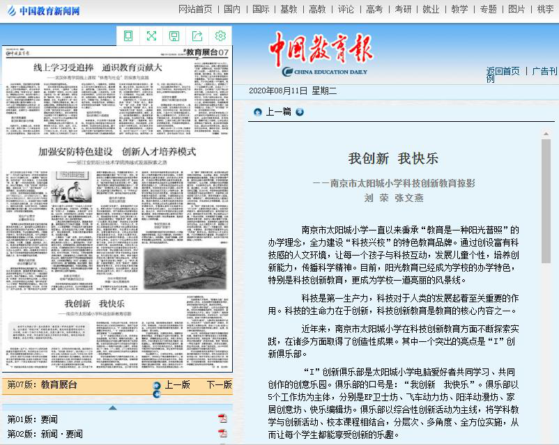 2020年8月11日,《中国教育报》刊登了我校以《 我创新 我快乐——南京太阳城小学科技创新教育掠影》为主题的特色教育专题报道。这是我校自实施“科技兴校”特色教育以来在国家级报刊上大篇幅刊登,是我校在“教育是一种阳光普照”办学理念下开展科技创新教育成果的一次集中展示。