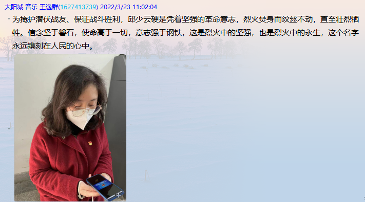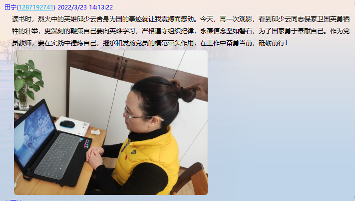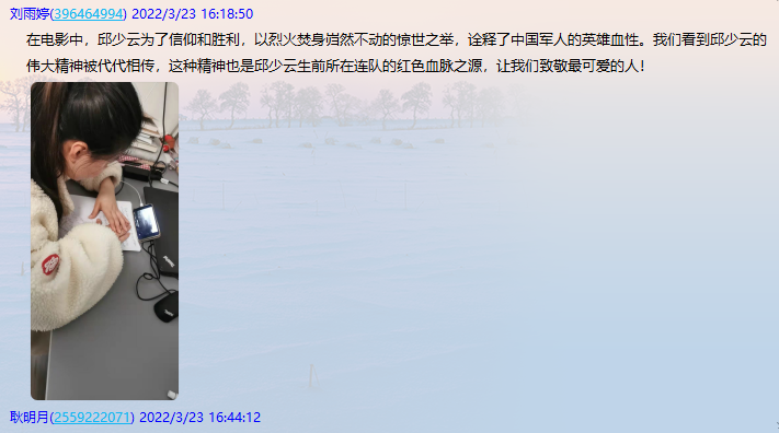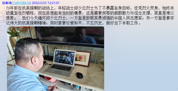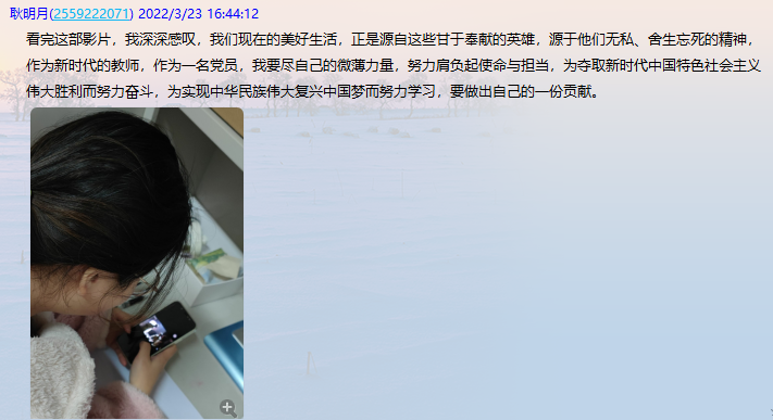 观影过程中,全体党员激动万分,被跌宕起伏的故事情节所吸引,感受了志愿军的血性和为了国家、民族不惜牺牲自我生命的忘我精神。 大家也纷纷在太阳城中心校党支部群里留下了自己的观后感言。