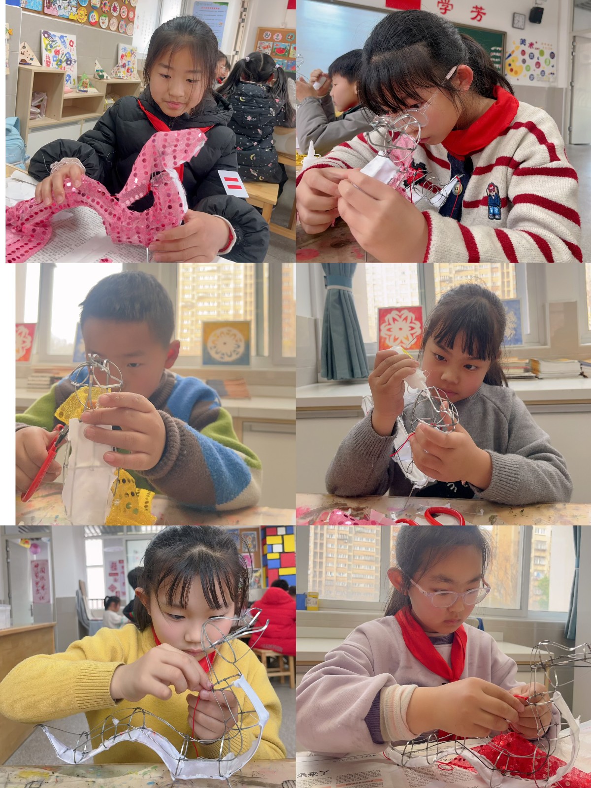 随后,学生们纷纷动手制作。裁剪、粘贴、装饰……大家忙得不亦乐乎。他们小心翼翼地将亮片布料剪裁成合适形状,再精心粘贴到蛇形骨架上。在制作过程中,有的同学遇到难题,老师和身边同学立刻伸出援手,互相交流探讨,现场氛围热烈而温馨。