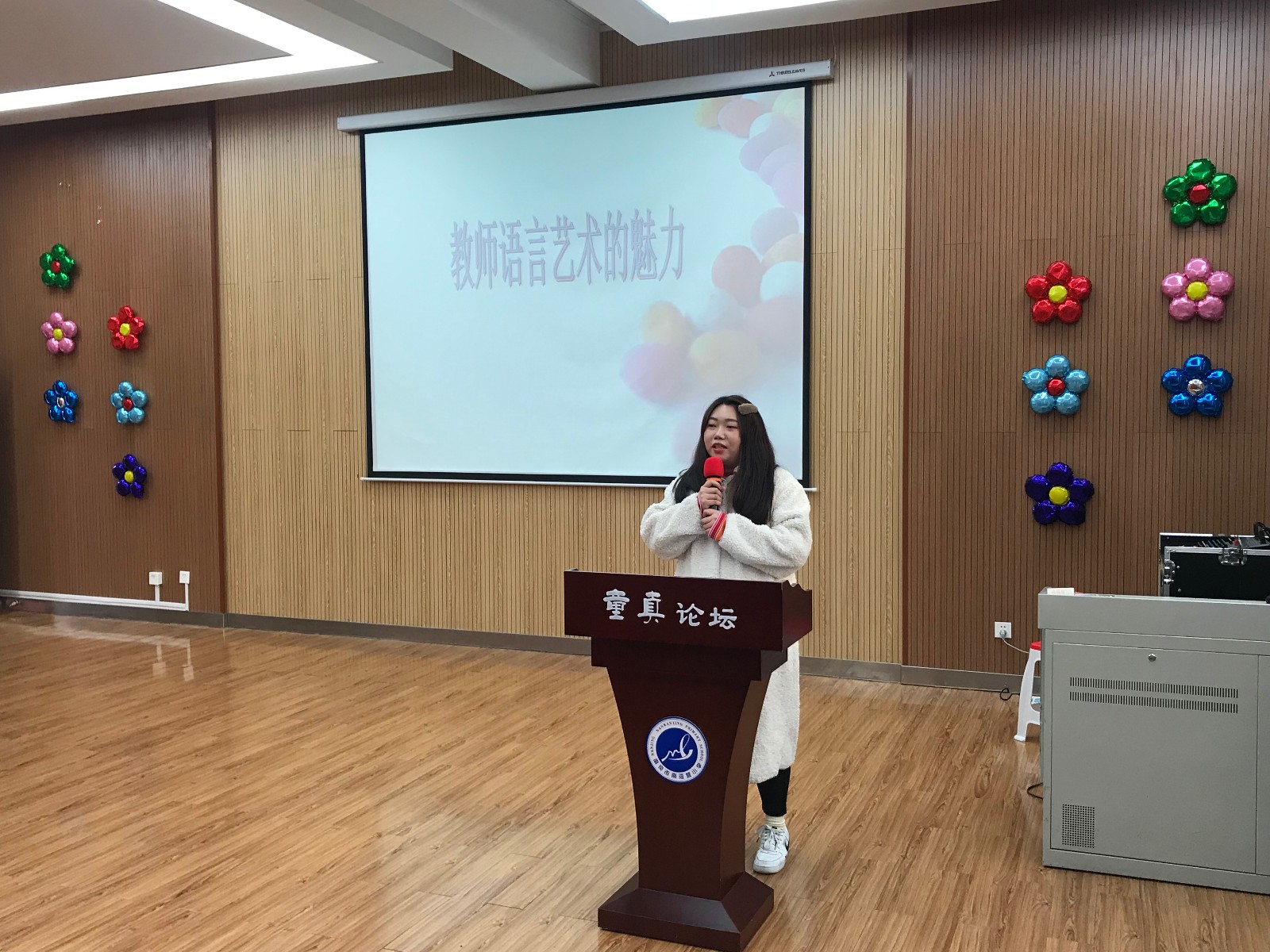 本次童真论坛的主讲人是张悦老师,张老师就语言艺术的魅力,讲述了她与张惜春老师在搭班过程中的体会与感悟。张惜春老师是一名经验丰富的班主任,在对学生教育管理上很有方法,对于青年教师也很关心,并给予帮助。张悦老师提到,张惜春老师不会大声训斥学生,而是通过诱导性语言让学生自己发现自己的不足,温柔中充满着让人信服的力量,让比较调皮的学生在她的教导下也变得比之前懂事了。张悦老师因此意识到语言真的可以影响一个人,它同样也反映了一个人的修养,所以教师要掌握并应用语言这门艺术,必须树立“以人为本”的思想,尊重学生、理解学生、宽容学生。
