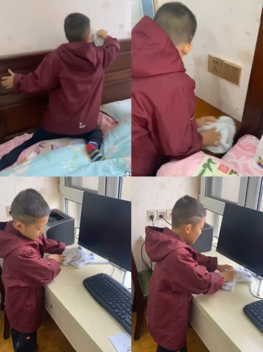 清洁卧室不仅能丰富同学们的寒假居家学习生活,还培养同学们的动手能力和劳动素养。低年级的学生积极完成卧室的清洁,熟练地使用笤帚、拖布、抹布等工具,正确的进行垃圾分类。让我们一起来看看孩子们的劳动时的美好瞬间吧!