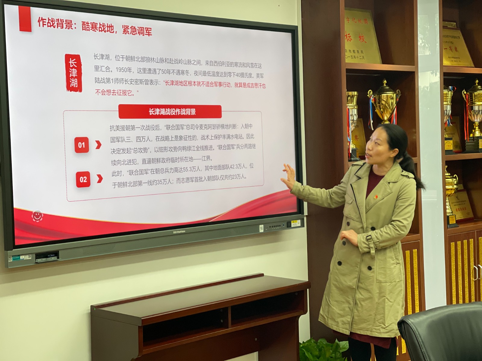 秋风起,秋叶落。10月20日,南湾营小学党支部全体党员齐聚三楼会议室展开了本月的宣讲学习。本次宣讲主题为“冰血长津湖——抗美援朝战争第二次战役的收官之战”,由张春梅同志主讲。
