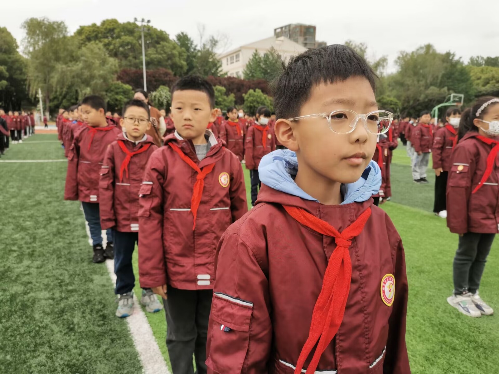 全体少先队员伴随着庄严的《义勇军进行曲》向着国旗敬队礼,全体教师行注目礼。嘹亮的国歌声顿时响彻整个校园。