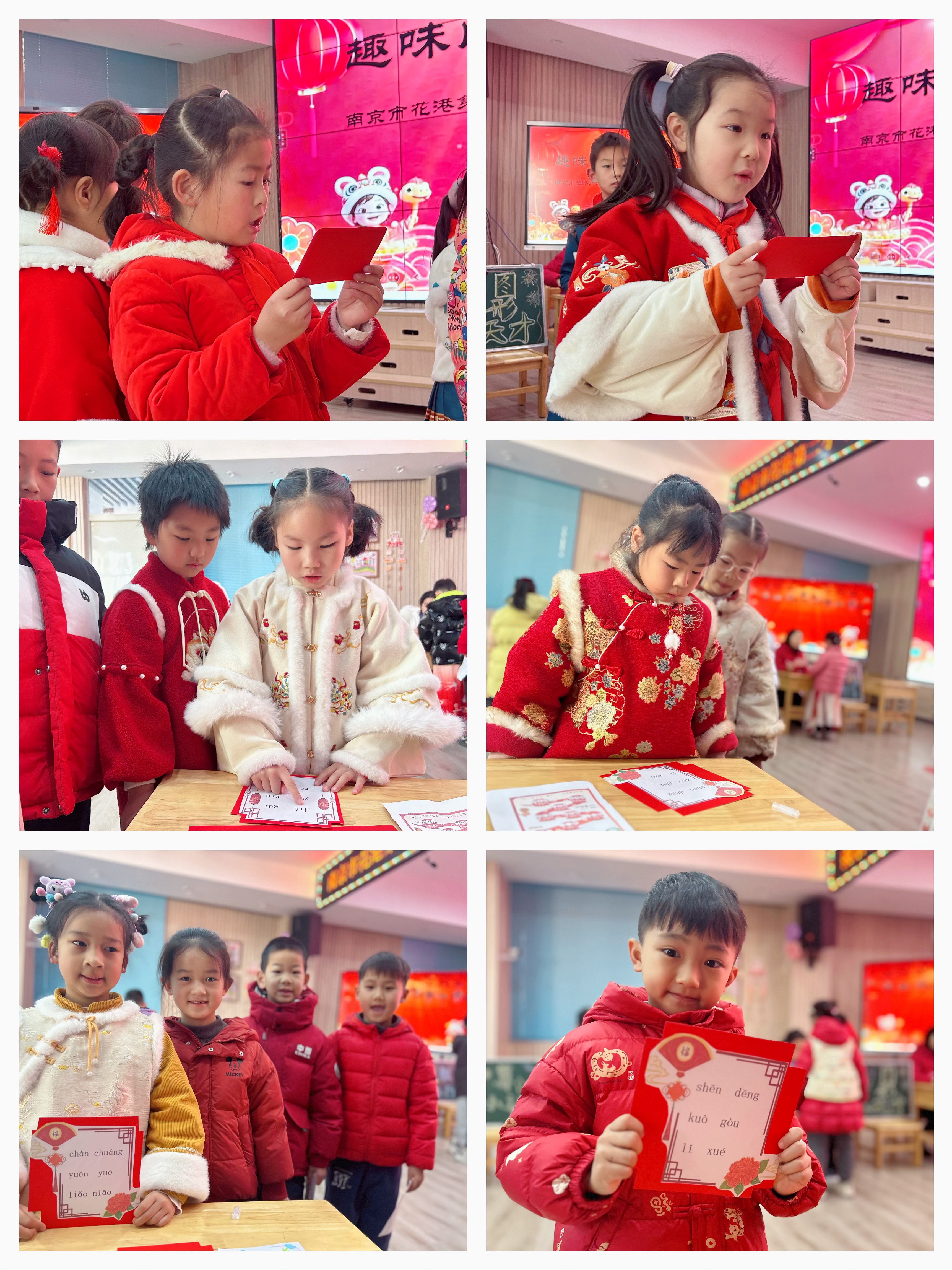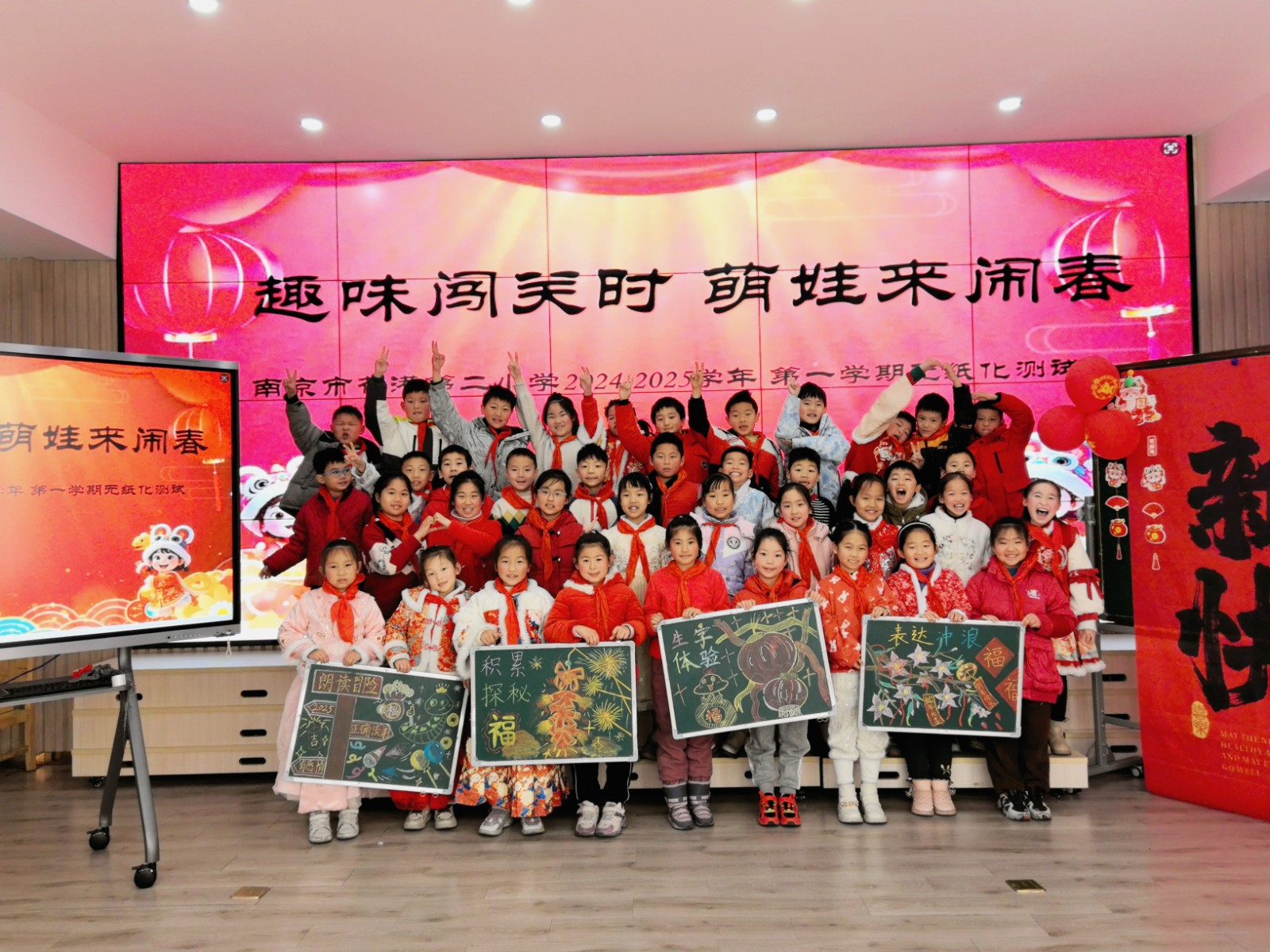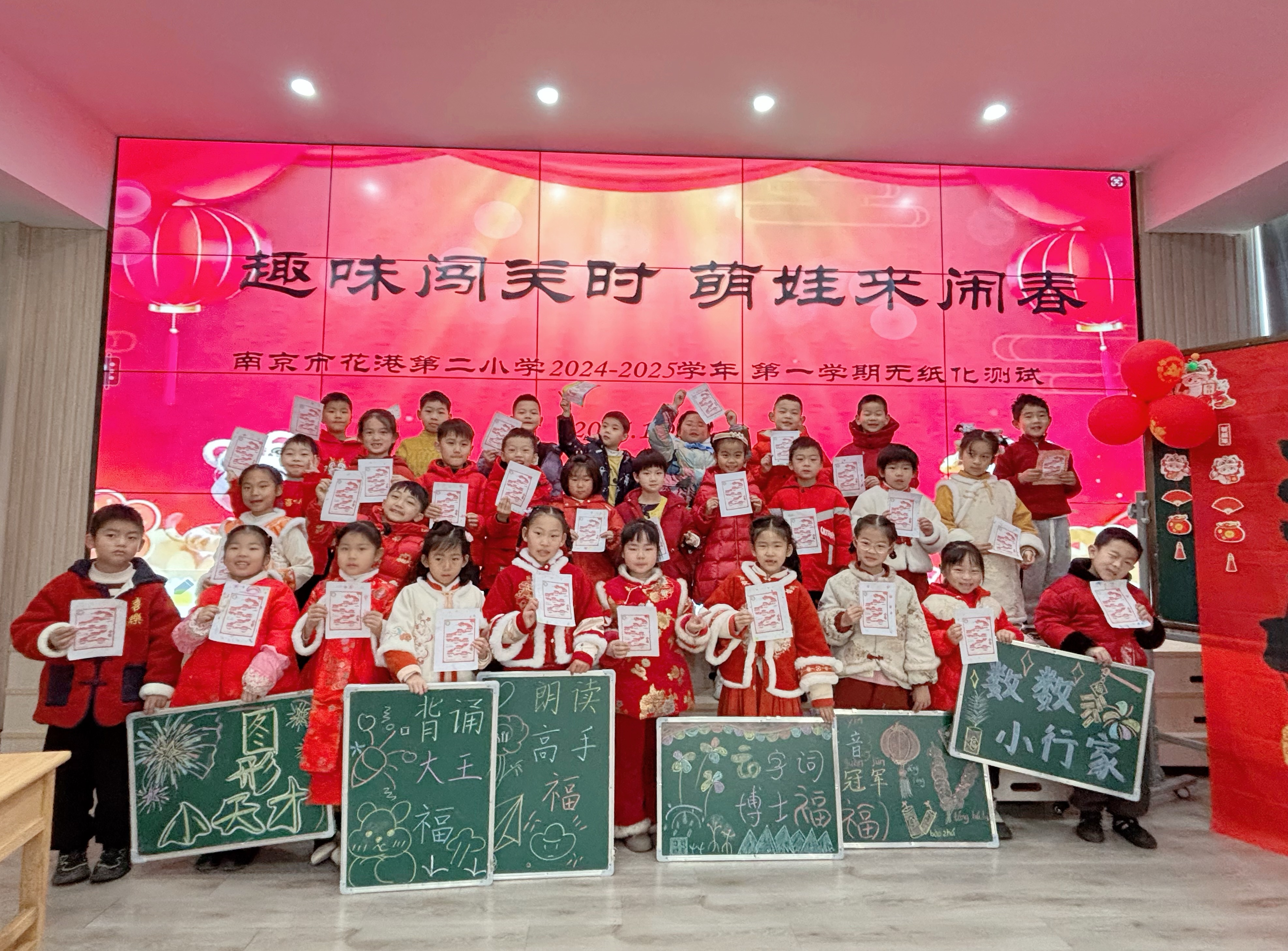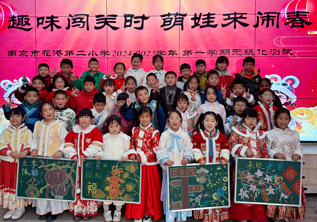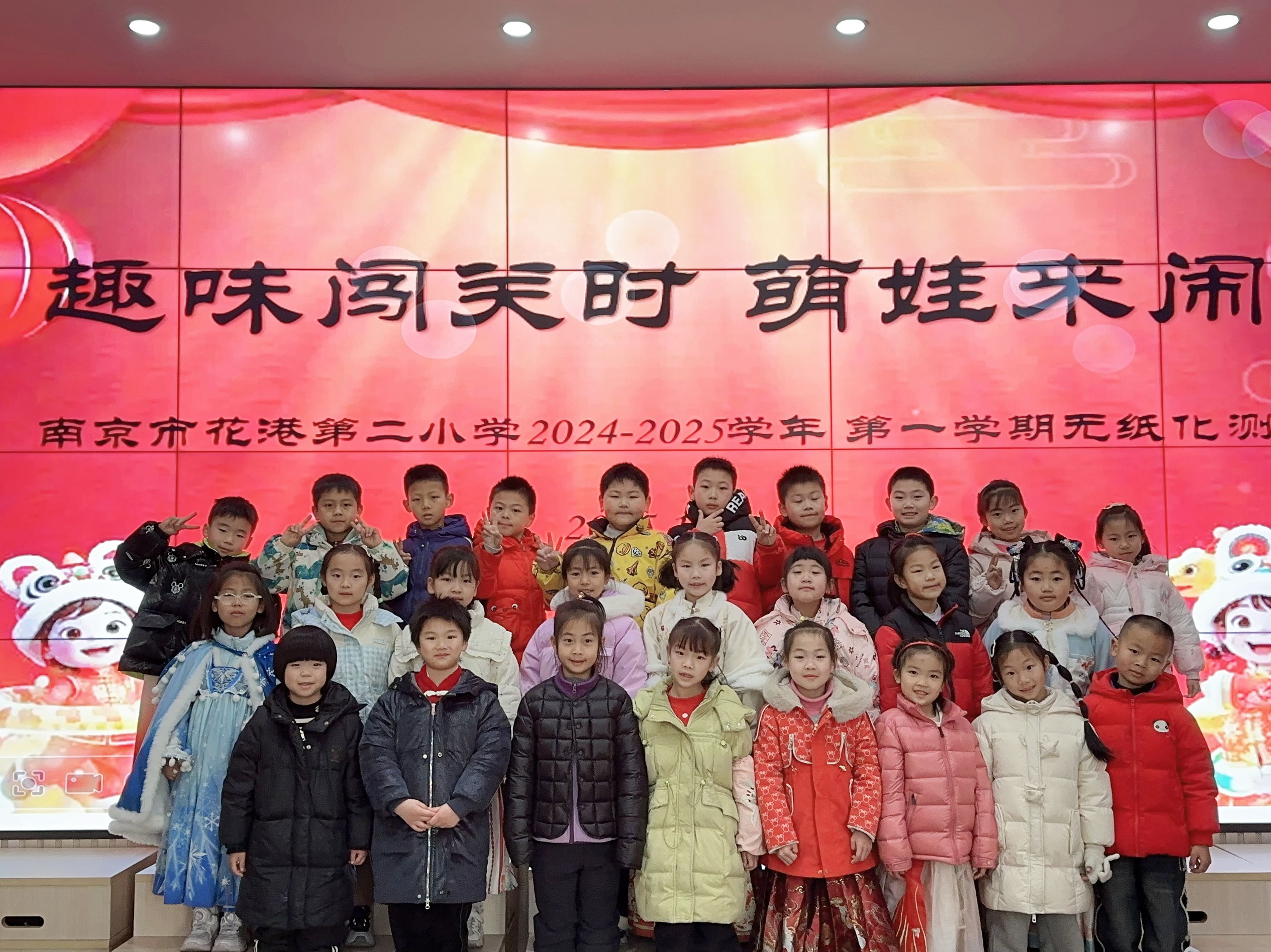 2025年1月9日上午,南京市花港第二小学报告厅内张灯结彩,洋溢着欢快的节日氛围,一、二年级正热火朝天地举行以“趣味闯关 萌娃闹春”为主题的无纸化测试活动,为孩子们打造了一个轻松愉悦的期末知识检验平台。