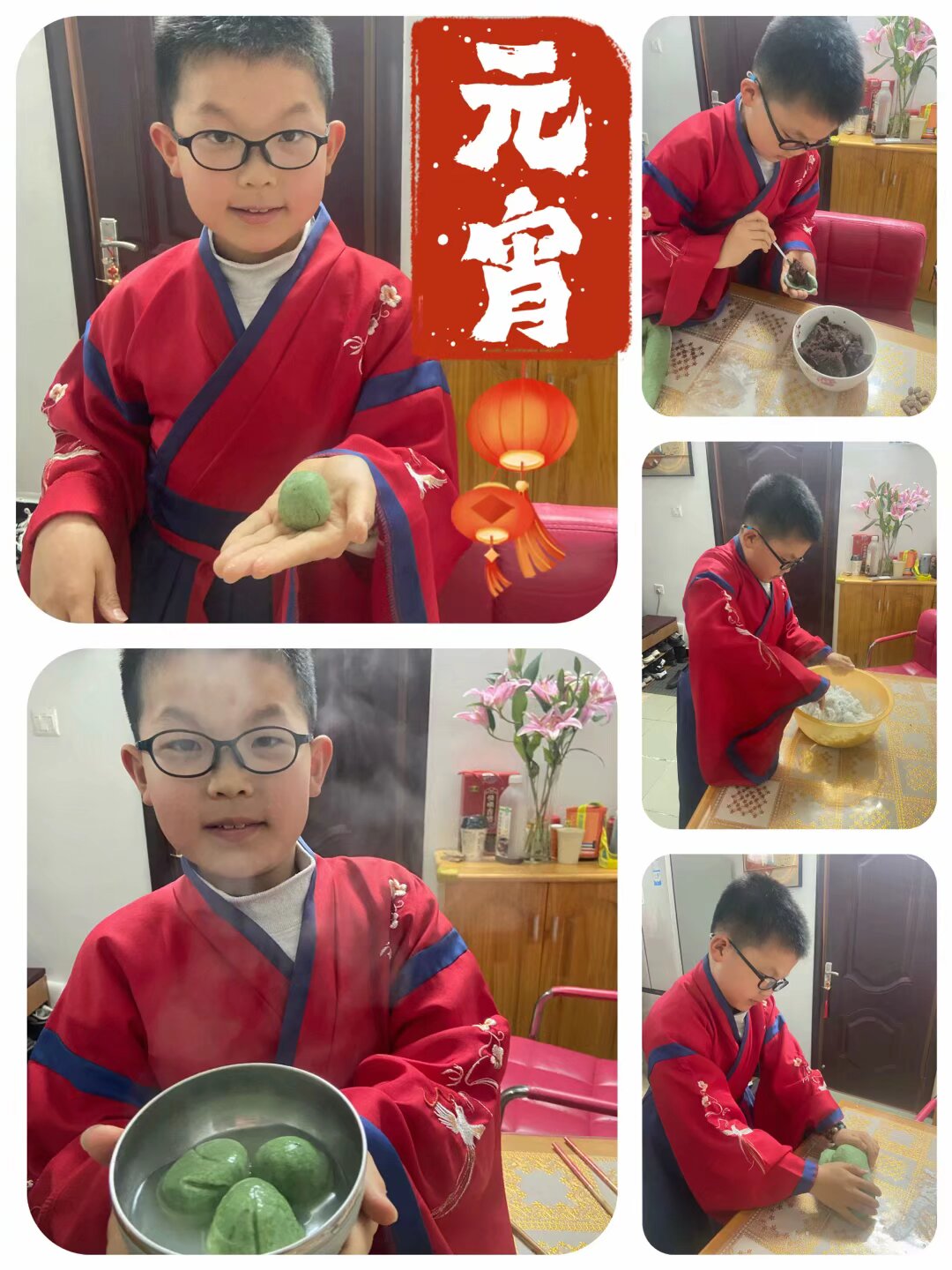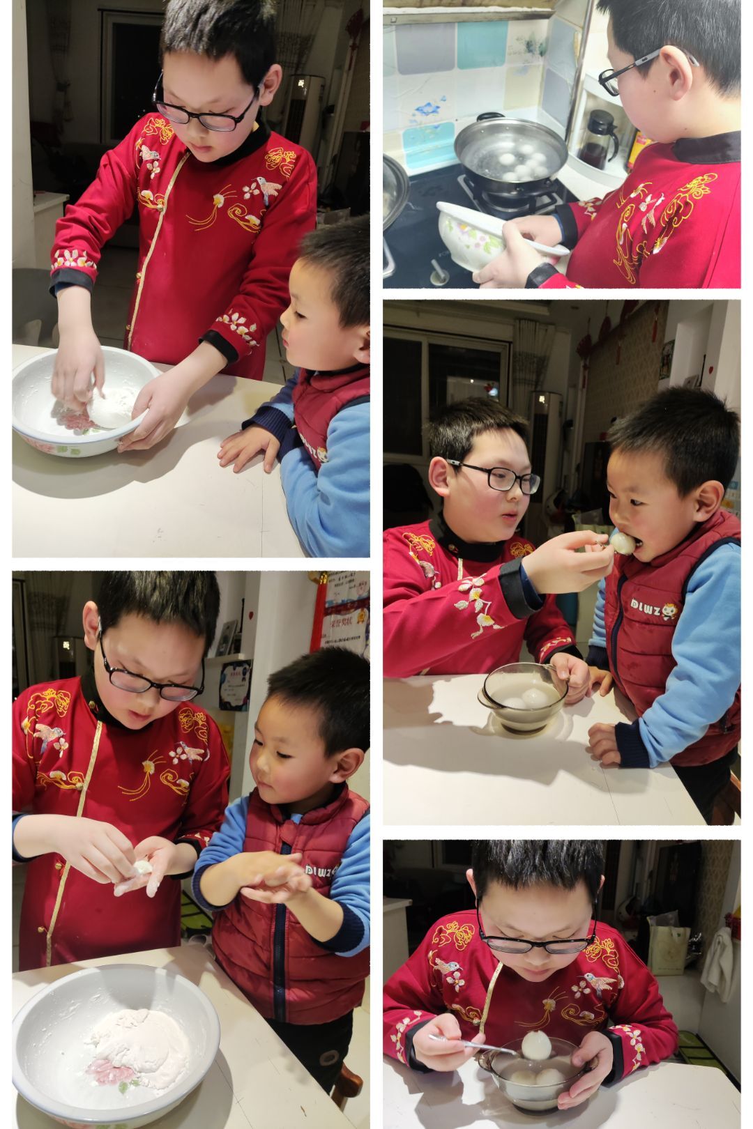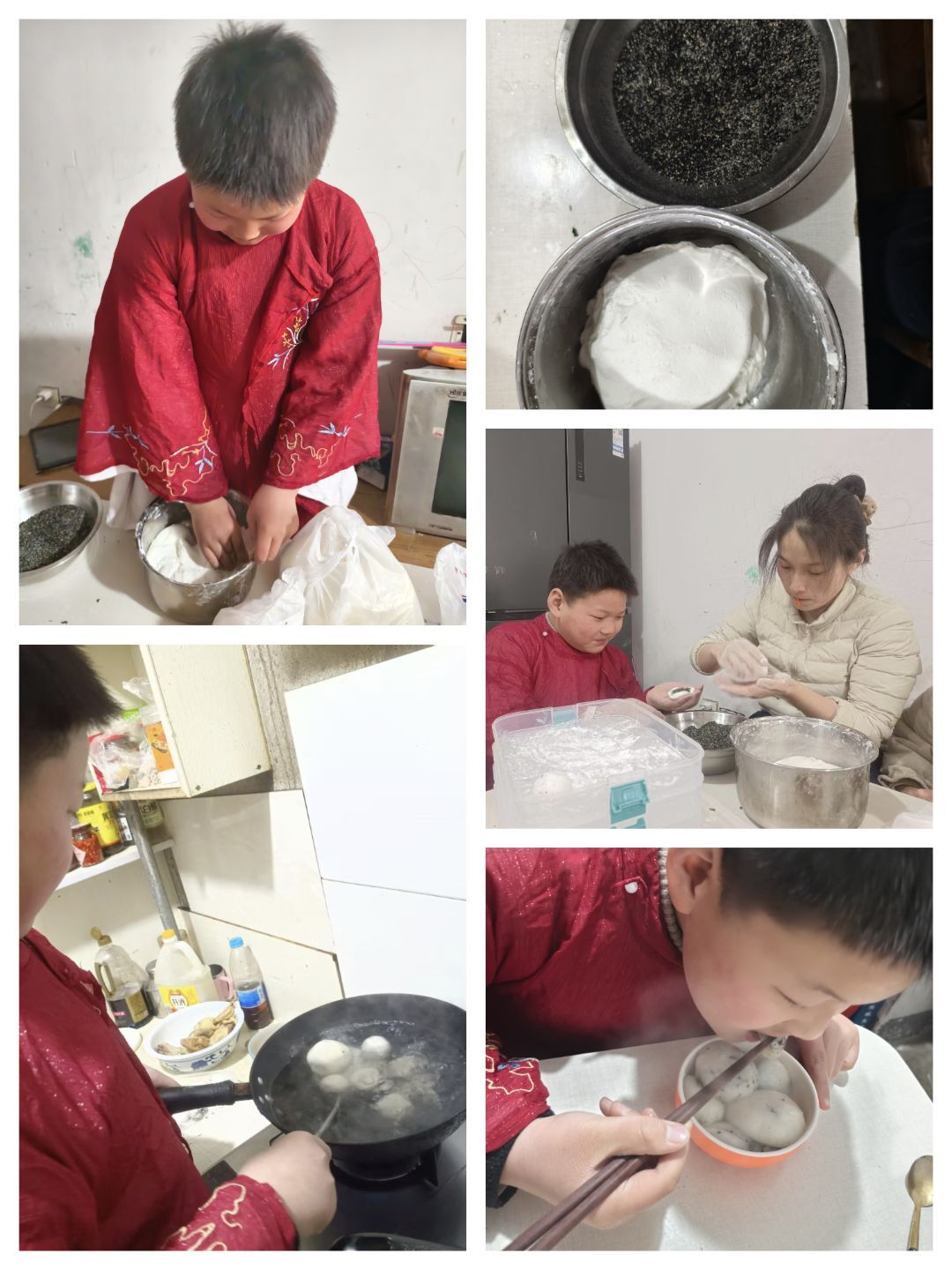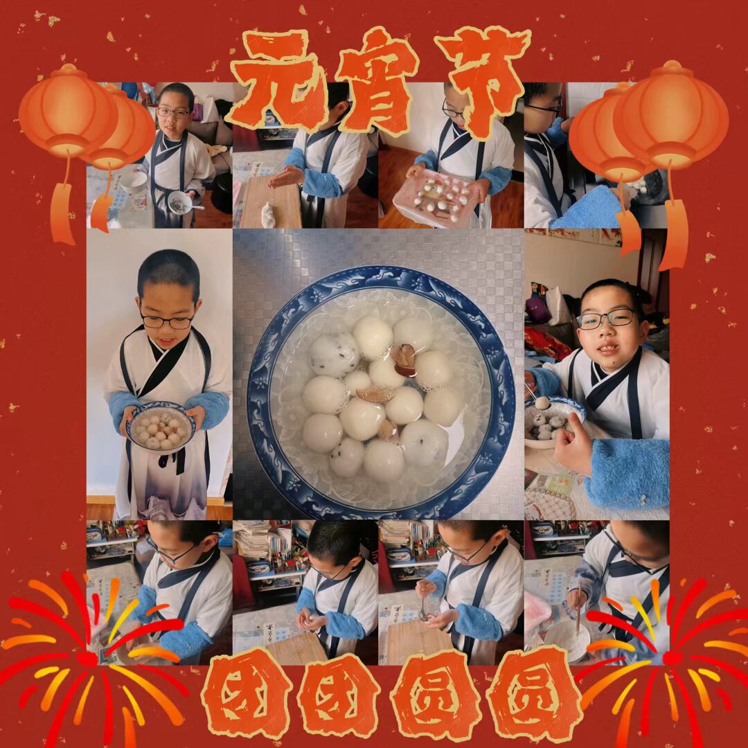 元宵节的晚上,学生们和家人们一起包汤圆。有的家庭全家上阵揉糯米粉、拌馅,有的孩子化身“小老师”教弟弟妹妹包汤圆,还有三五好友相约比拼创意造型。而汤圆也在学生们的奇思妙想中“变”了模样,有的汤圆还是白白的小圆球,有的汤圆穿了粉色、绿色的花衣,有的汤圆则全身镶满了黑色“宝石”……