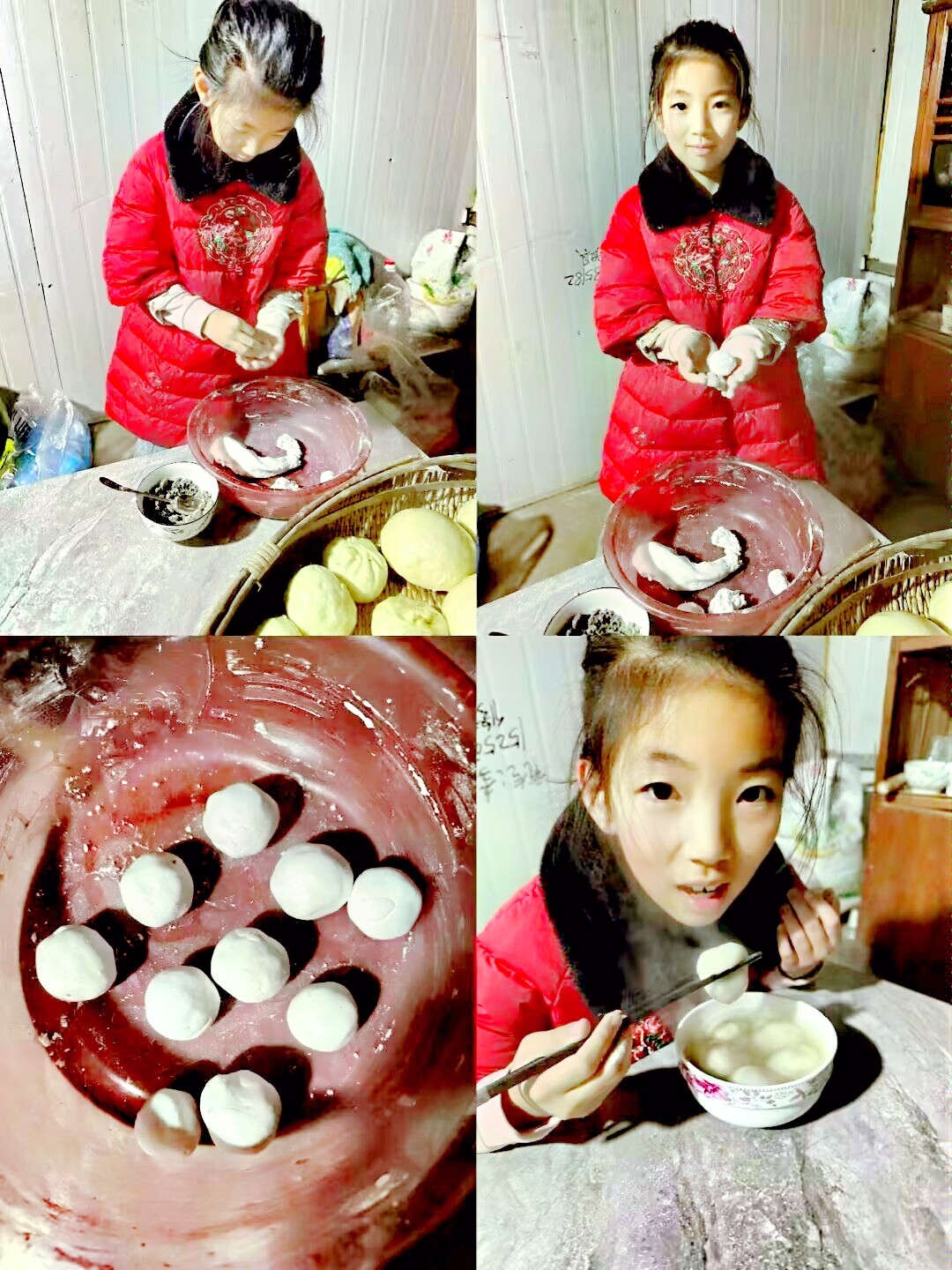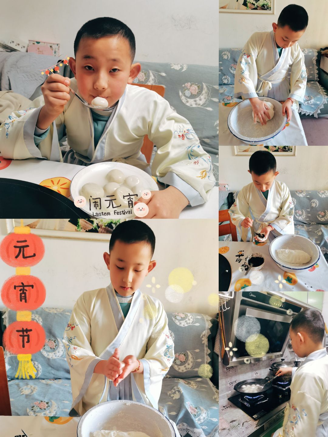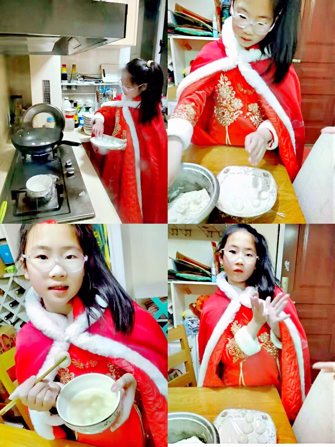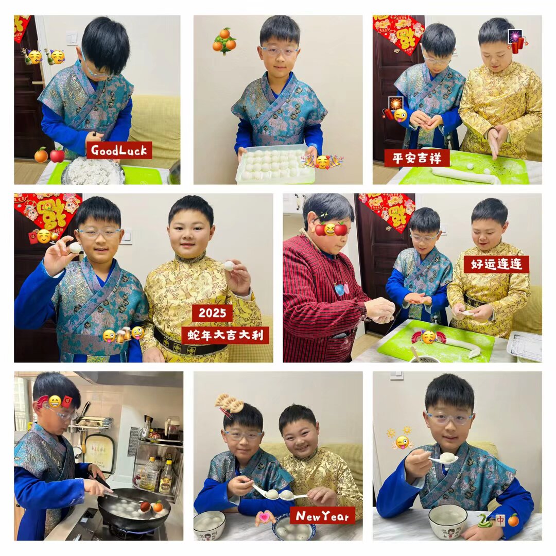 元宵节的晚上,学生们和家人们一起包汤圆。有的家庭全家上阵揉糯米粉、拌馅,有的孩子化身“小老师”教弟弟妹妹包汤圆,还有三五好友相约比拼创意造型。而汤圆也在学生们的奇思妙想中“变”了模样,有的汤圆还是白白的小圆球,有的汤圆穿了粉色、绿色的花衣,有的汤圆则全身镶满了黑色“宝石”……