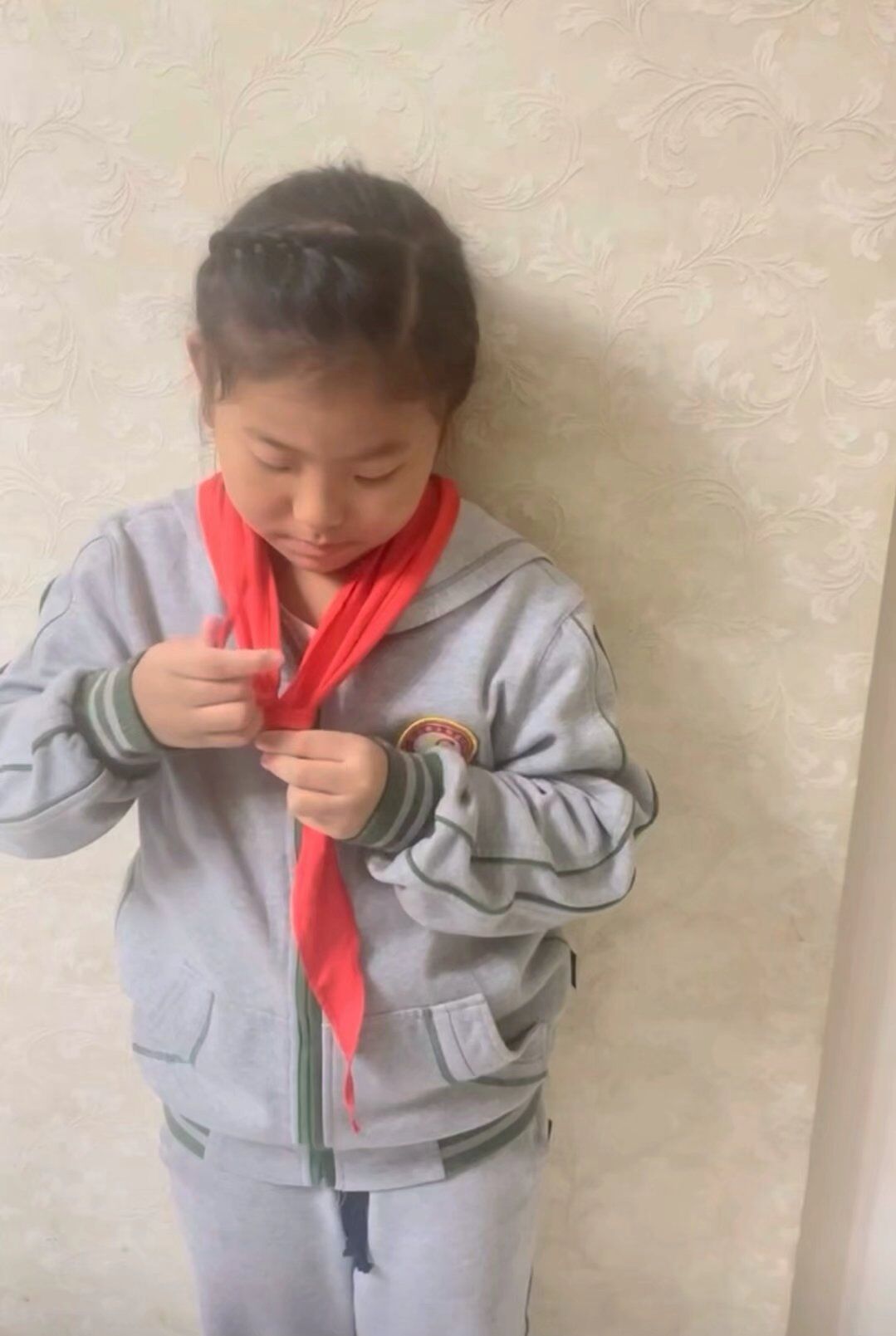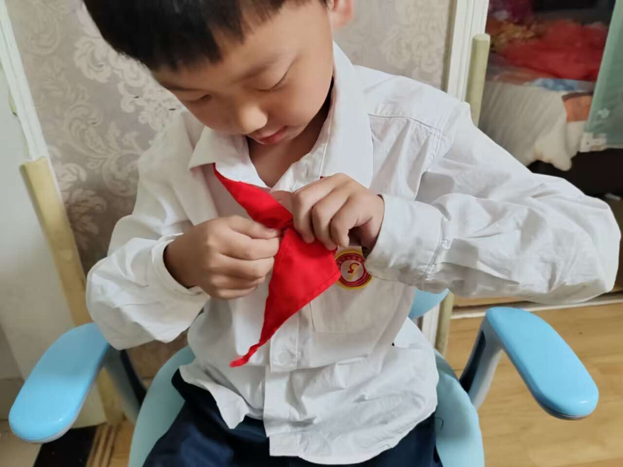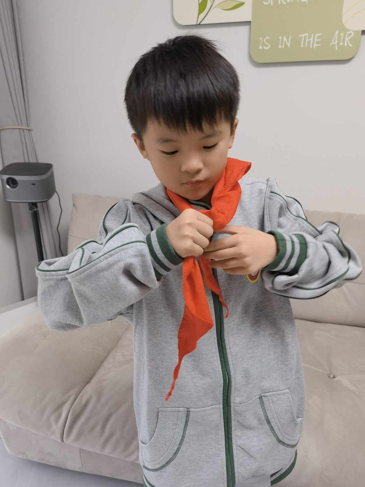 红领巾是我们少先队员的标志,正确地佩戴红领巾能充分体现我们少先队员的精神面貌,也能表达少先队员的爱国之情。瞧!同学们正认真、仔细地系着红领巾呢!看,他们的喜悦之情溢于言表!