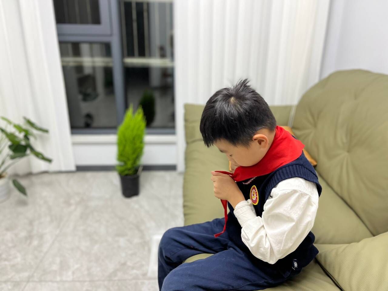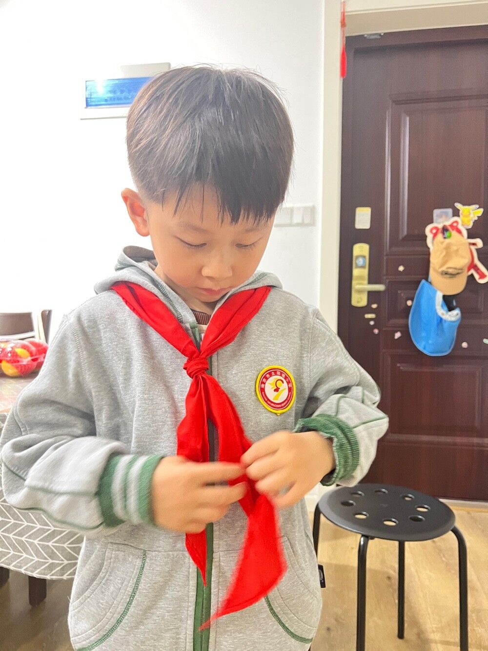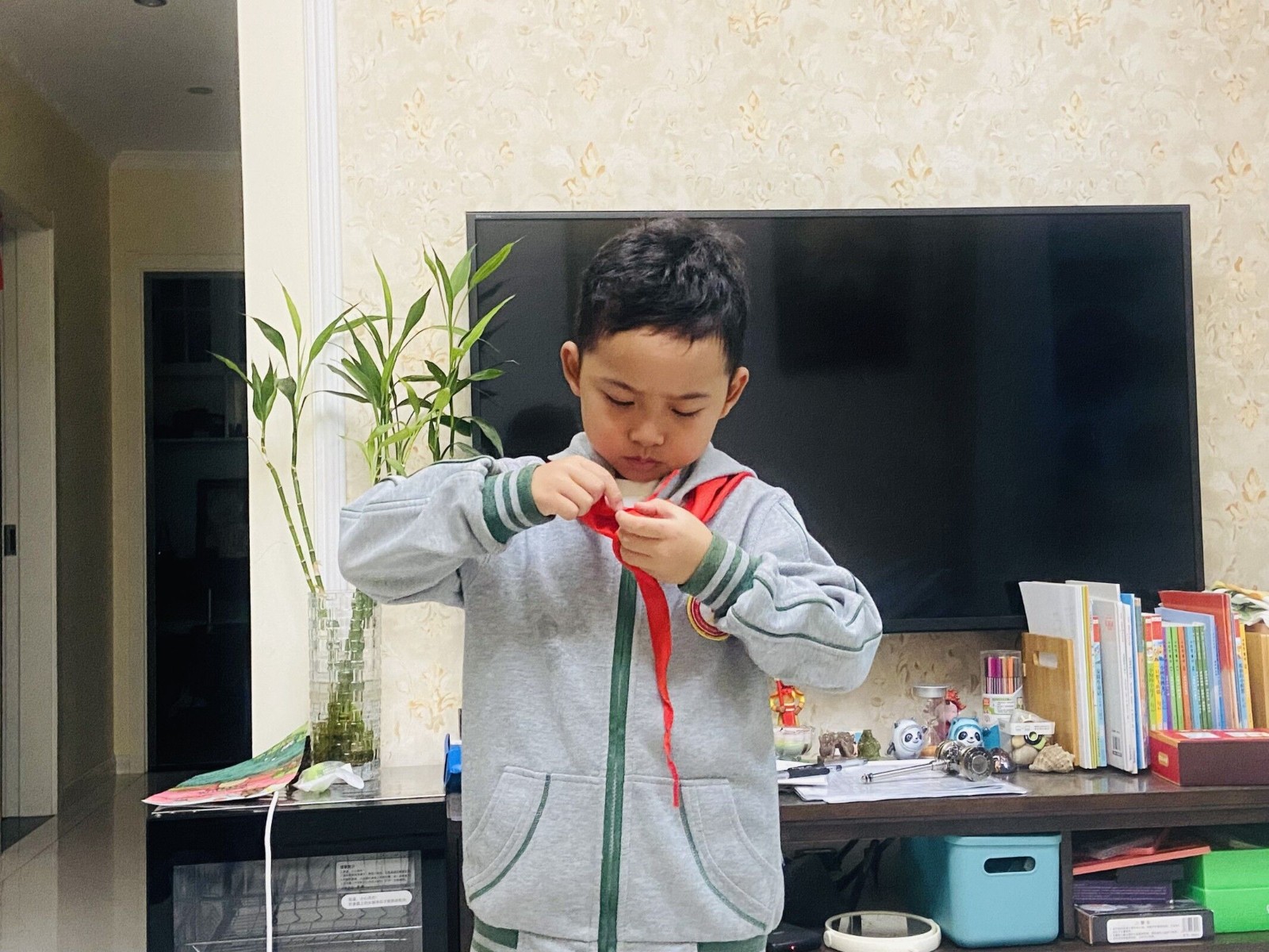 红领巾是我们少先队员的标志,正确地佩戴红领巾能充分体现我们少先队员的精神面貌,也能表达少先队员的爱国之情。瞧!同学们正认真、仔细地系着红领巾呢!看,他们的喜悦之情溢于言表!