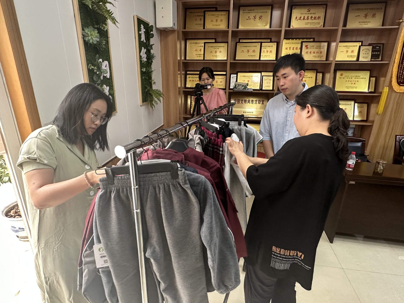 阐述过后,各位参会人员认真查看样衣、填写打分表,并发表对校服改进意见。最终大众评审的分数与专业评委的分数进行汇总,总分排名第一为本次校服招标会的中标企业。