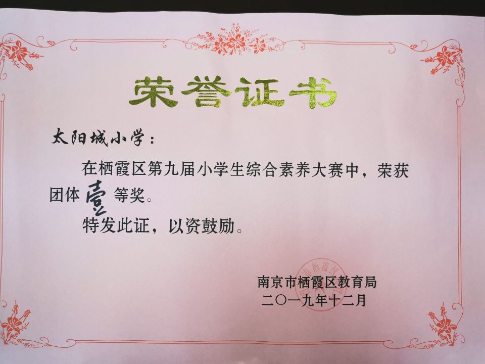 喜讯频频捷报传,众人欢笑尽开颜。2019年12月18日,太阳城小学教育集团在栖霞区第九届小学生综合素养大赛中,荣获团体总分一等奖!