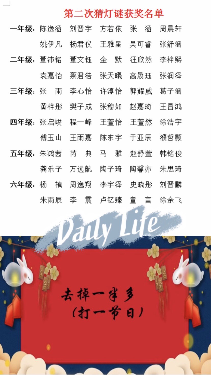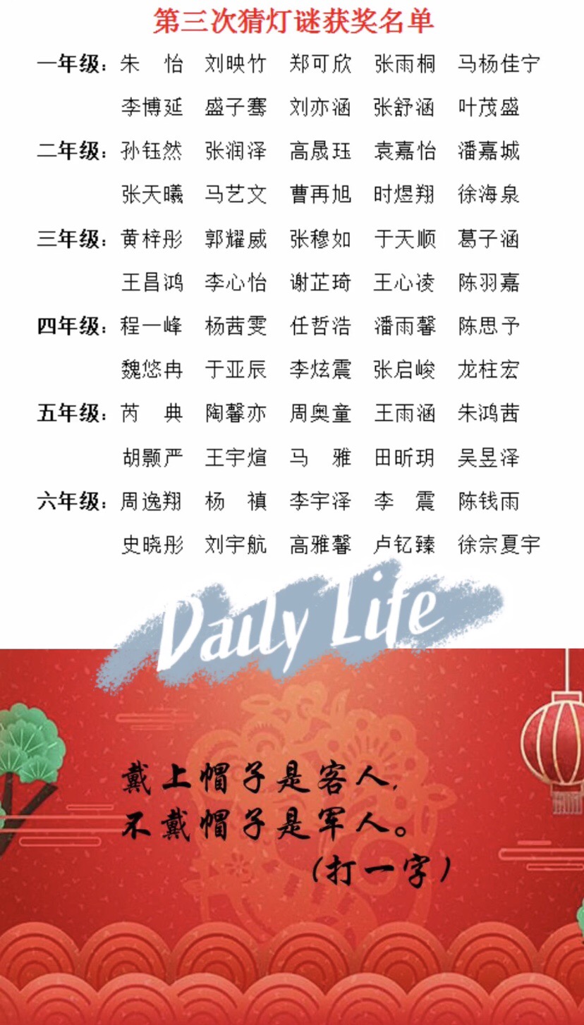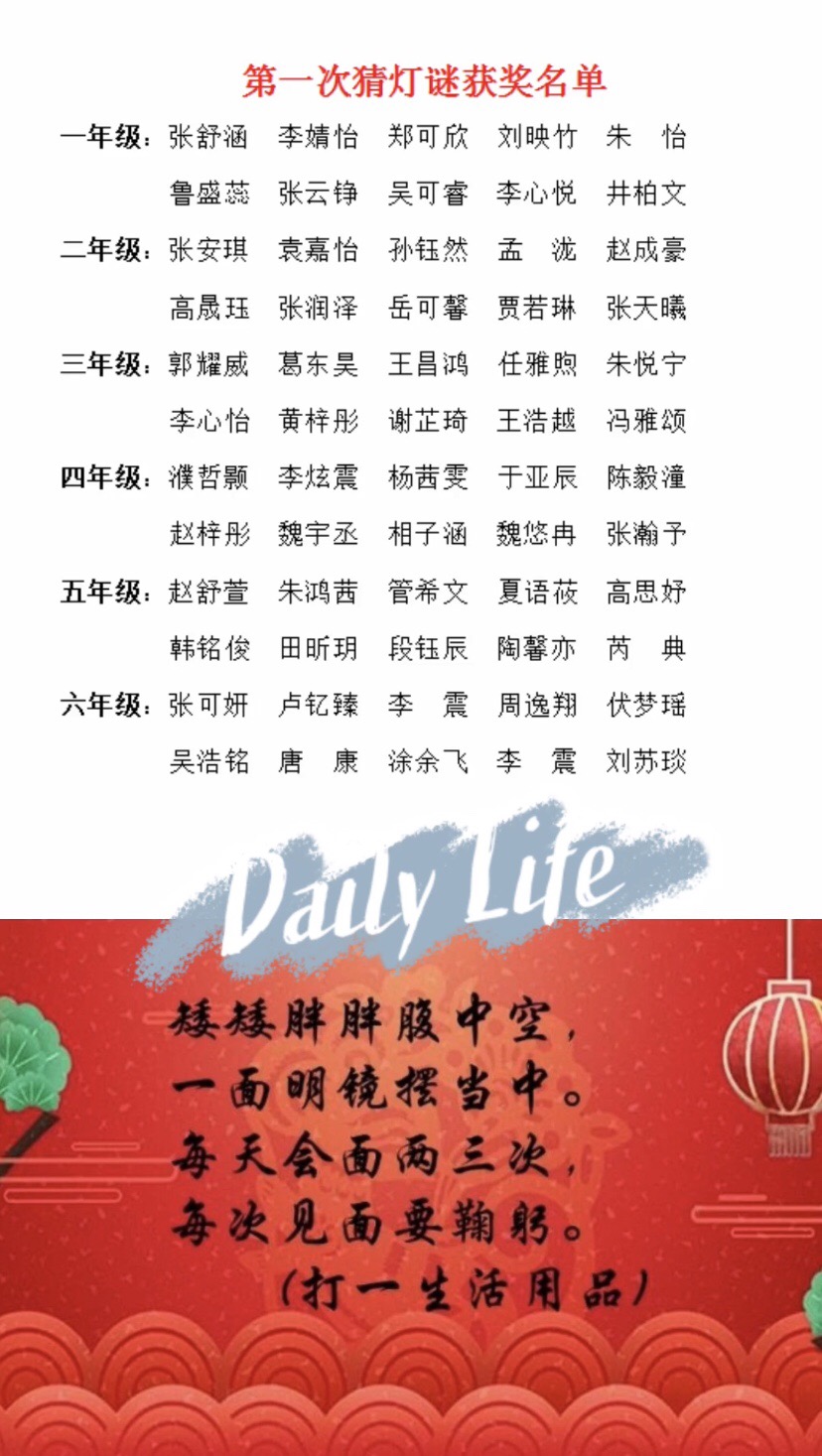 张校长也为全校同学准备了三条有趣的灯谜,每个年级最先回复正确的十名同学会获得抽奖机会,这可是拼脑力和手速的时刻啊!紧张又刺激的比赛之后,最激动人心的就是公布获奖结果啦!快睁大眼睛找一找,你是不是“最强大脑”!
