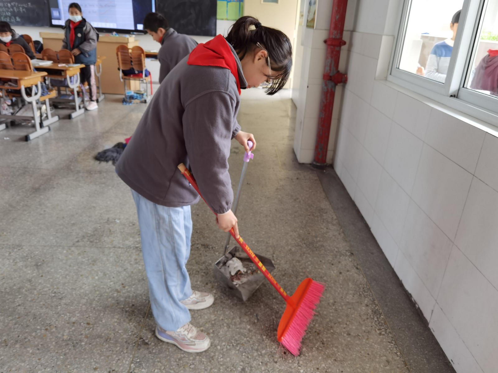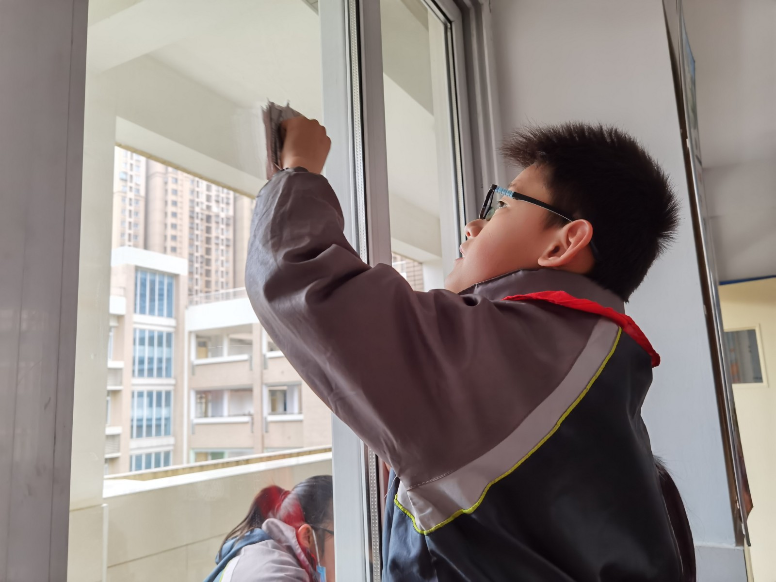 班会课上,各班班主任首先引导学生们从实际生活出发,了解不同年龄阶段劳动教育的主要内容,紧接着对各班负责的包干区进行讲解,包括每天打扫包干区的时间段,打扫任务和标准。学生们根据自己所在的包干区,小组分工,有计划地制定劳动任务。接着,班主任老师们带领学生们进行月度卫生大扫除。大扫除的班级,在班主任老师的引导下,热情高涨。大家分工明确,扫地、拖地、擦黑板、擦窗户、擦桌子、教室用具整理等活动一样不落,每个人都积极地打扫着班级的每个角落,通过劳动锻炼自己、成长自己。