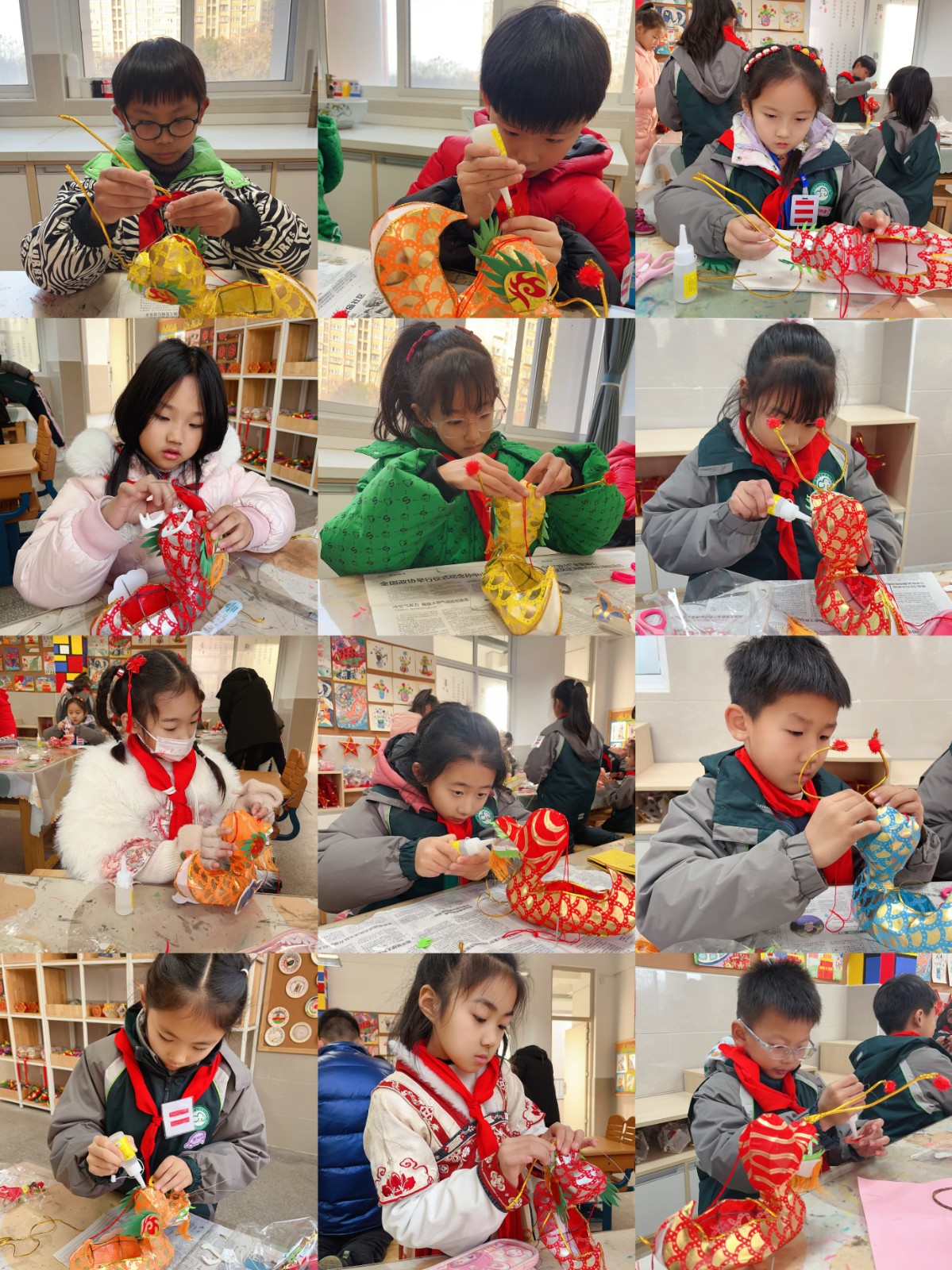 龙年到来之际,非遗陈老师,给社团小成员们开设一节迎龙年的课。陈老师先介绍龙灯的材料,让学生自由选择彩色的龙灯。制作步骤:先从头部开始装饰,再贴身体,最后进行流苏收尾。