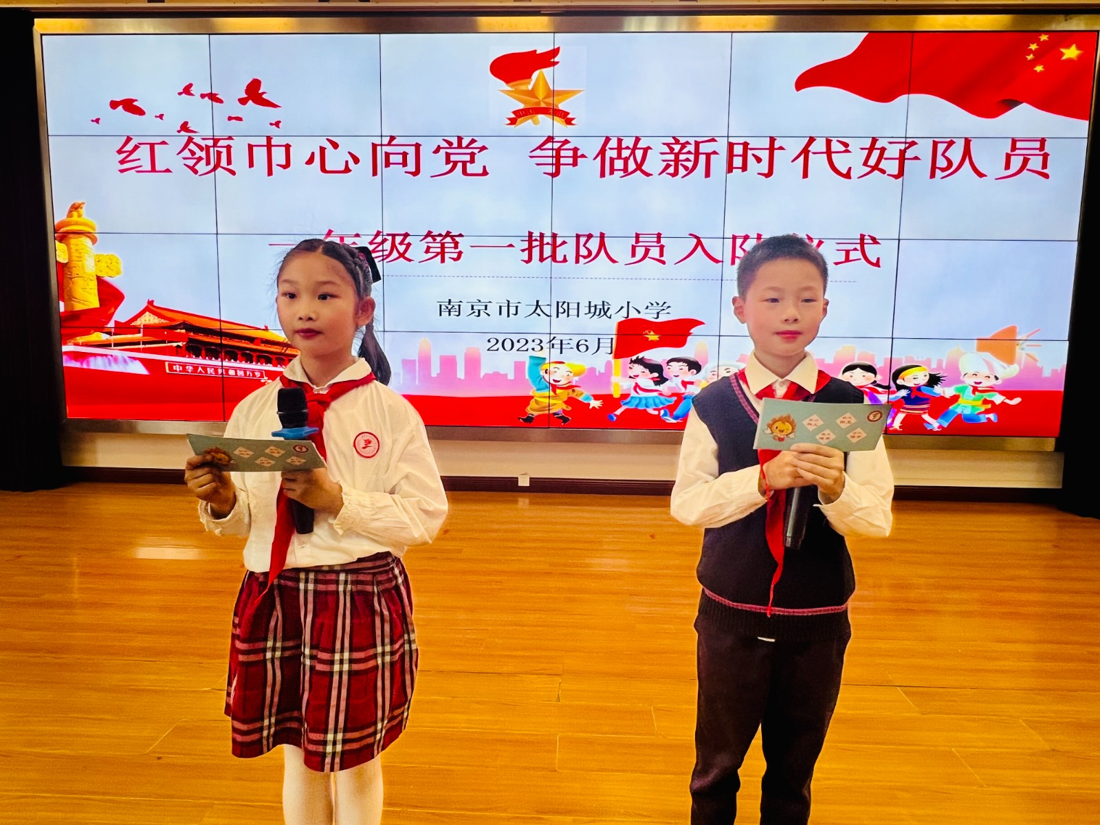 红领巾在胸前迎风飘扬,笑容在脸上尽情绽放。2023年6月2日下午,南京市太阳城小学举行“红领巾心向党 争做新时代好队员”一年级第一批少先队员入队仪式。
