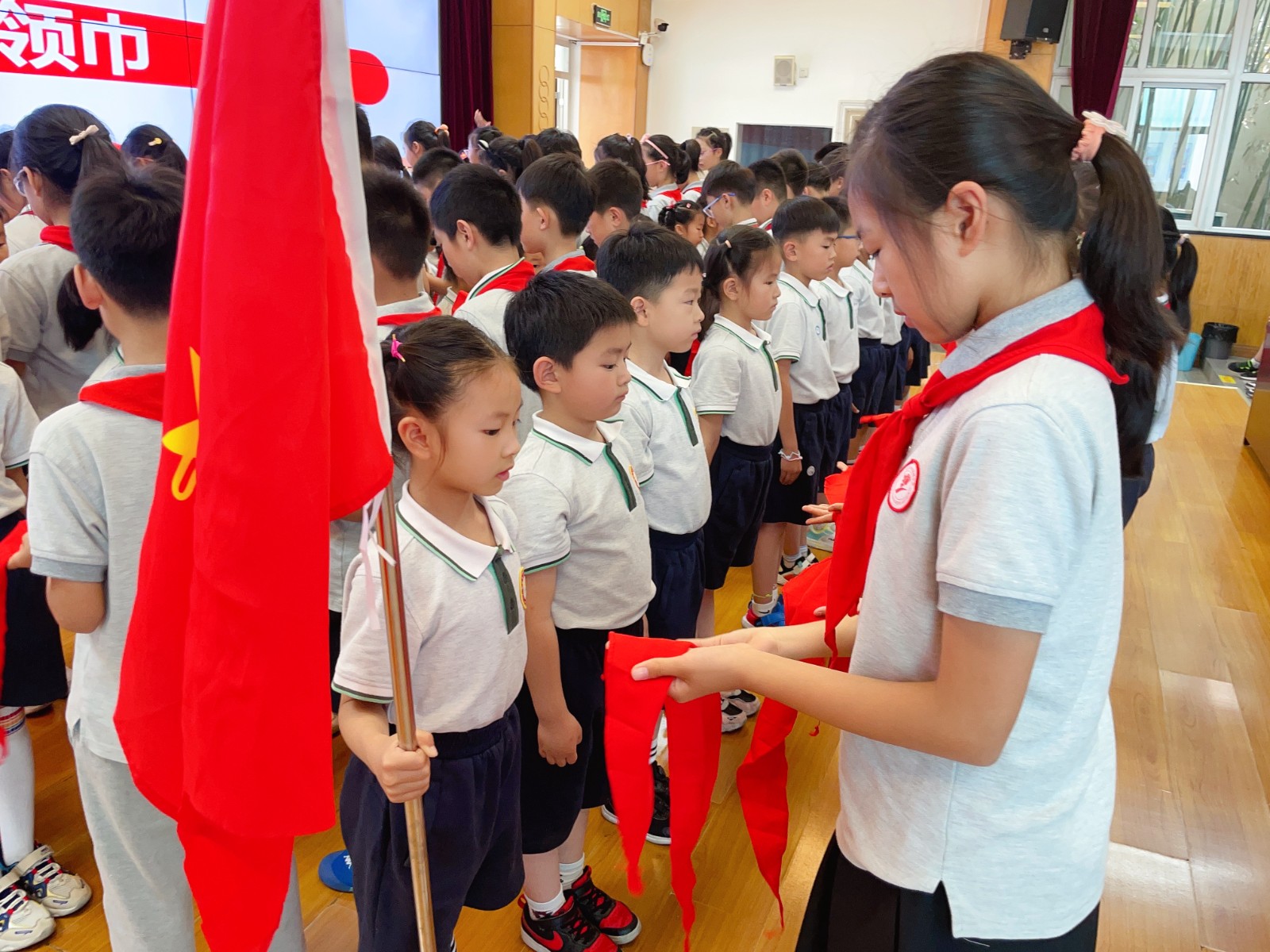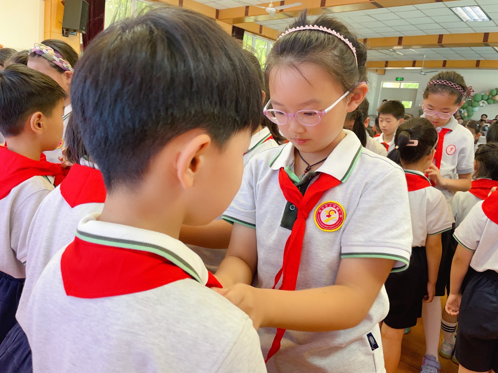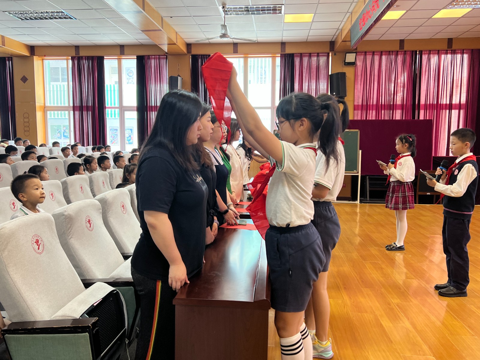 活动伊始,两位小主持介绍了出席本次活动的领导和嘉宾:南京市太阳城小学张文燕副校长、黄娟副校长,德育处王逸群主任,大队辅导员王昕璐老师,一年级的所有师生以及来自高年级的少先队员代表们,本次新入队队员家长也来到了学校共同见证。少先队员代表们为老师们戴上鲜艳的红领巾。