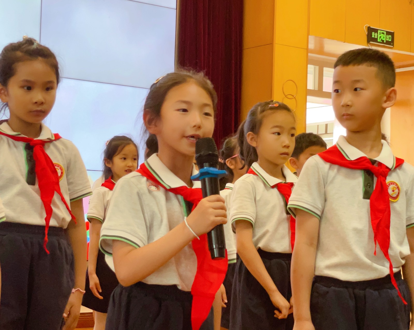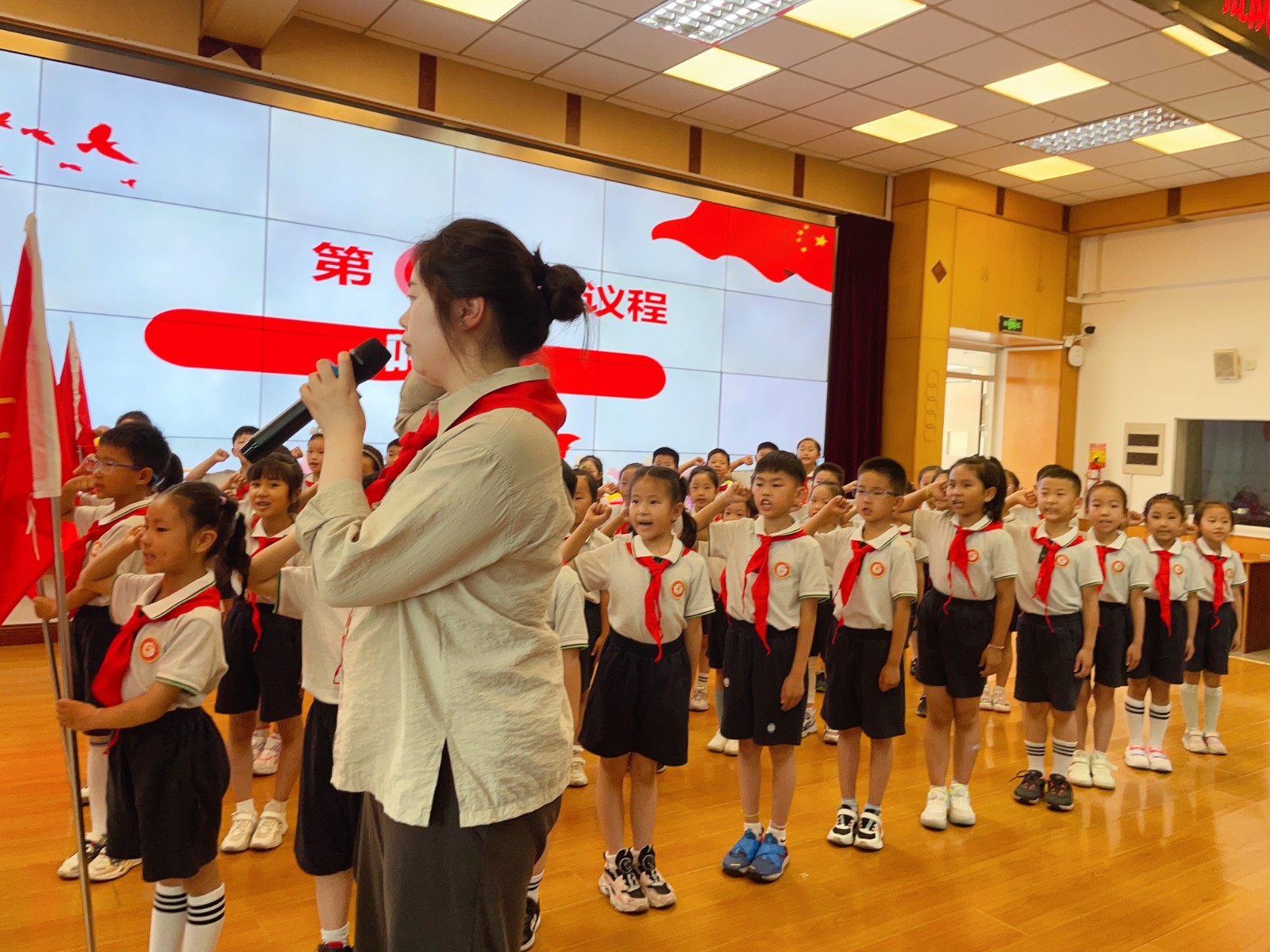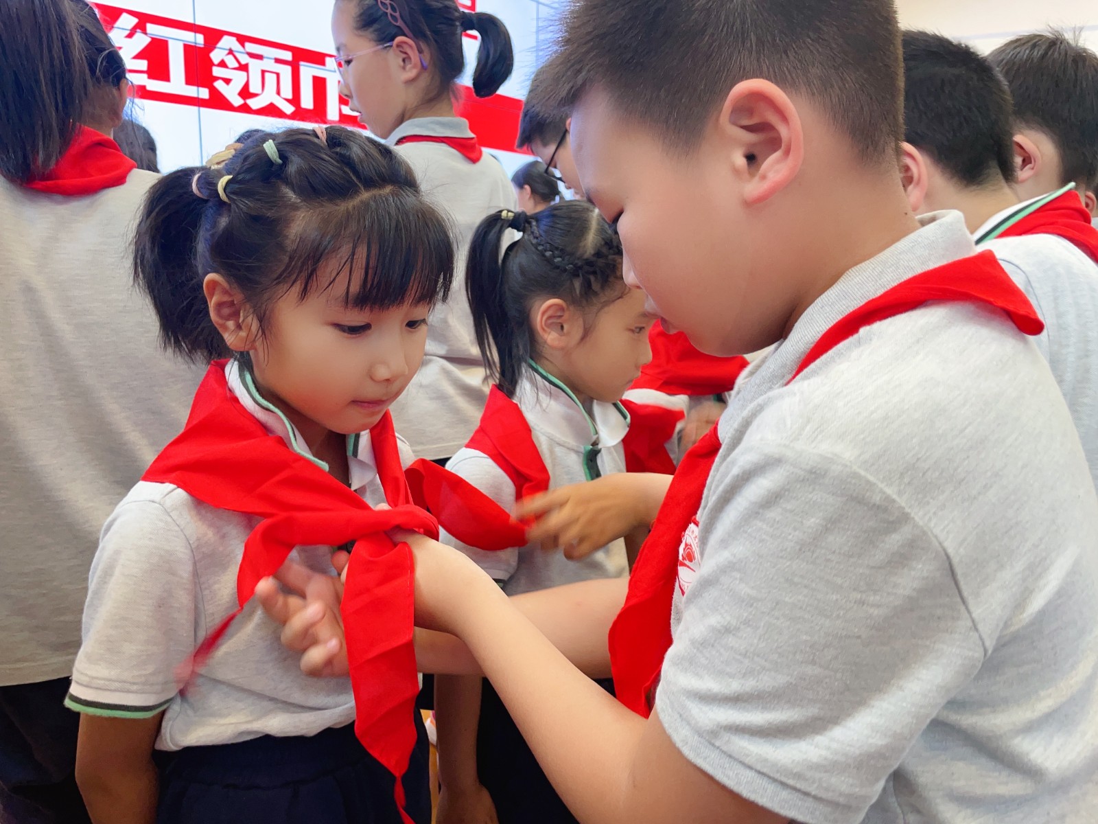 活动伊始,两位小主持介绍了出席本次活动的领导和嘉宾:南京市太阳城小学张文燕副校长、黄娟副校长,德育处王逸群主任,大队辅导员王昕璐老师,一年级的所有师生以及来自高年级的少先队员代表们,本次新入队队员家长也来到了学校共同见证。少先队员代表们为老师们戴上鲜艳的红领巾。