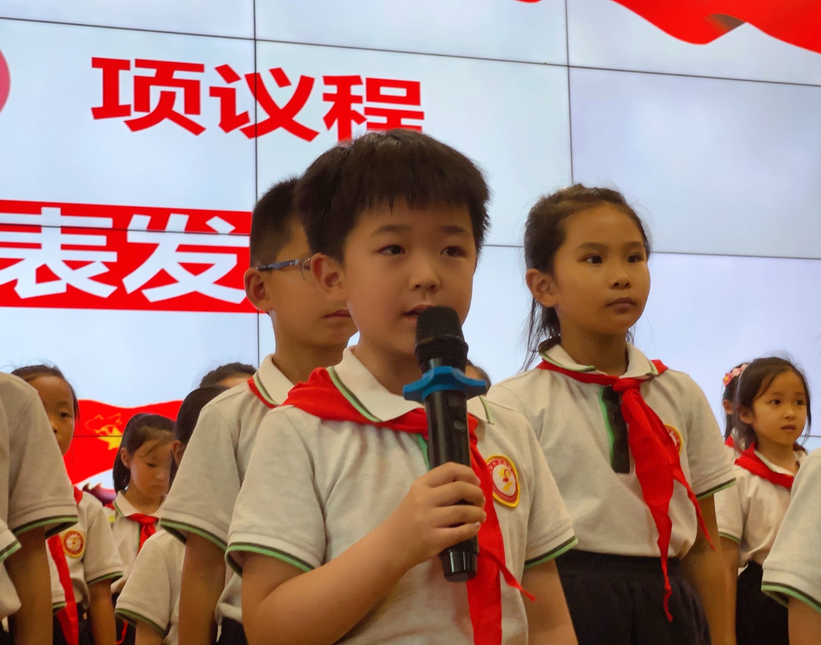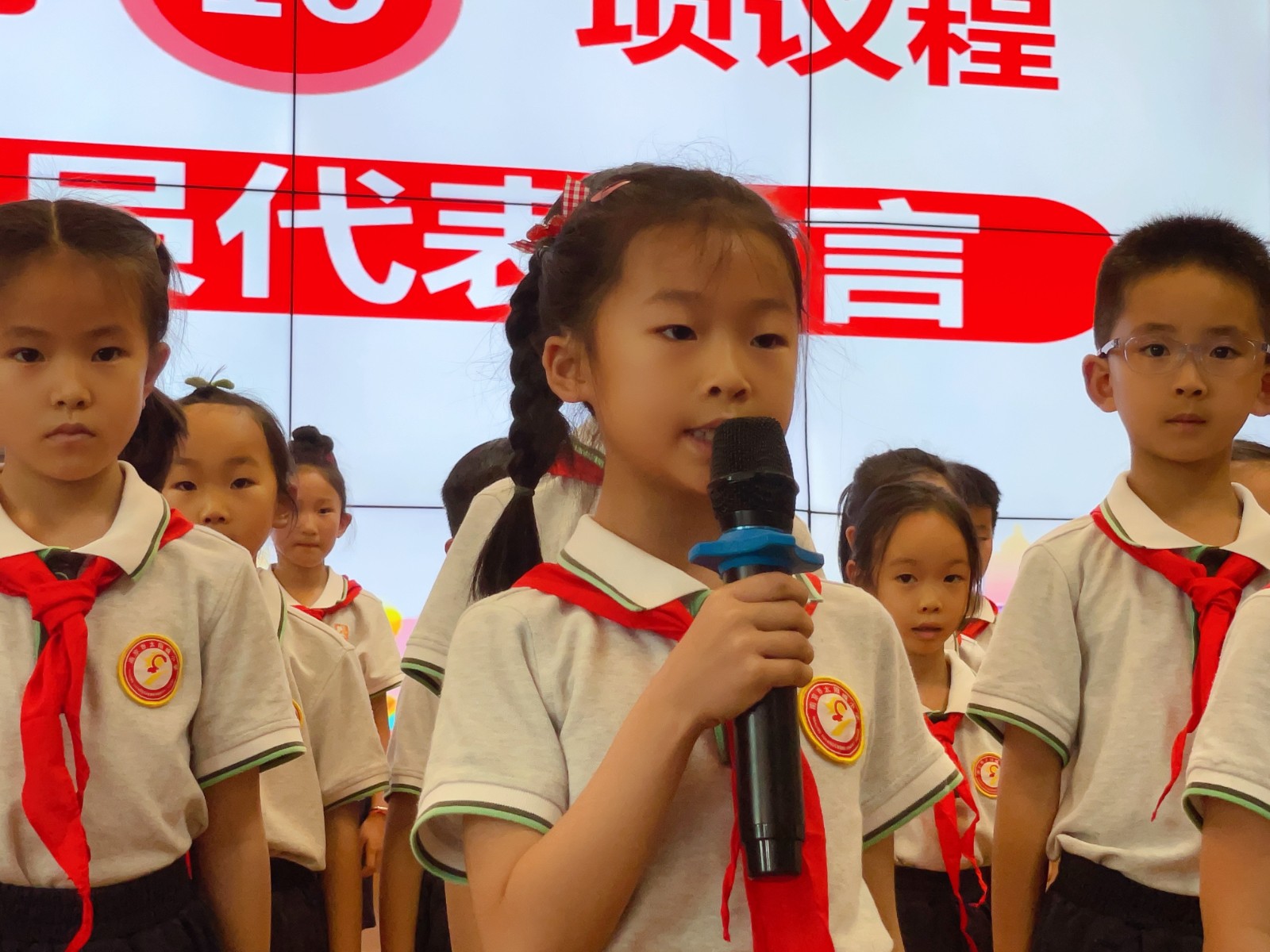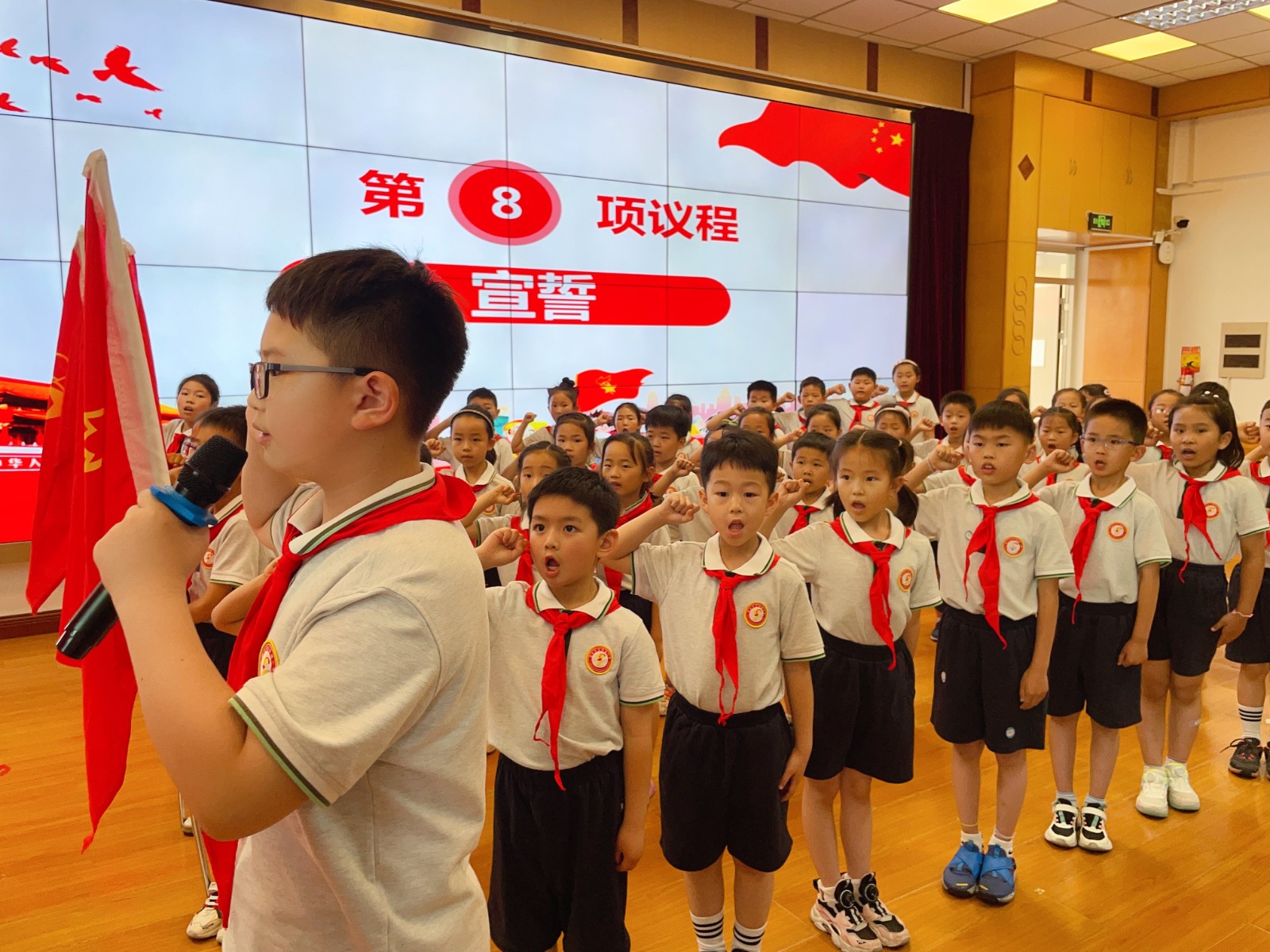 嘹亮又整齐的少年先锋队队歌响彻整个会场,新队员们用嘹亮的歌声表达了对少先队组织的热爱,唱出了此刻激动的心情和入队的决心。