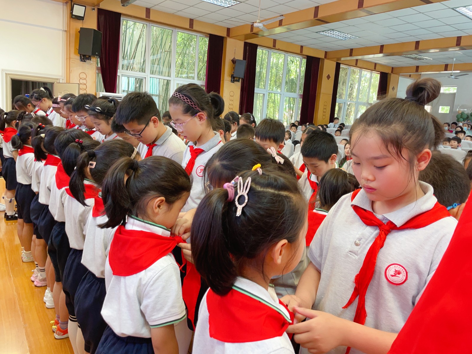 激动人心的时刻到了!高年级队员代表们怀着激动的心情为新队员依次系上了鲜艳的红领巾。台上的“小红领巾们”流露出激动和自豪,台下的少先队员们和家长们为他们送来祝福的掌声。
