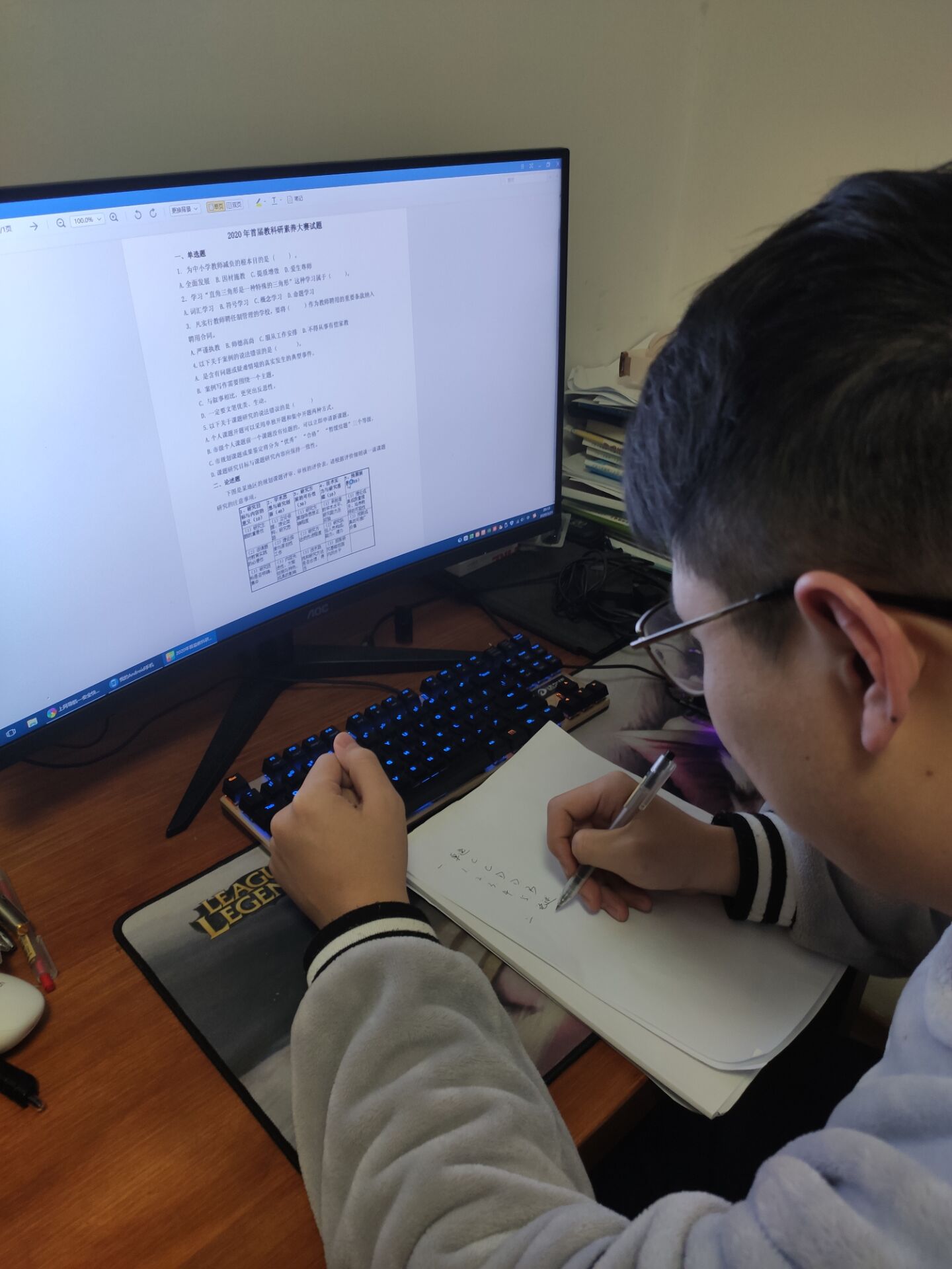 虽然身处家中,老师们却将学习精神发挥到极致,将自己对教科研的热爱,对教育教学的不懈追求倾诉笔端。考试结束,老师们纷纷将书写的内容拍照,发给张老师,并耐心等待竞赛结果。