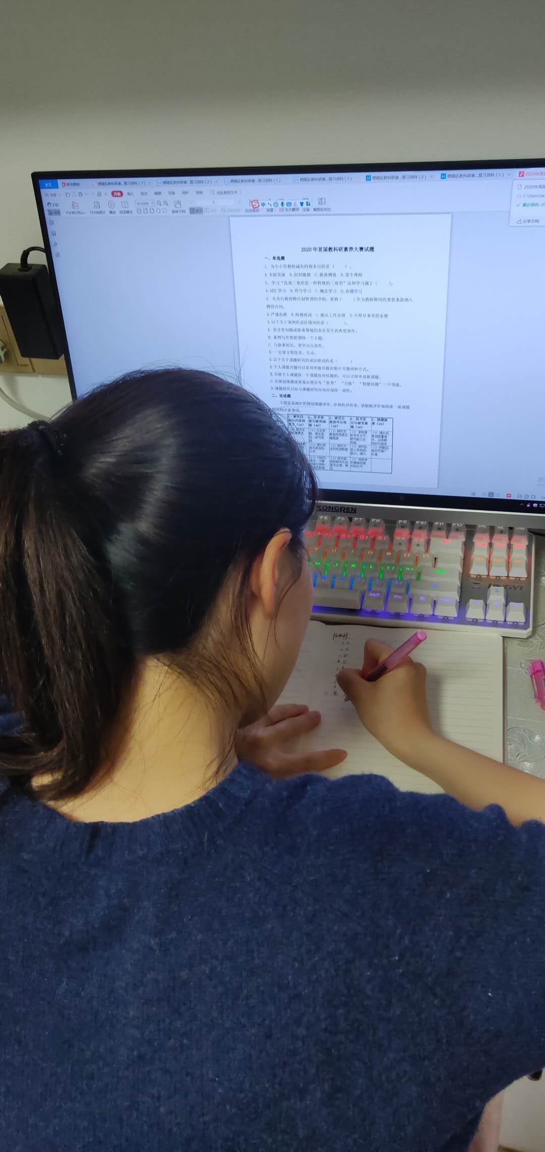 当天晚上七点五十分,张丽老师先在青年教师研修班群内说明了本次竞赛的方式和要求,并鼓励老师们认真作答,争取优异成绩。八点一到,张老师准时发布考试内容。老师们争先恐后地打开试题文档,仔细审题、深思熟虑,然后将考虑好的答案用严谨、正确的语言完整地写下来。