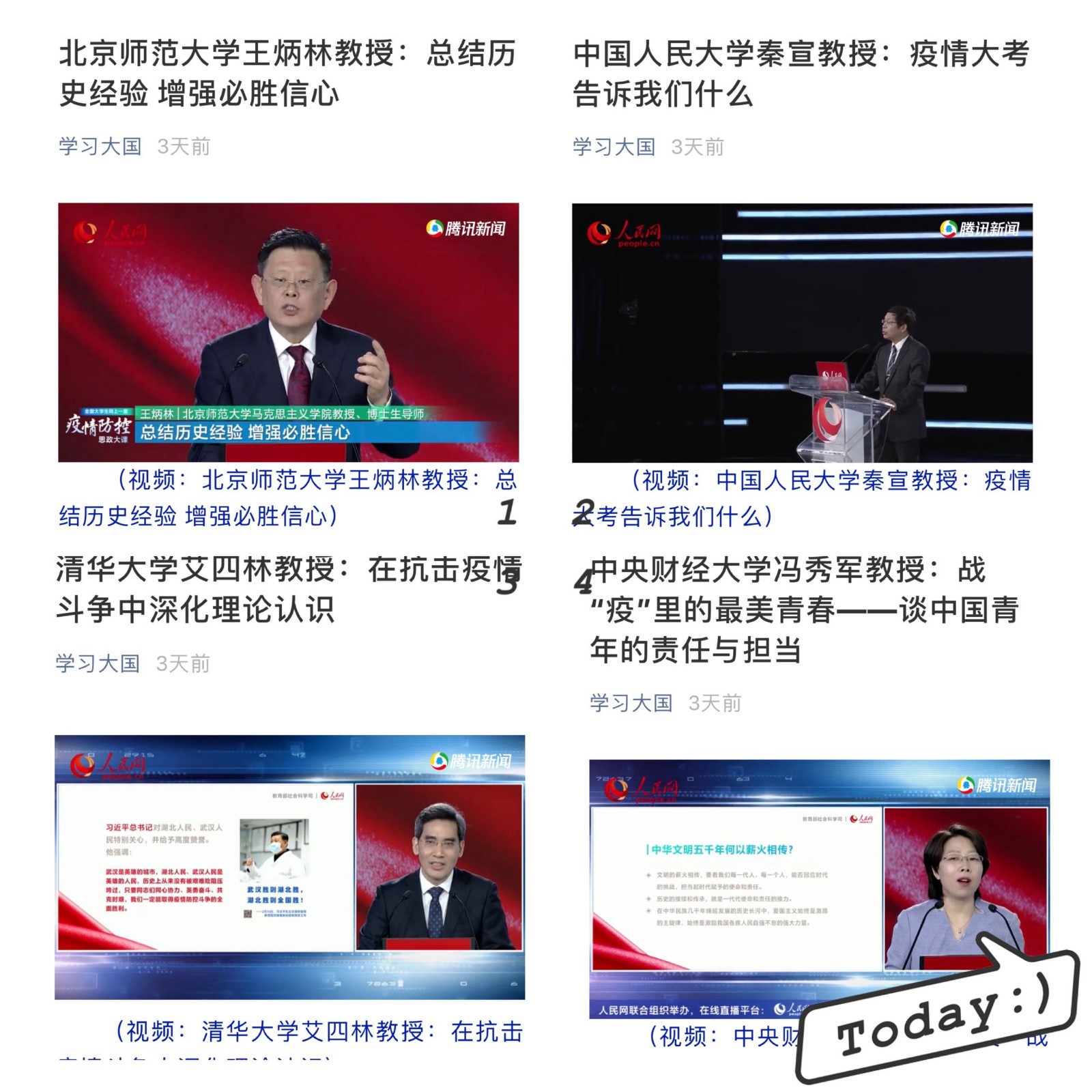 四位专家在讲授的过程中,总结历史经验,关注世界视野。艾四林教授指出构建战“疫”命运共同体,解析全球共同应对疫情的责任与担当;秦宣教授从新时代伟大斗争的角度解析疫情防控,充分展现了中国共产党集中统一领导的制度优势,指出中国特色社会主义制度优势转化为治理效能合理可为,但同时要注意提升风险防控能力。王炳林教授回溯中华民族数千年抗疫史,全面解析中国数千名抗疫经验的当代价值。冯秀军教授通过对中华民族悠久爱国历史文化的弘扬,深刻阐释当代青年历史责任与担当。四堂思政大课有深度有温度,课程内容让人受益匪浅,不仅增强了我们战胜疫情的信心,也鼓励大家要勇于担当社会责任。