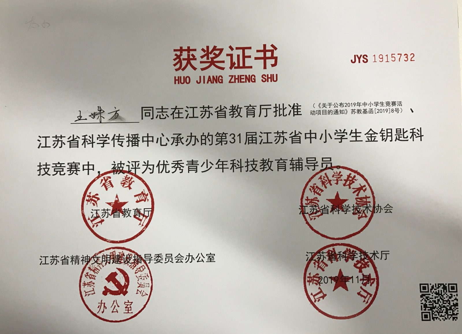 王姝方老师坚守在教学一线,在平凡的跋涉中耕耘不凡,种下的是希望,托出的是栋梁。曾获江苏省优秀青少年科技教育辅导员、江苏省中小学生实验能力大赛组织工作先进个人奖等荣誉称号。做良师,为益友,她用辛勤的汗水,去谱写教育的华章。让我们一起来看看她的事迹。