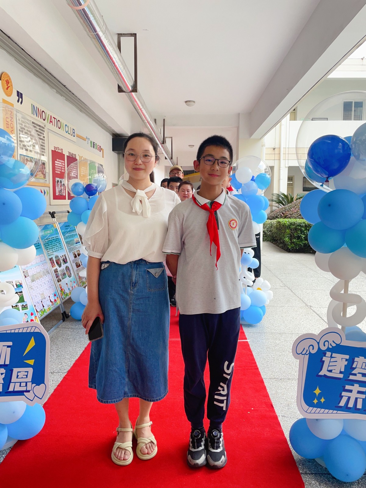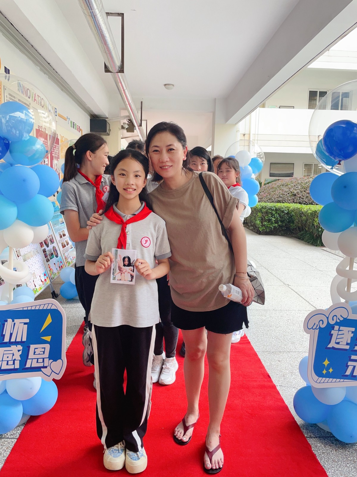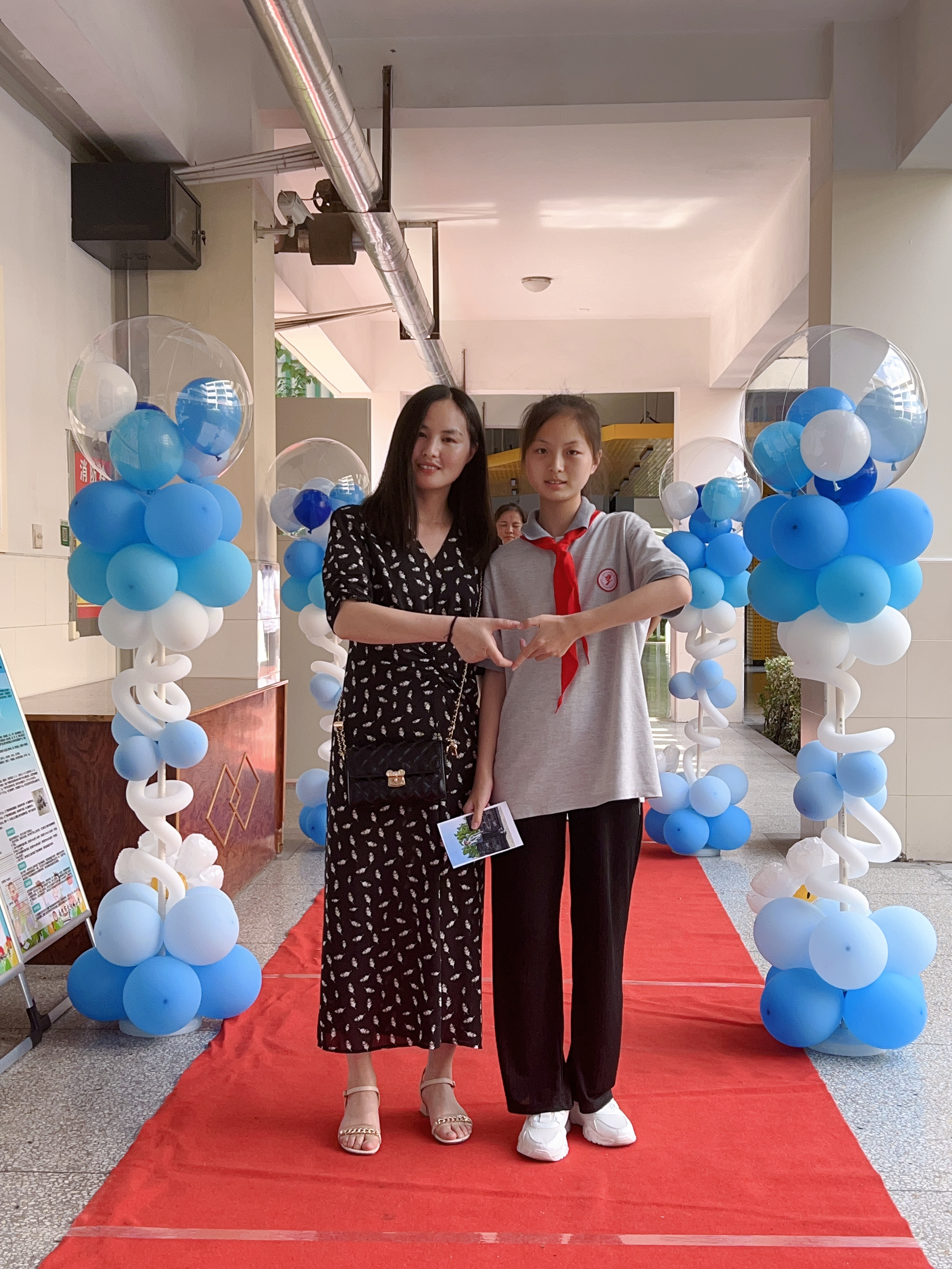 在父母的陪伴下,伴着动听的旋律,六年级的同学们走上红毯,将写上梦想的照片夹上照片墙。