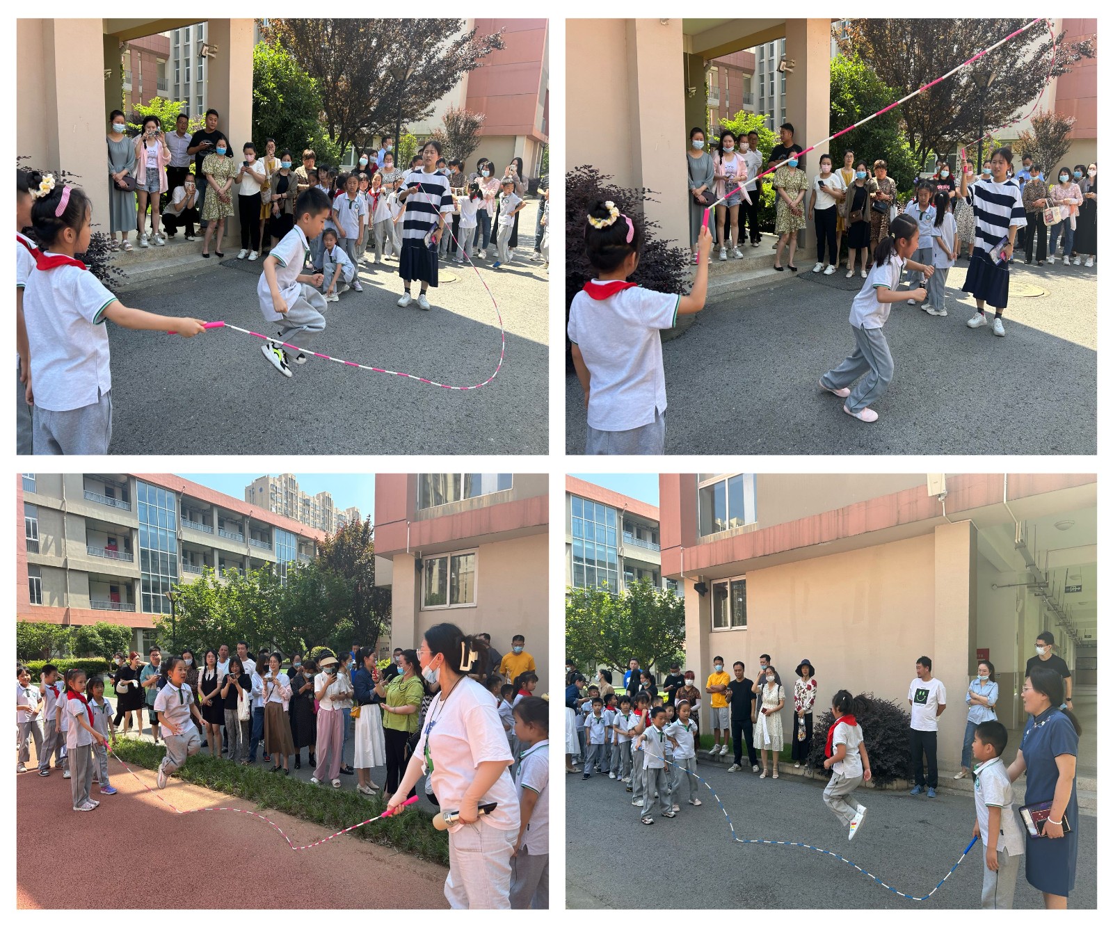 接着,老师们和家长们走进操场,观看了“阳光体育大课间活动”。孩子们在阳光下做着整齐的特色操,又分区域开展了不同年级的特色体育运动。一年级的孩子们拿起长绳,有条不紊地接力跳绳,训练有素的样子让家长忍不住上去一共参加。