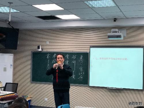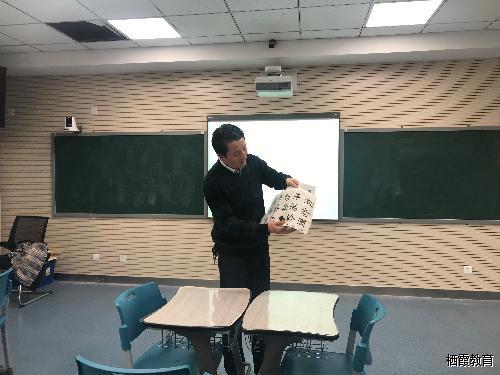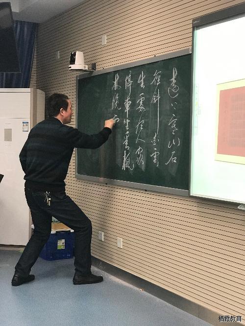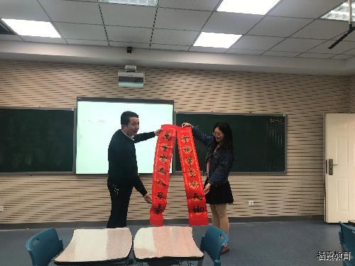 紧接着,为了解开大家的困惑,郝主任从8个方面讲了教师应如何走好专业化发展之路,教师应拥有哪些综合素养:一、健康的身体、强健的体魄;二、师德师风修养;三、组织管理能力;四、教师的朗读诵读、口头语言和肢体语言;五、教师书写;六、文化知识储备与更新;七、音体美、科学等综合知识技能;八、学会合作。每讲一处,郝主任都举好多自己或是身边的例子,向我们阐明该素养的内涵。当谈到朗诵、书写、音体美技能等素养时,郝主任更是毫无保留地向青年教师分享了他的成长、学习历程,激昂地示范朗诵了《沁园春·长沙》,展示了自己平日练习的书法作品、春联。郝主任说到书写时,语重心长地对我们说:一定要静心、耐心地练好三字。说着在黑板上用老师特有的姿势范写了行书《山行》。我们不禁赞叹:“真功夫呀!流畅自如、洒脱飘逸!”在郝主任带来的葫芦丝和竹笛吹奏出的悠扬乐曲声中,大家领略了综合素养高带来的魅力,情不自禁地鼓起掌来。