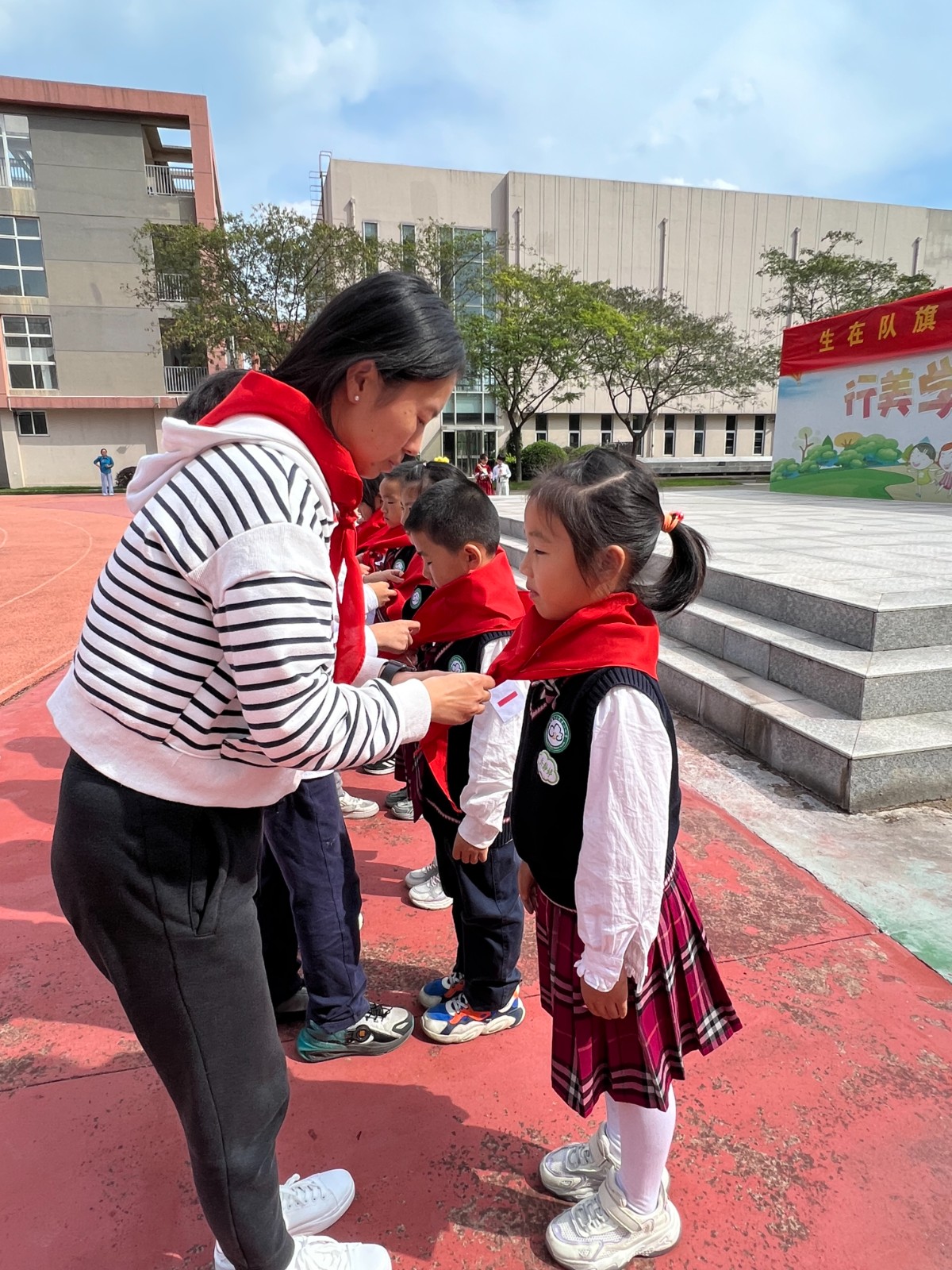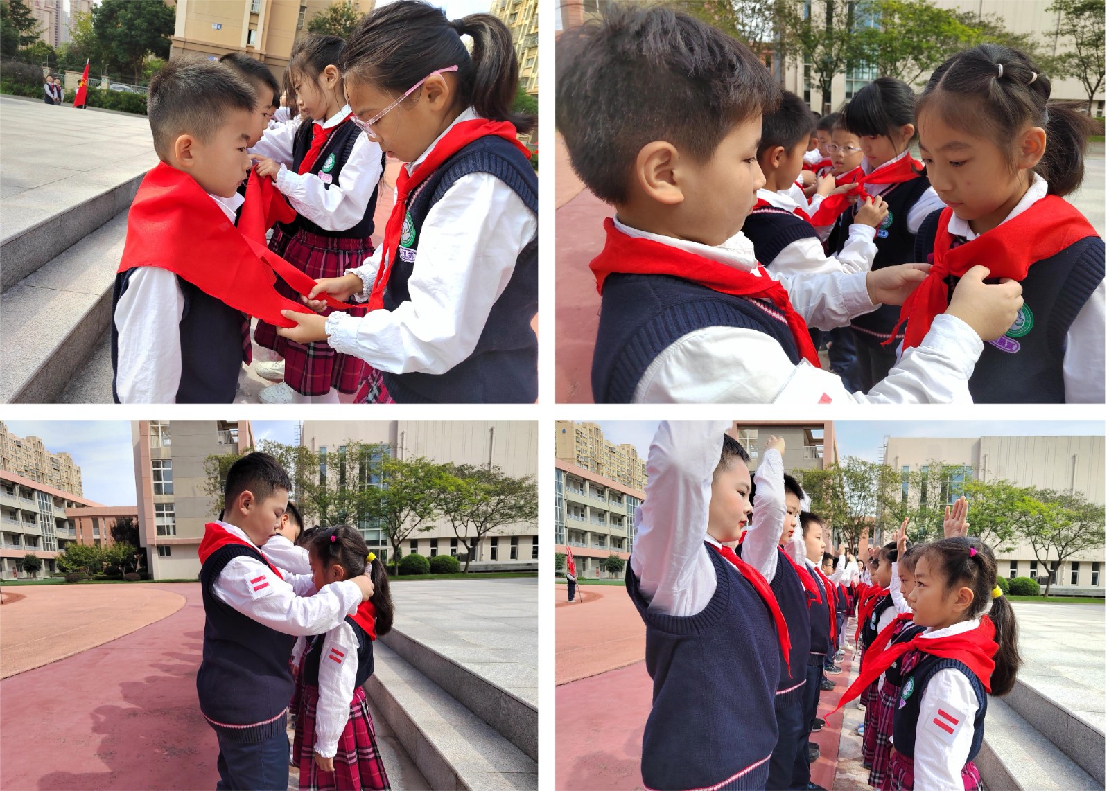 四年级的少先队员代表双手捧着鲜艳的红领巾,小心翼翼地为新队员佩戴,一起见证这荣耀的时刻。这是队员之间情感交融的一刻,更是红色基因传承的神圣时刻。