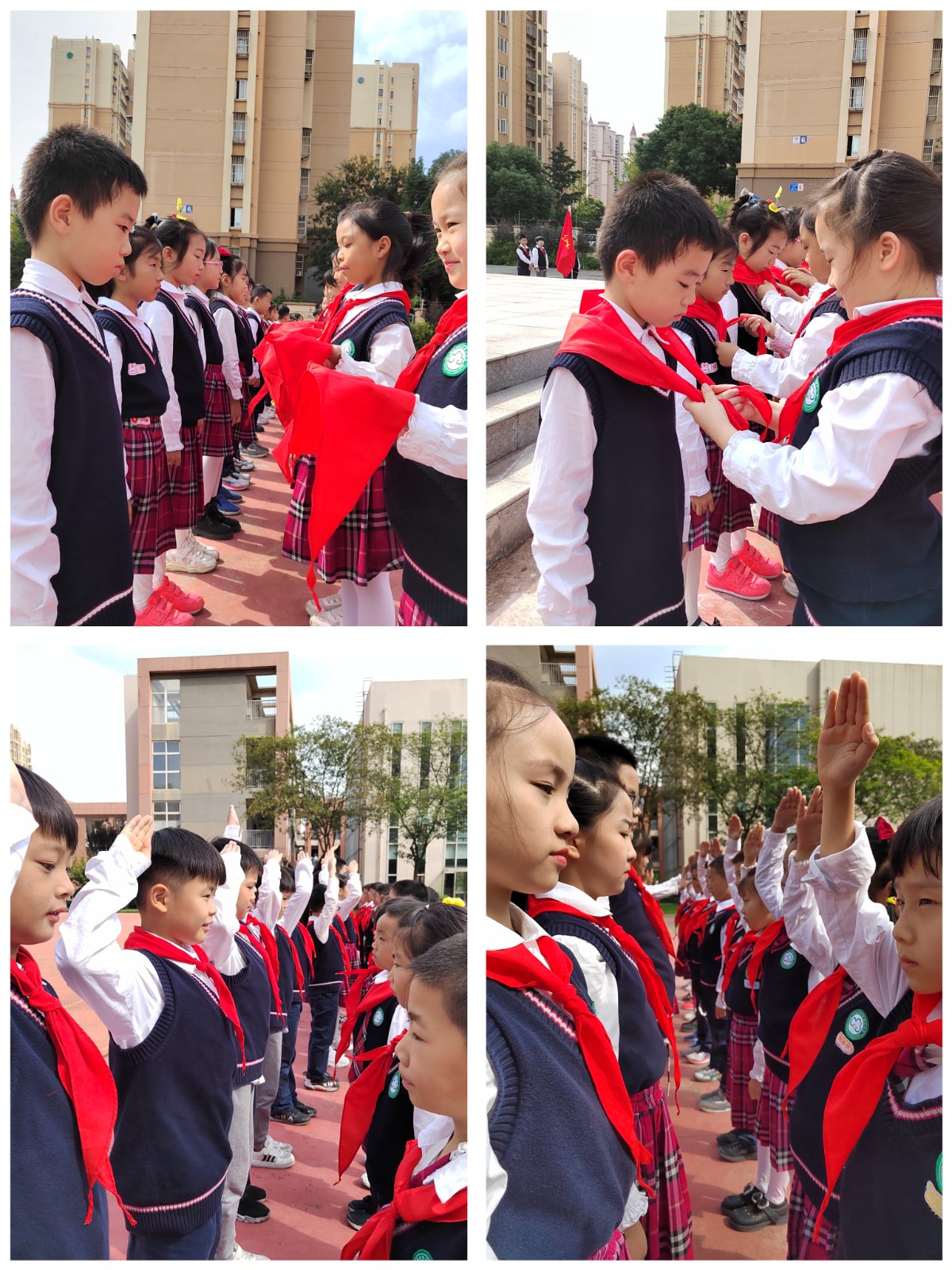 大队辅导员印老师带领新队员宣誓,铮铮誓言表达了队员们勤奋学习,为红领巾增光添彩的决心和信心。