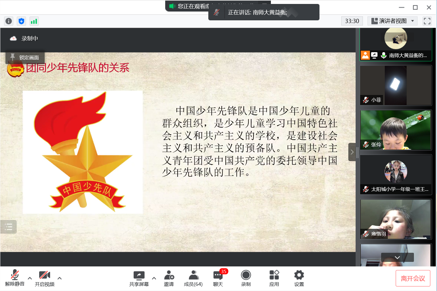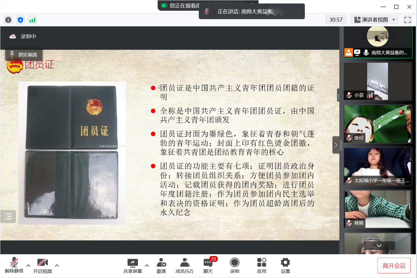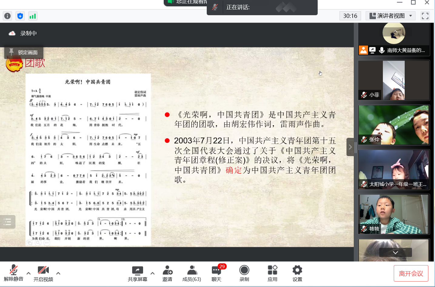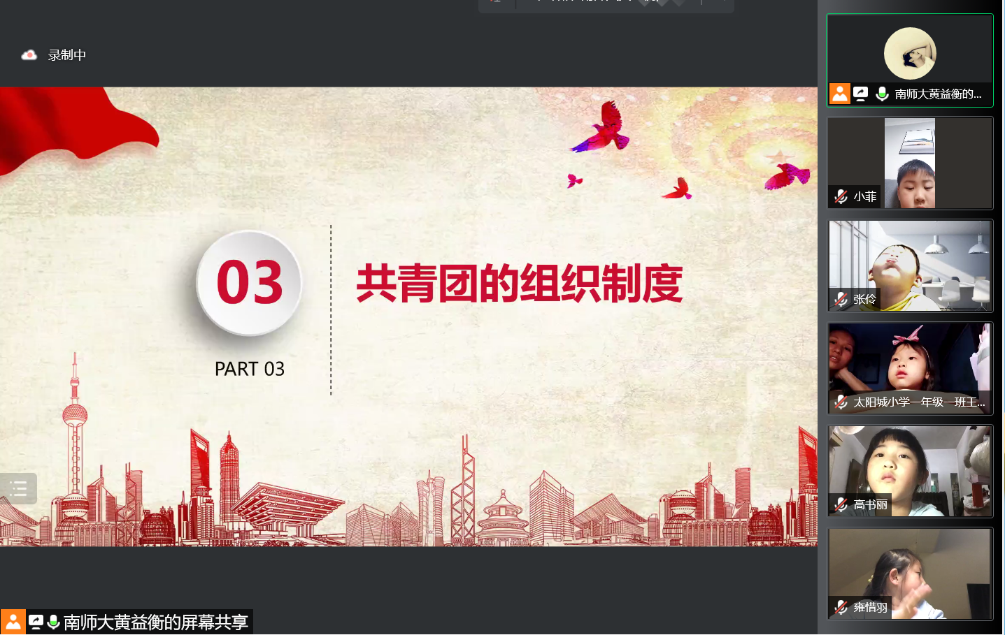 暖风徐徐,春末夏初,5月4日晚7点,来自南京师范大学的黄益衡与南湾营小学的共青团员以及少先队员相约线上,在这一个特殊的日子——青年节,进行了一场主题为“青春之歌,唱响未来”的团史主题讲座。