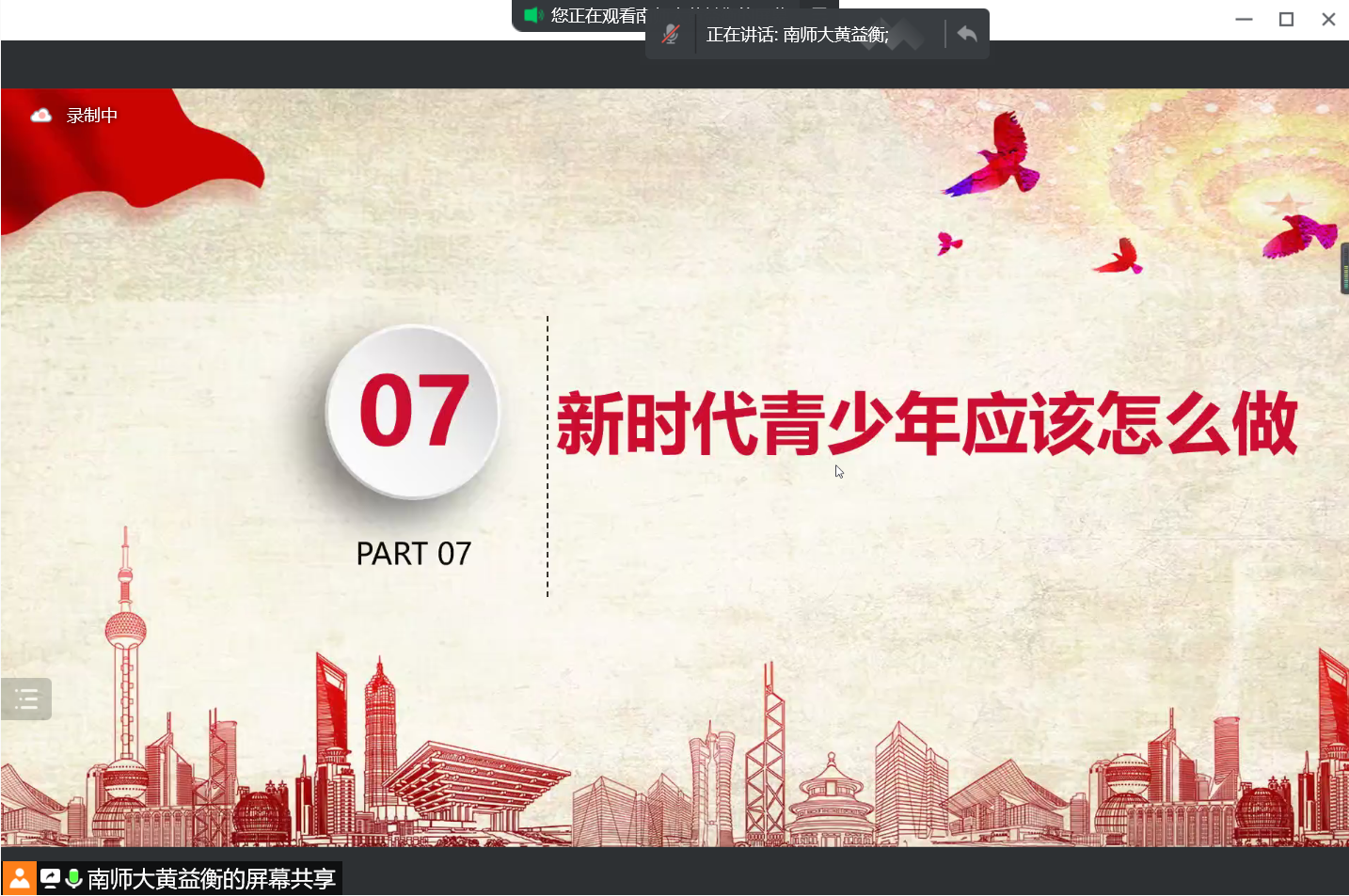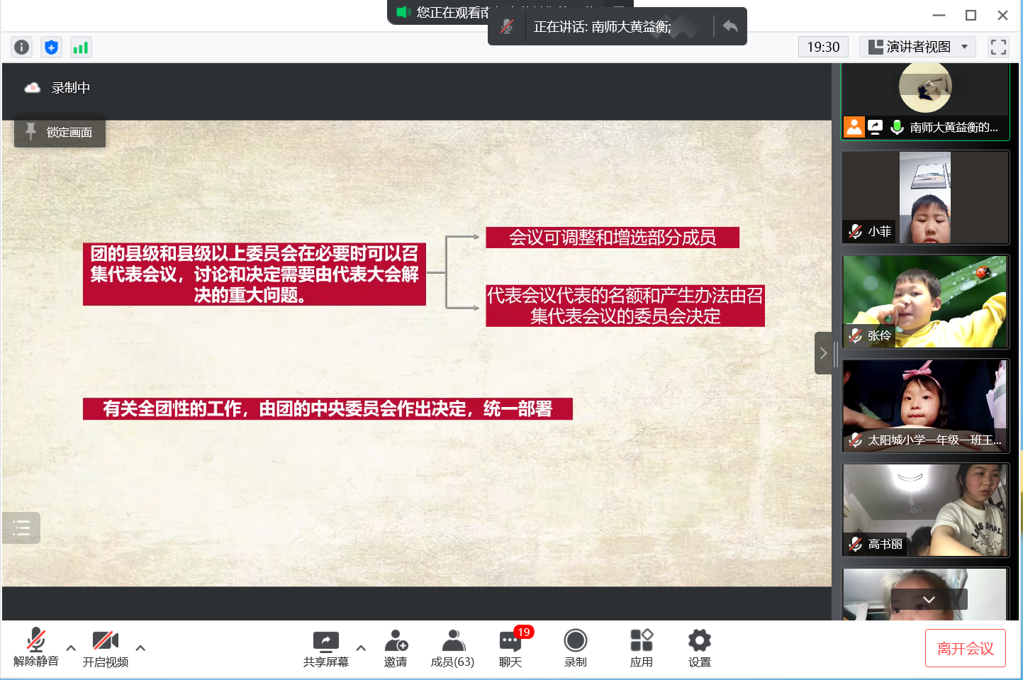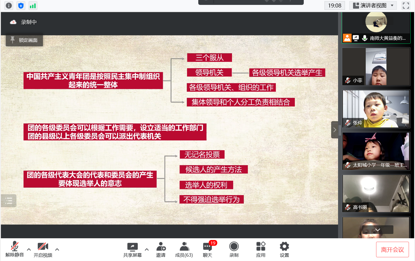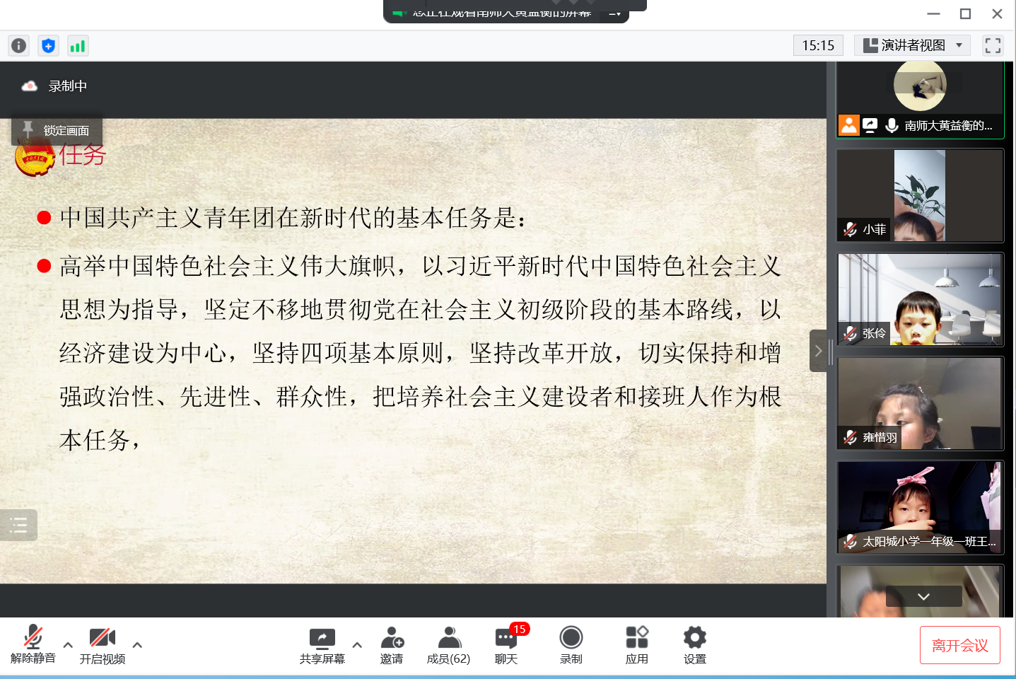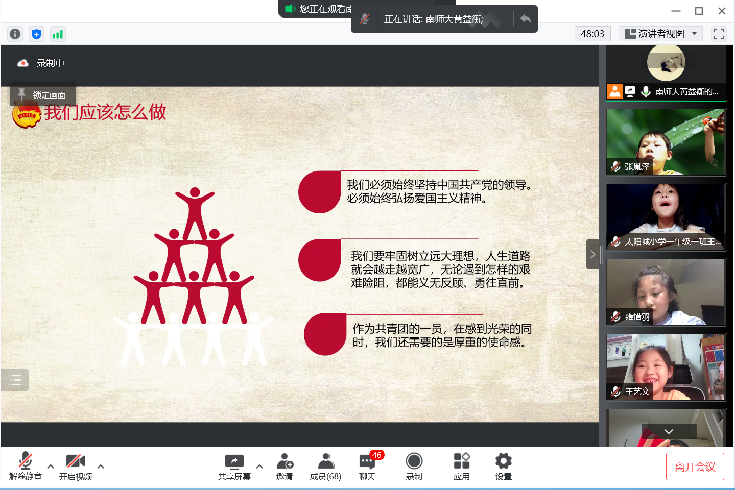 暖风徐徐,春末夏初,5月4日晚7点,来自南京师范大学的黄益衡与南湾营小学的共青团员以及少先队员相约线上,在这一个特殊的日子——青年节,进行了一场主题为“青春之歌,唱响未来”的团史主题讲座。