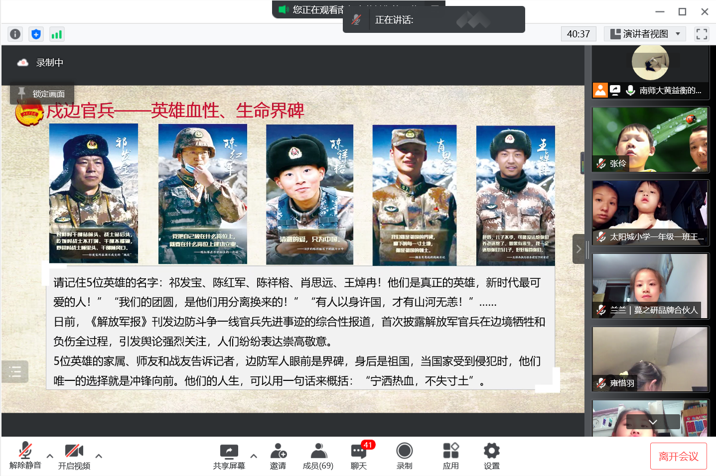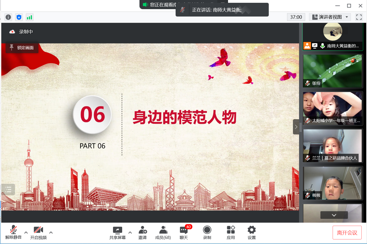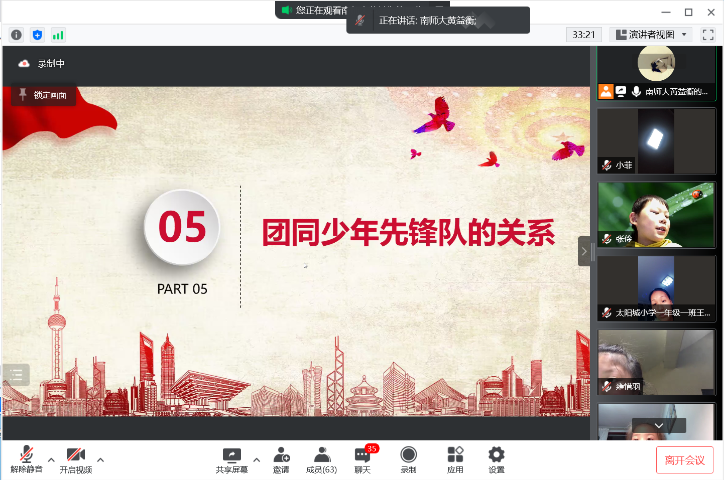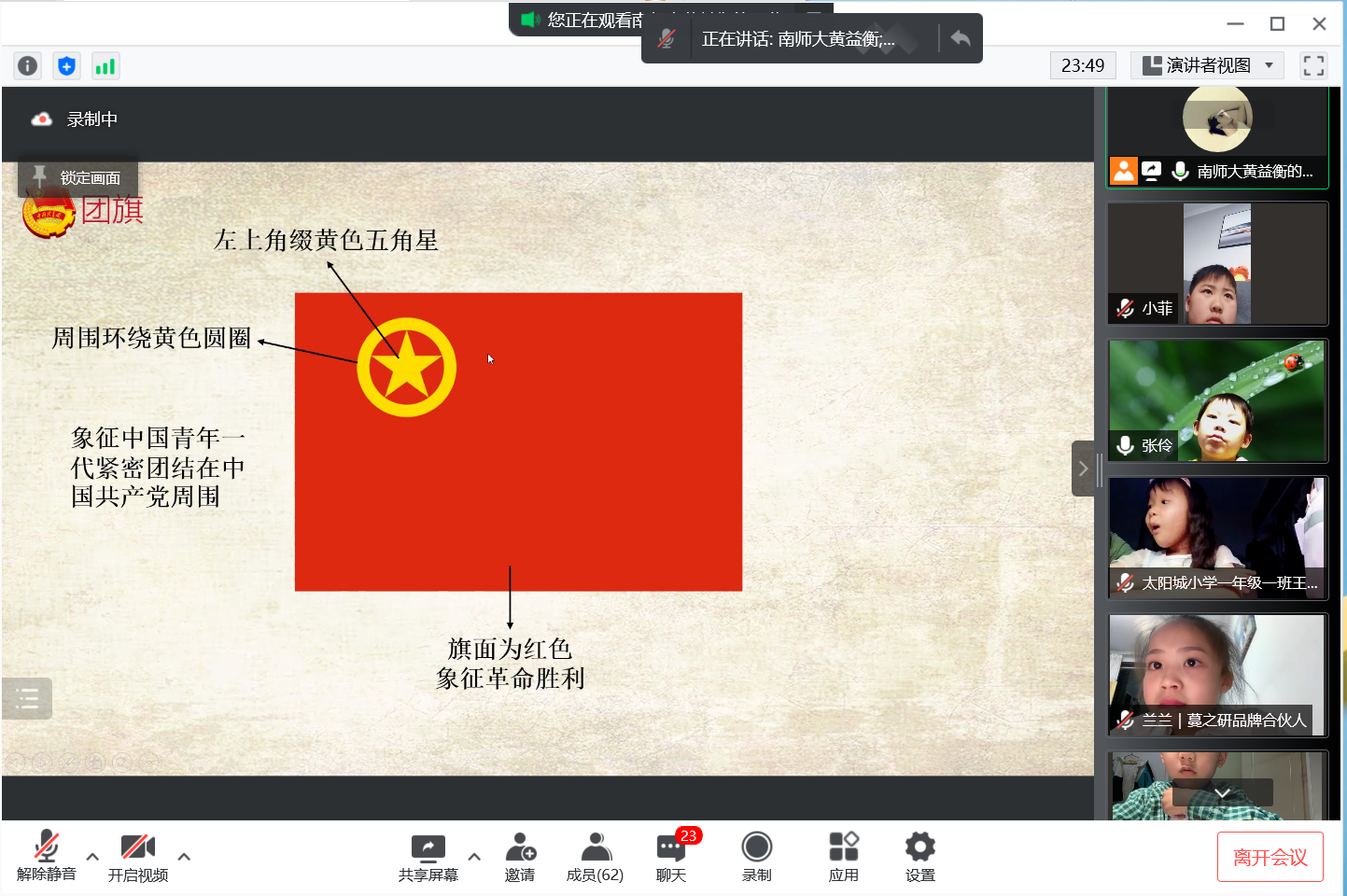 暖风徐徐,春末夏初,5月4日晚7点,来自南京师范大学的黄益衡与南湾营小学的共青团员以及少先队员相约线上,在这一个特殊的日子——青年节,进行了一场主题为“青春之歌,唱响未来”的团史主题讲座。
