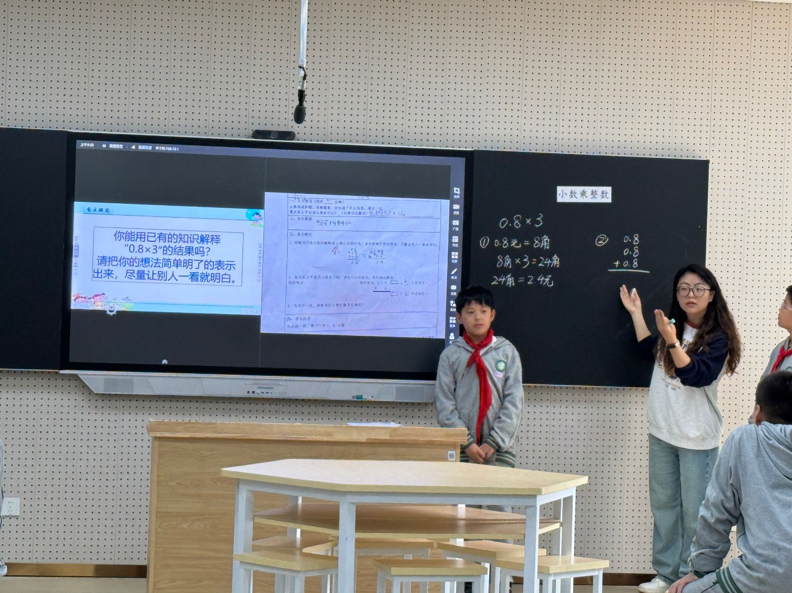 在这节课上,曹老师创设超市购物情境,由两三位数乘两位数的计算回顾整数计算方法。接着学生直接汇报预习成果,列出算式0.8x3,很多孩子知道结果是2.4,所以曹老师由一个问题:你能用以往学过的知识解释这个结果吗?学生接着小组合作,将自己的想法表达出来。通过算法的呈现和优化,转到算理的教学,以及列竖式注意点和小数点的确定方法,最后通过趣味练习,来提高学生的积极性和参与度,提高计算能力。