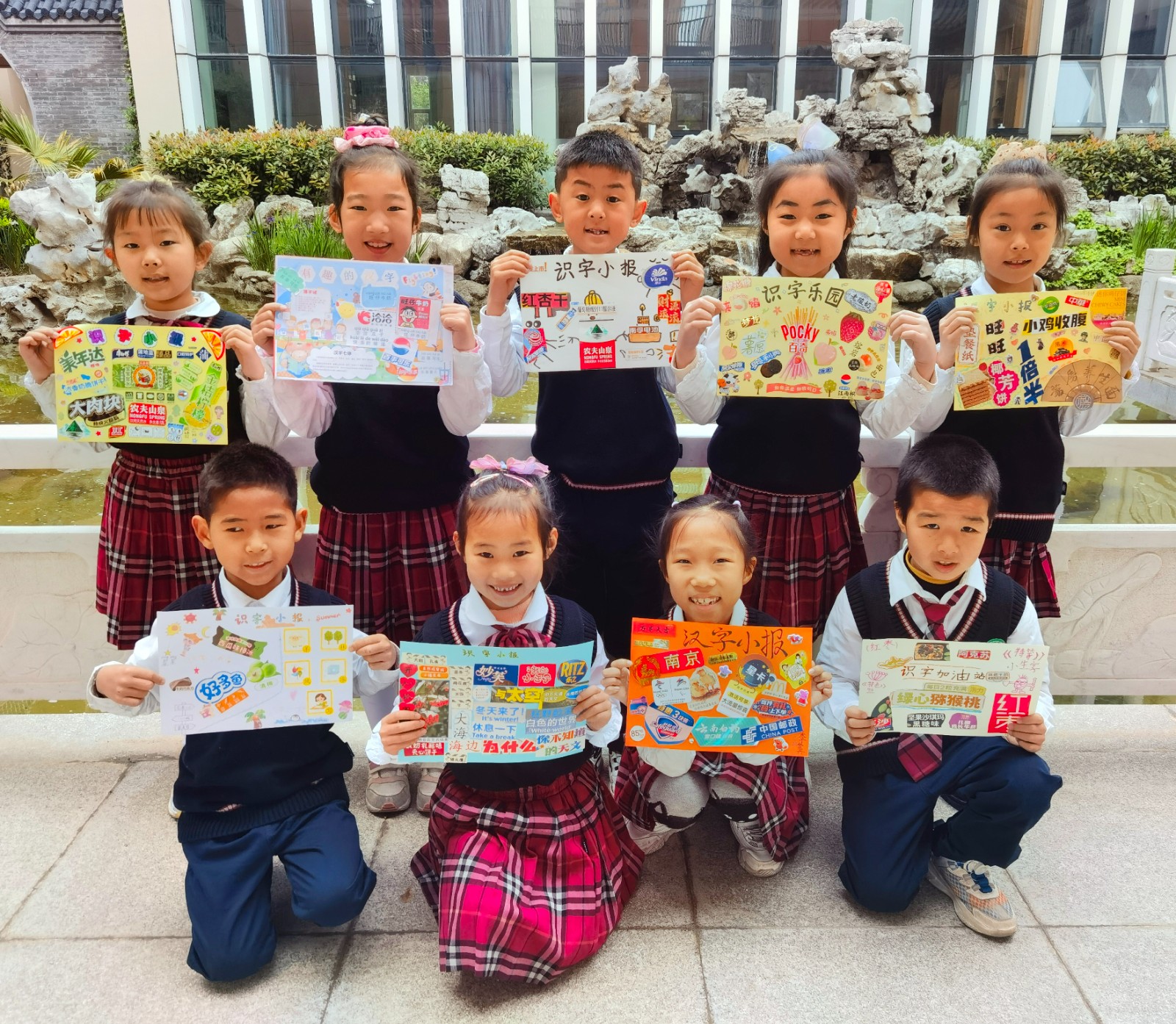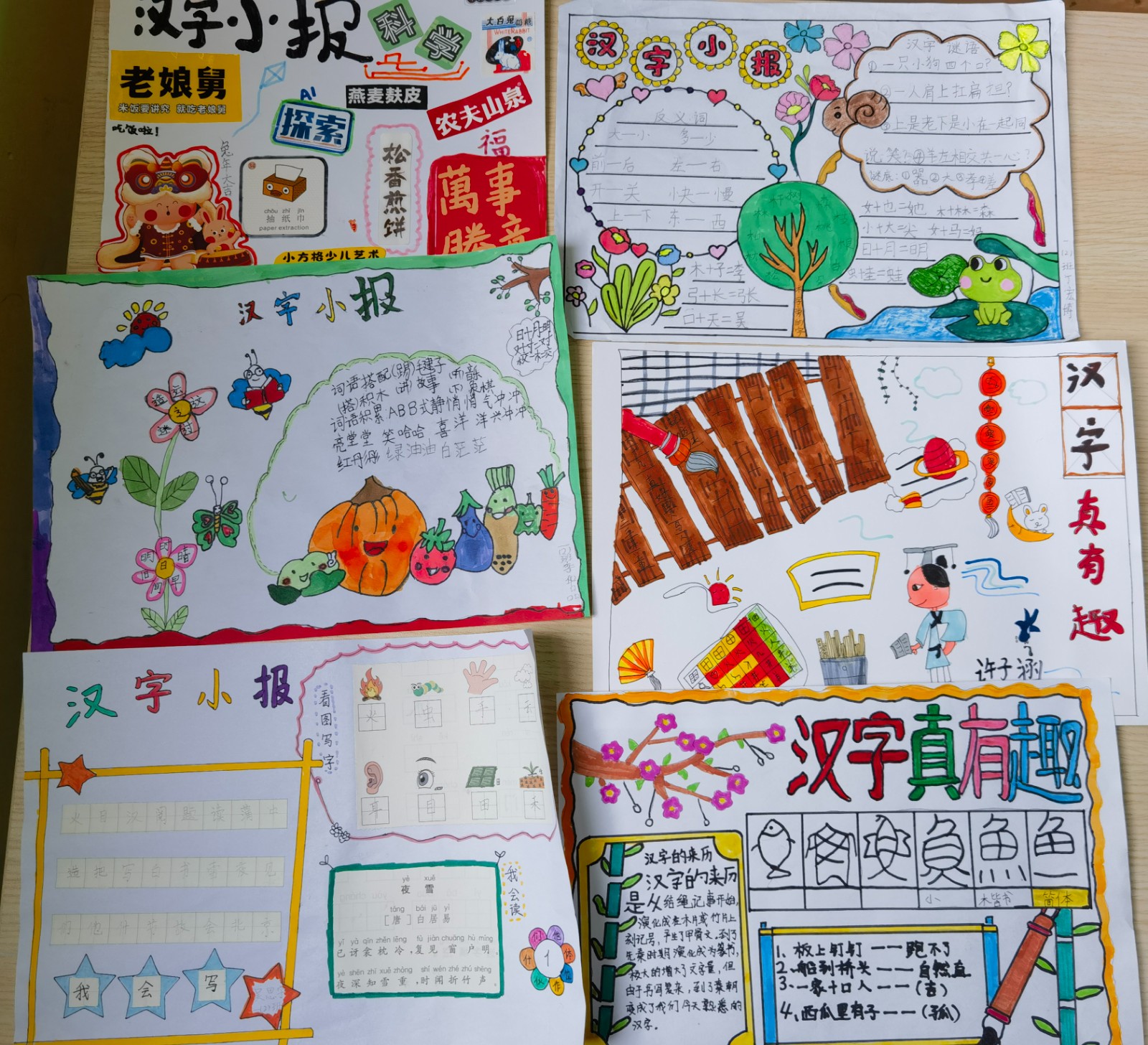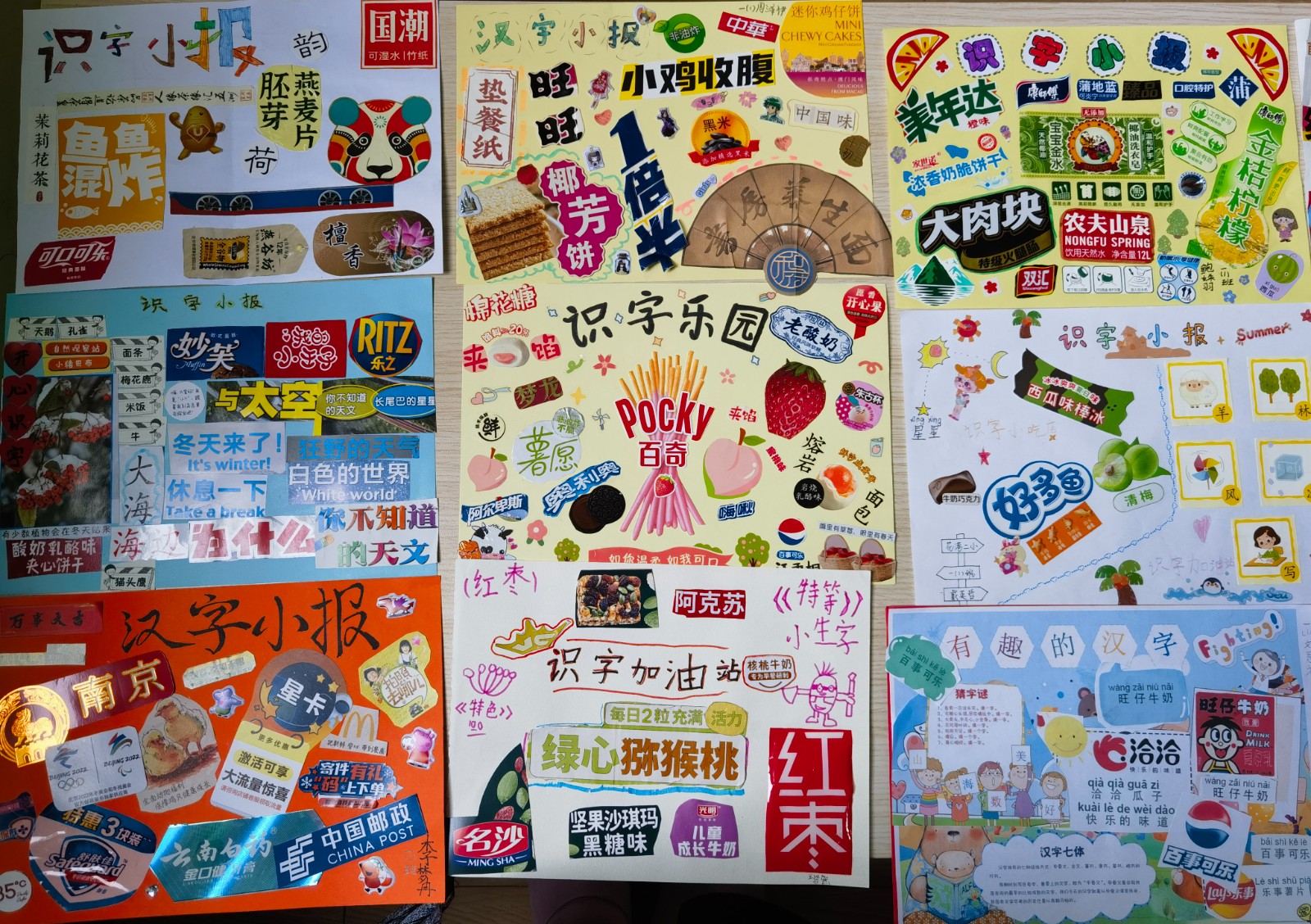 各种各样的商标、商品的名称、食品包装纸、饮料瓶、牙膏盒、说明书,都成了孩子们识字的好材料。多彩的图案,稚嫩的书写,精心的布局,丰富的创意,让孩子们在中国汉字里徜徉,乐在其中!奇思妙想的组合,异彩纷呈的展示,丰富精湛的内涵,碰撞出不一样的火花,彰显了孩子和家长们的智慧。孩子们的一份份汉字小报在家长们的帮助下应运而生,精彩纷呈;多样的识字方式,大大激发了孩子们对于学习汉字的热情。
