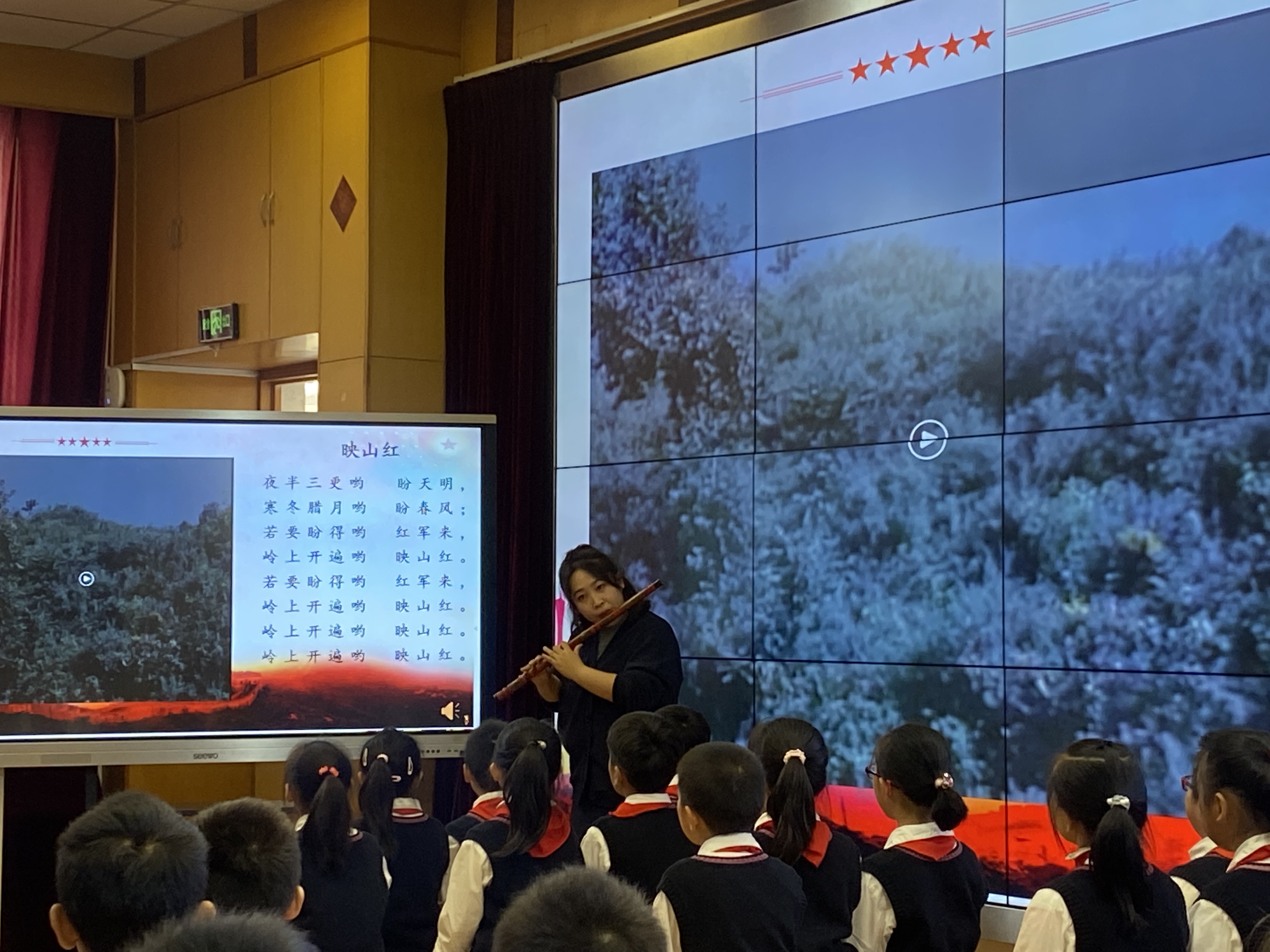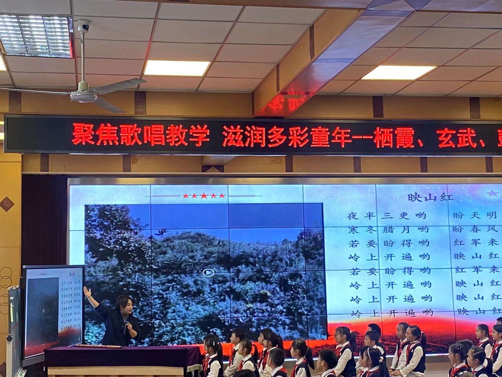 第二节课是马林硕杰老师带来的《儿童团放哨歌》,马老师以电影《闪闪的红星》片段导入,分别聆听两段不同场景下的《映山红》,引导孩子忆苦思甜,最后以《少年先锋队队歌》结尾,孩子们的歌声铿锵有力,满怀对党和祖国的热爱。