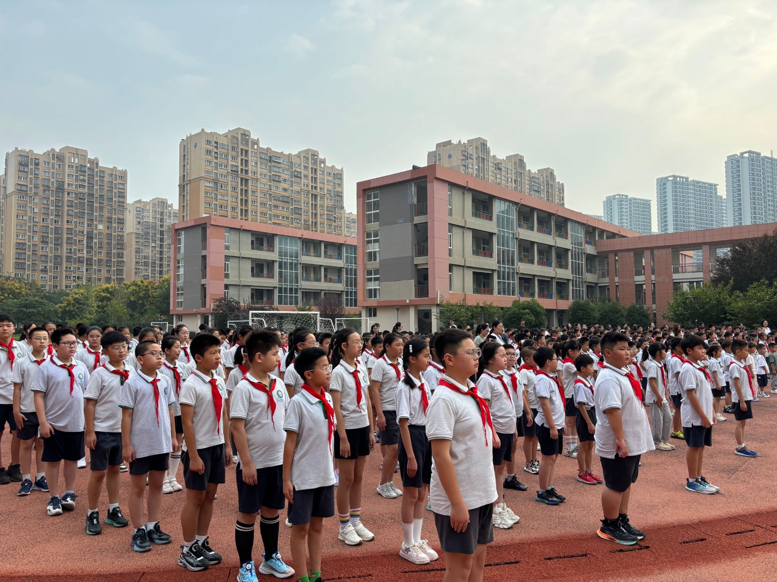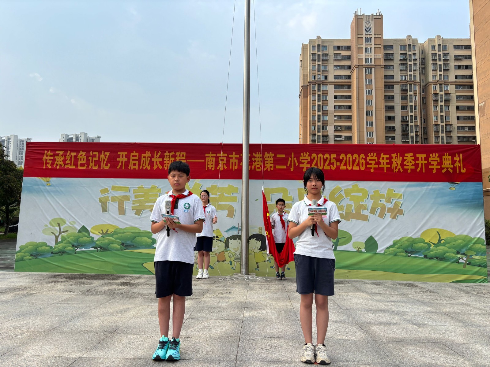 9月8日早上,南京市花港第二小学全体师生在操场举行升旗仪式。本次担任升旗仪式的是六(2)中队。